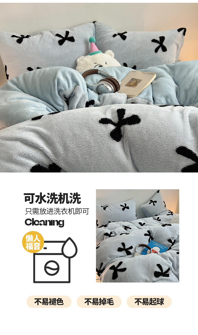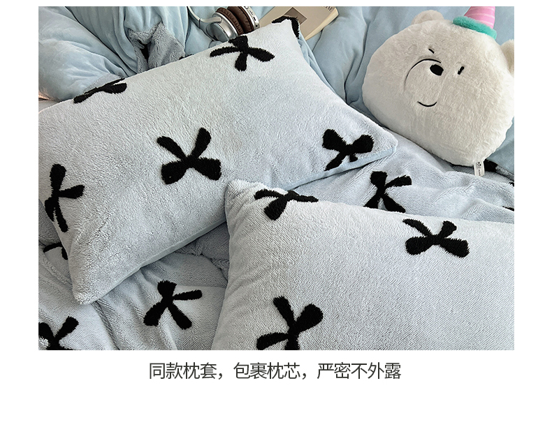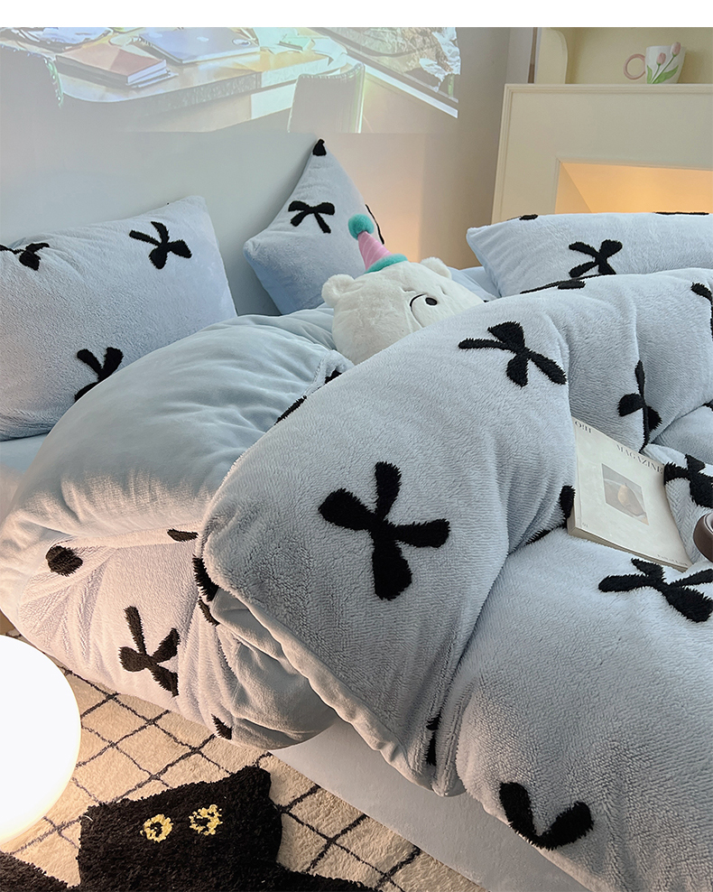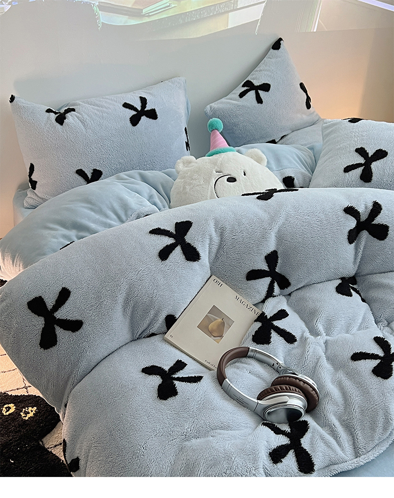 当前位置: 91家纺网 > 商品网购 > 床品套件 > 四件套 > 牛奶绒四件套 > 2024新款A类加厚色纱舒舒绒提花蝴蝶结爱心少女舒棉绒牛奶绒系列四件套 舒棉绒提花-蓝色蝴蝶结