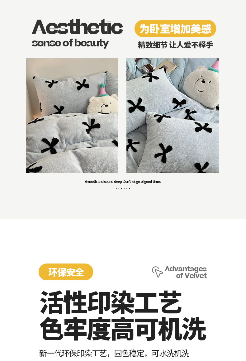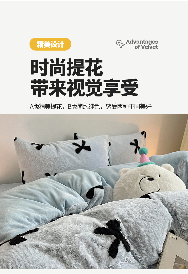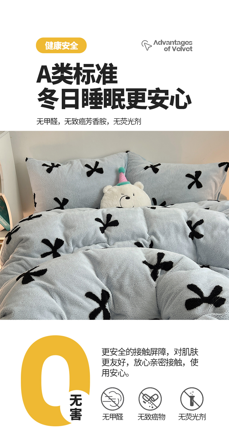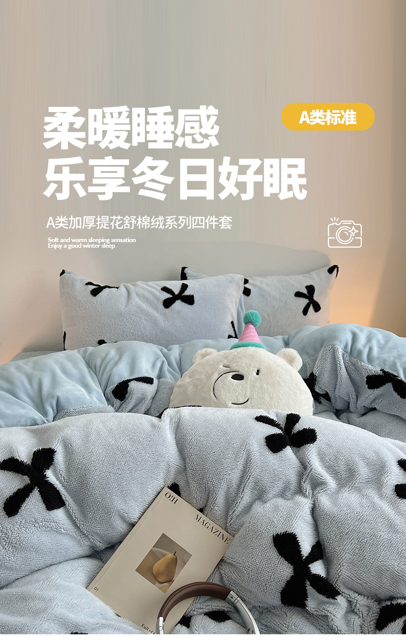 当前位置: 91家纺网 > 商品网购 > 床品套件 > 四件套 > 牛奶绒四件套 > 2024新款A类加厚色纱舒舒绒提花蝴蝶结爱心少女舒棉绒牛奶绒系列四件套 舒棉绒提花-蓝色蝴蝶结