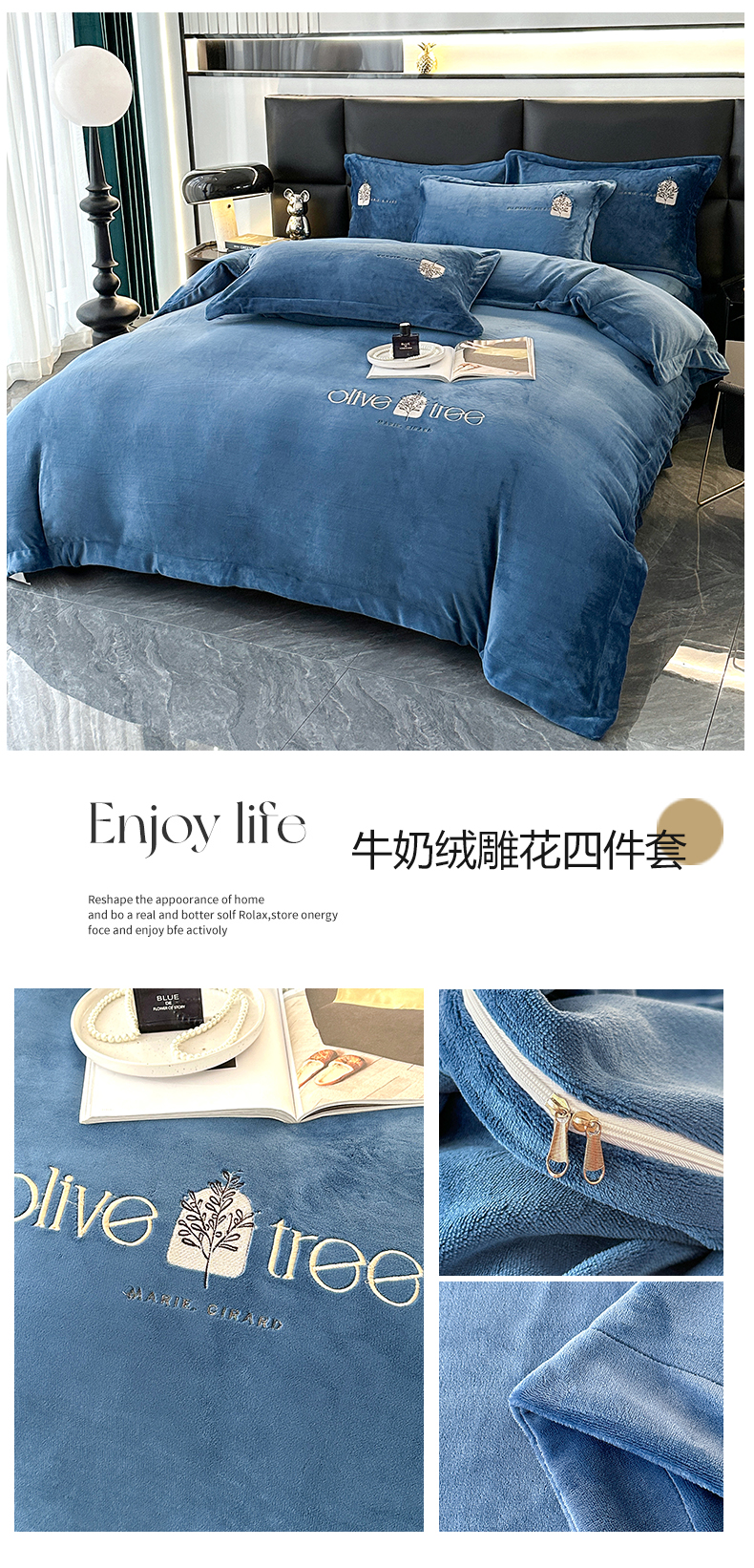 商品名称:橘姿家纺 2024新款高克重九斤牛奶绒绣花四件套 相伴-蓝