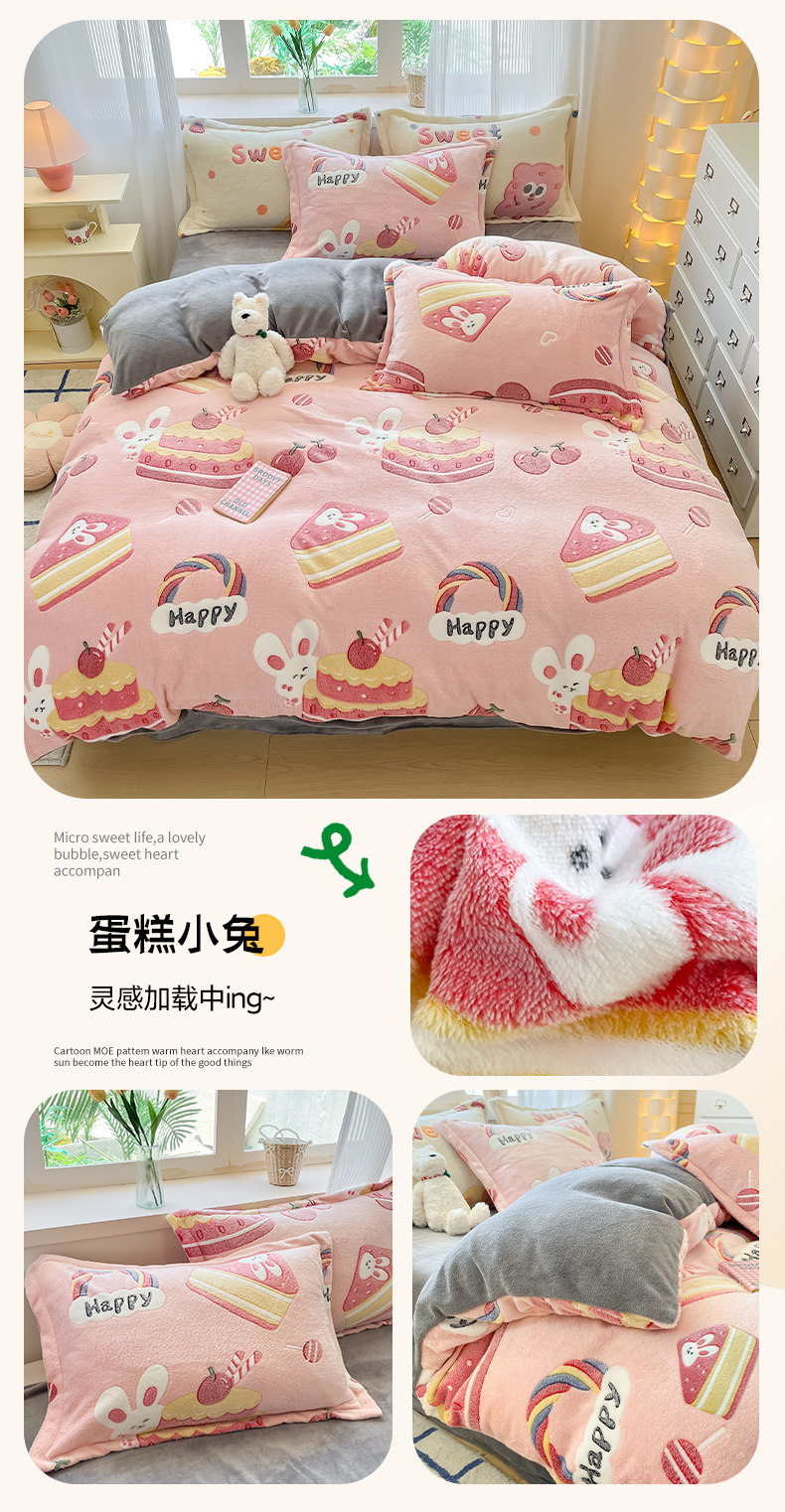 当前位置: 91家纺网 > 商品网购 > 床品套件 > 四件套 > 牛奶绒四件套 > 同田家纺 2024秋冬新品雪花绒牛奶绒印花四件套 蛋糕小兔