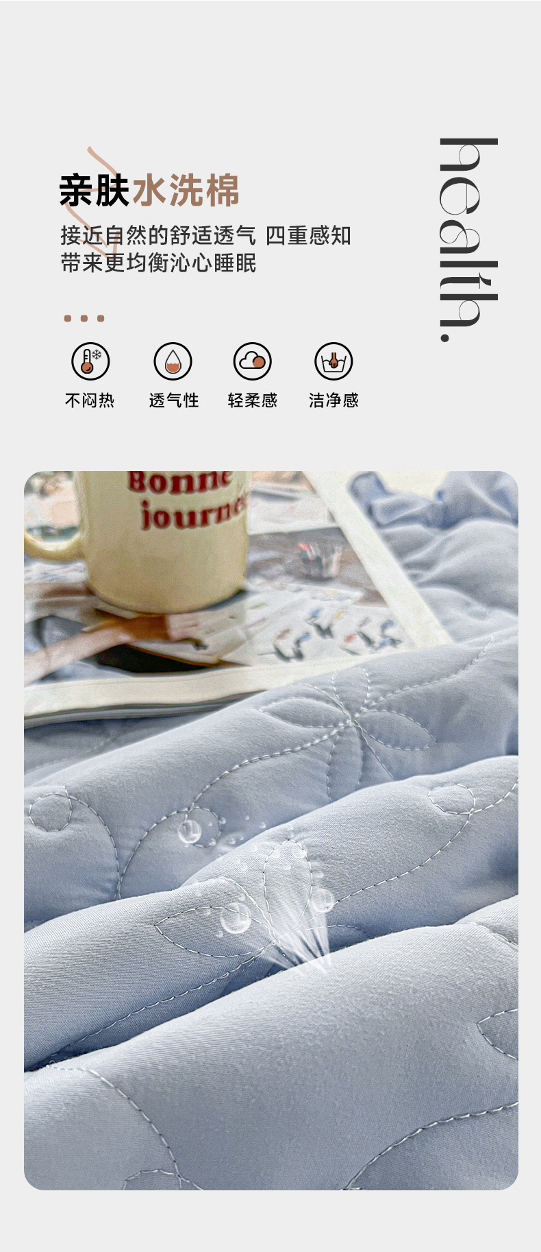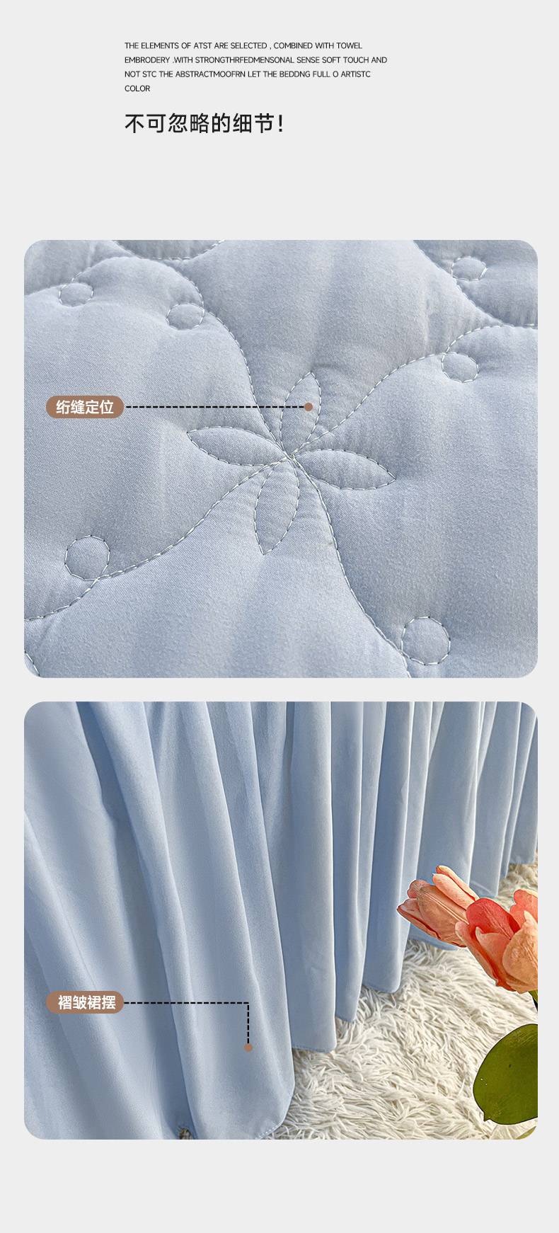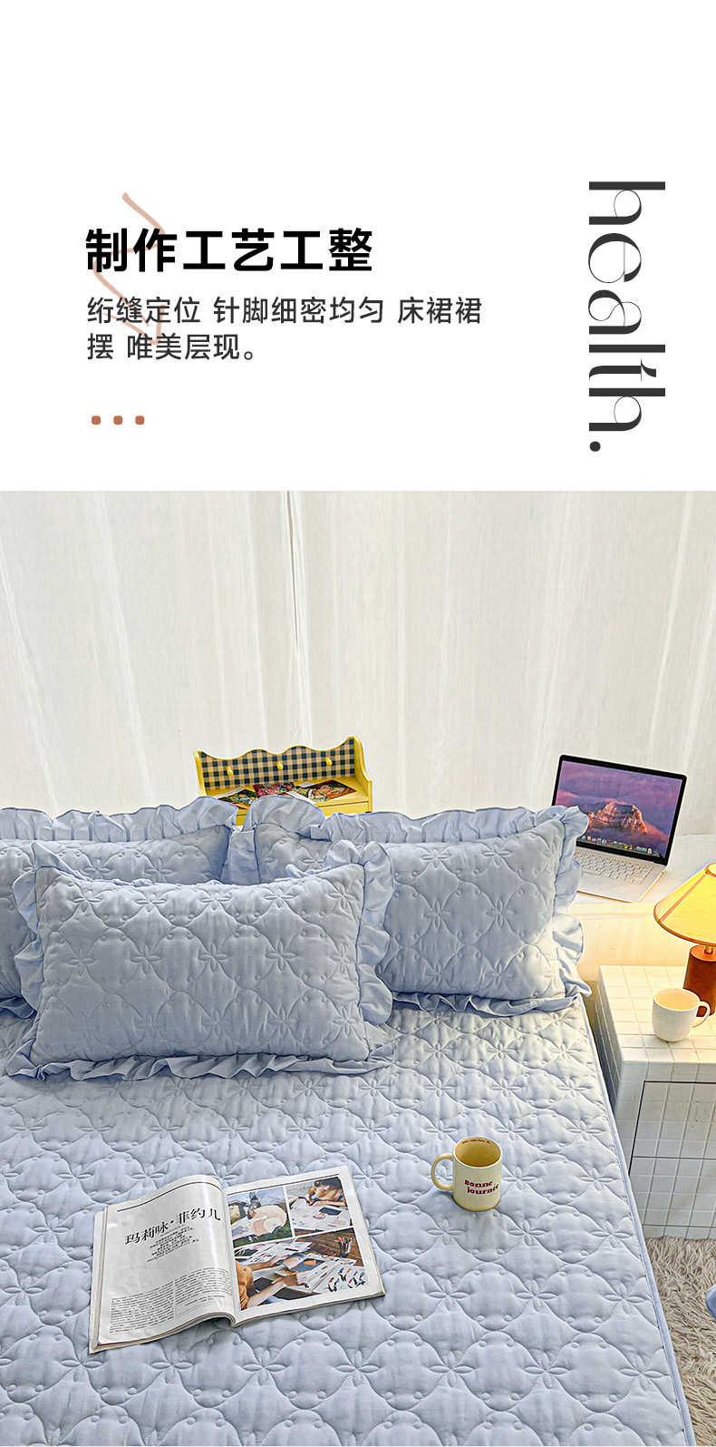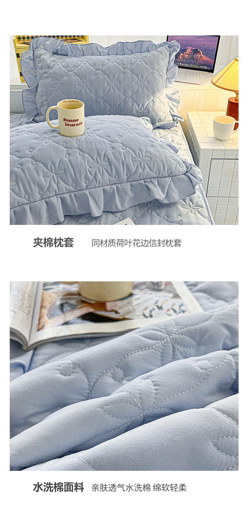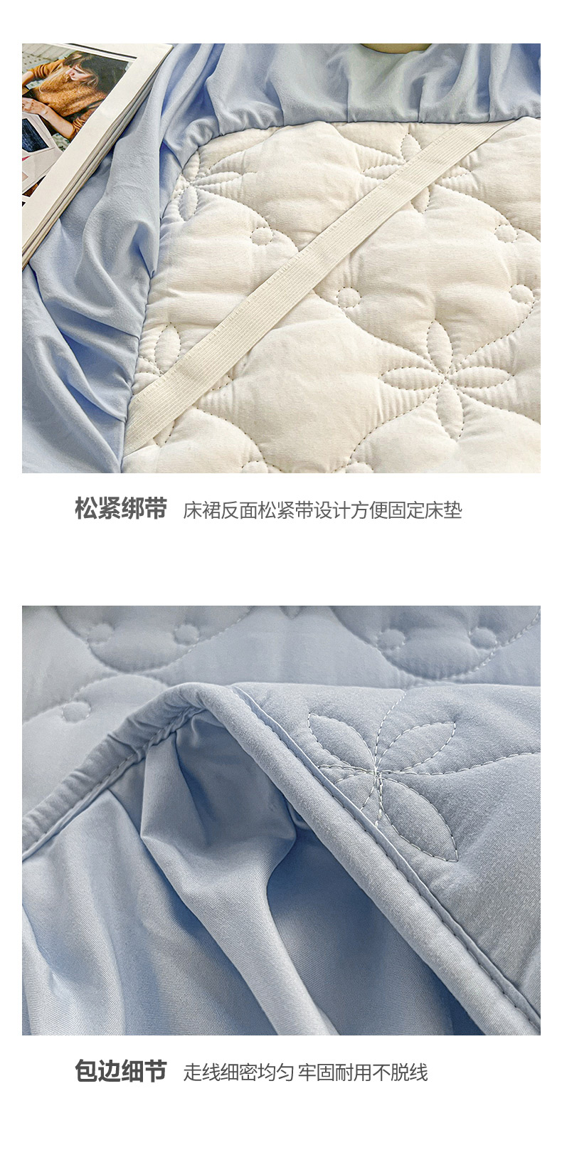 商品名称:予梦家纺 2024新款纯色高克重水洗棉夹棉床裙 曼可-浅蓝