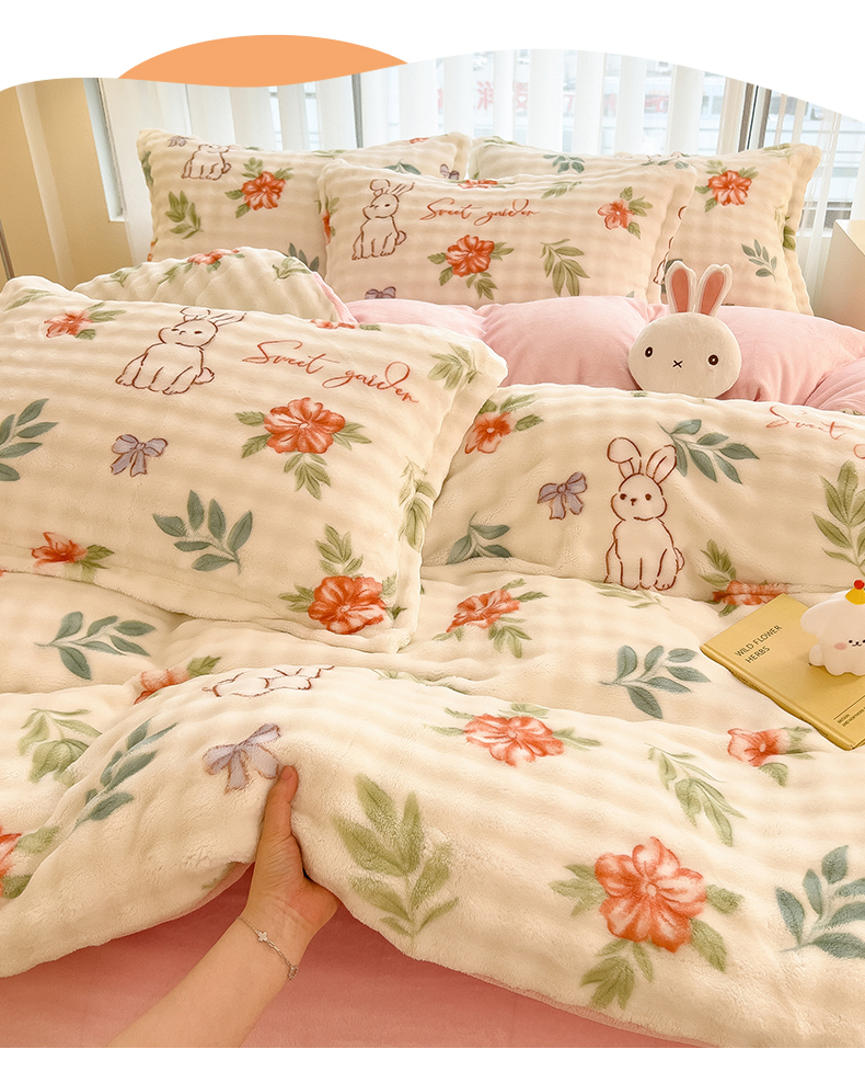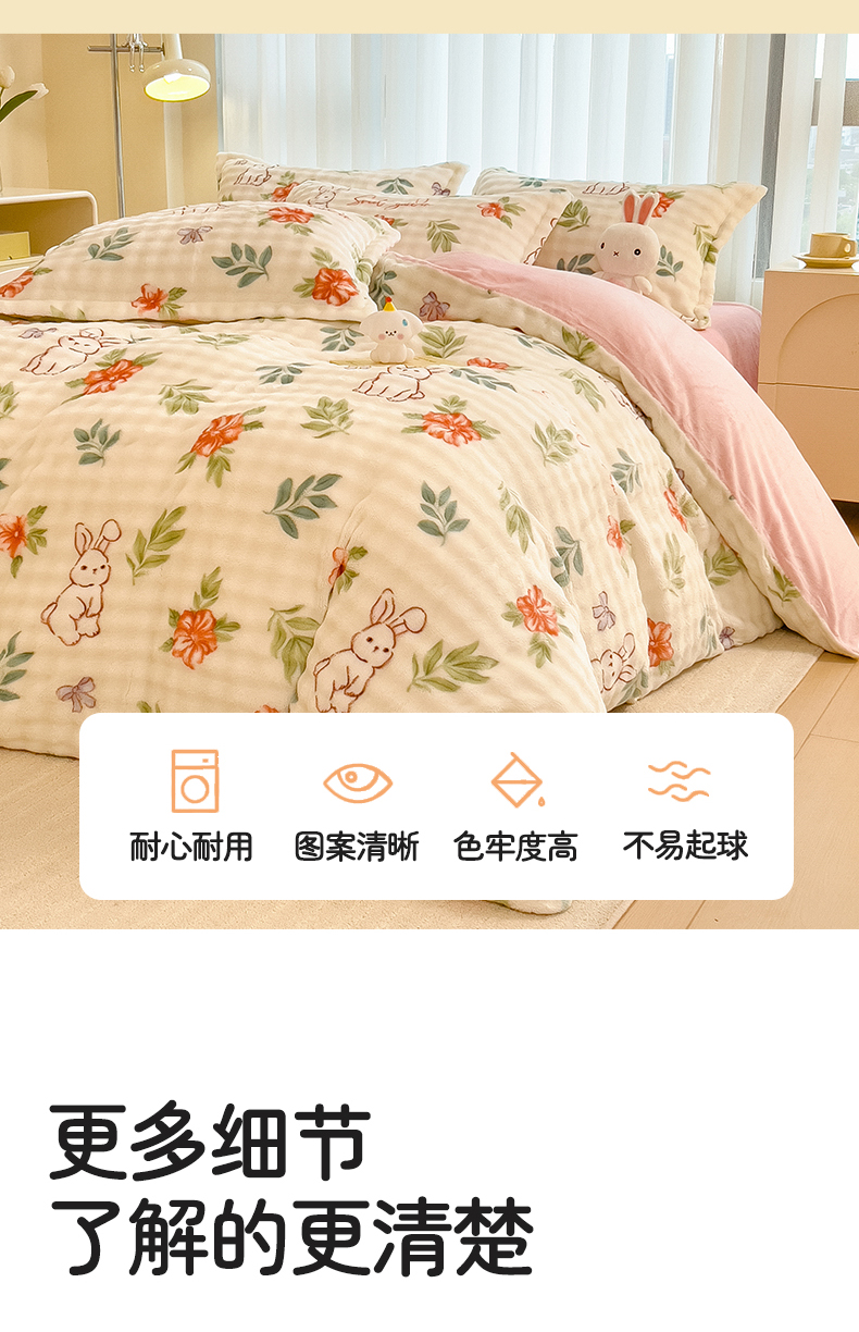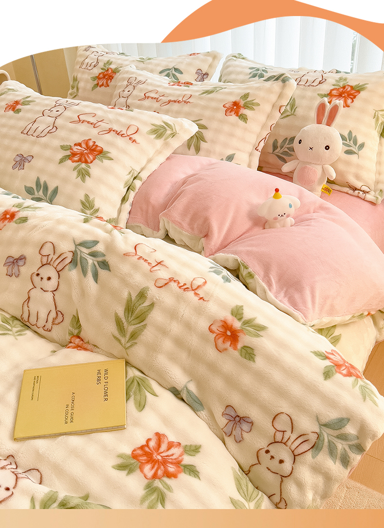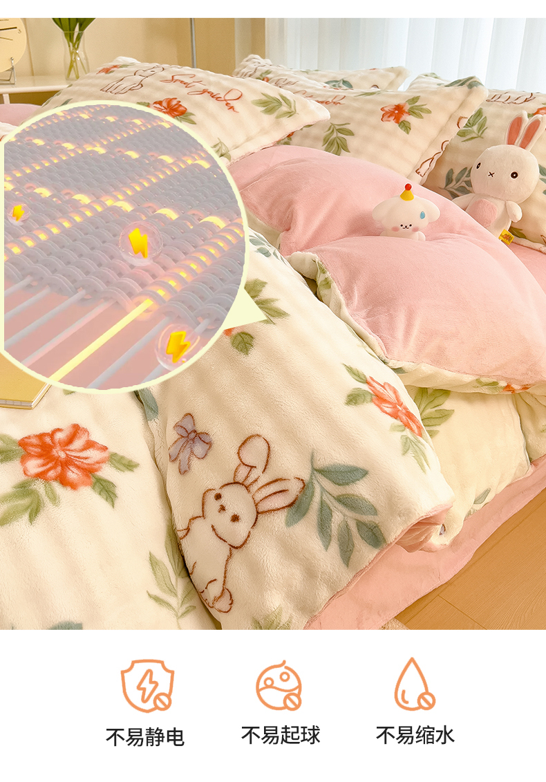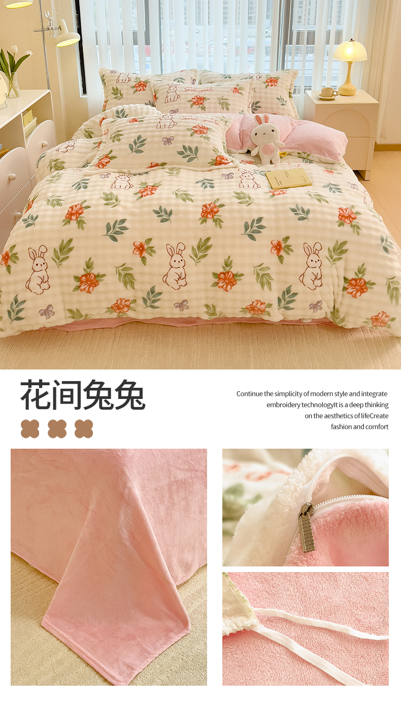 当前位置: 91家纺网 > 商品网购 > 床品套件 > 四件套 > 兔毛绒四件套 > 兄弟坊 2024新款泡泡印花兔毛绒四件套 花间兔兔-1