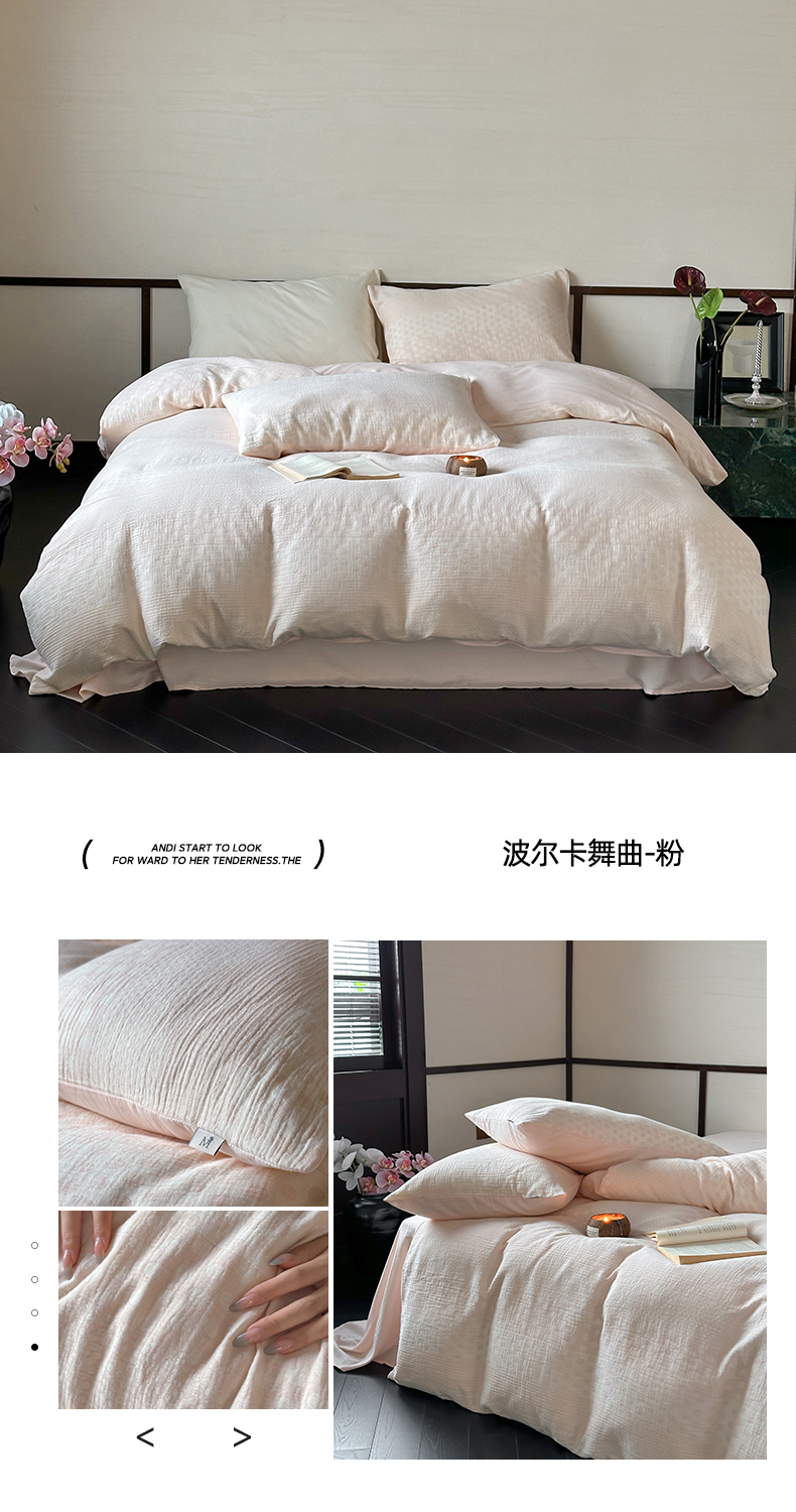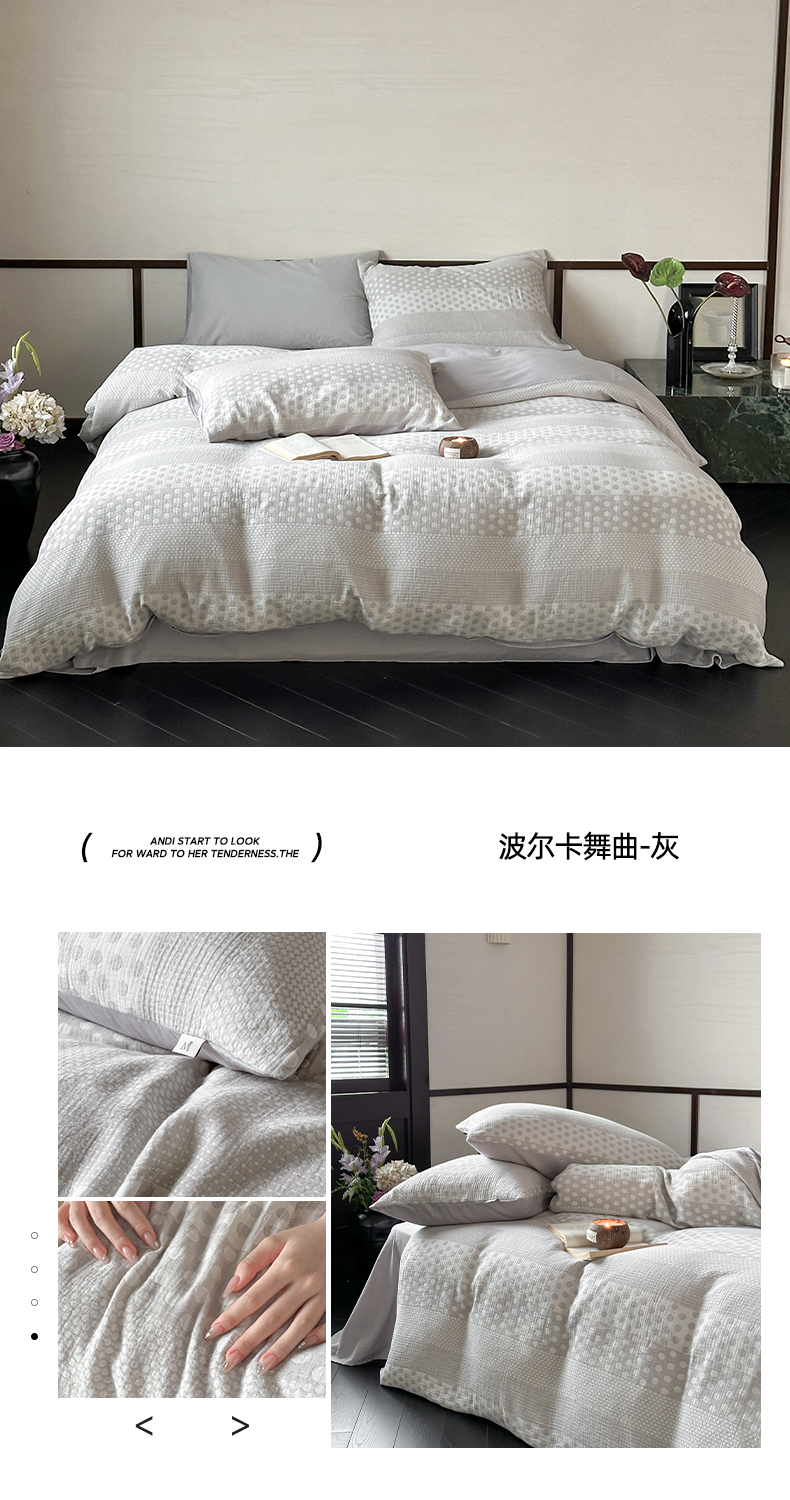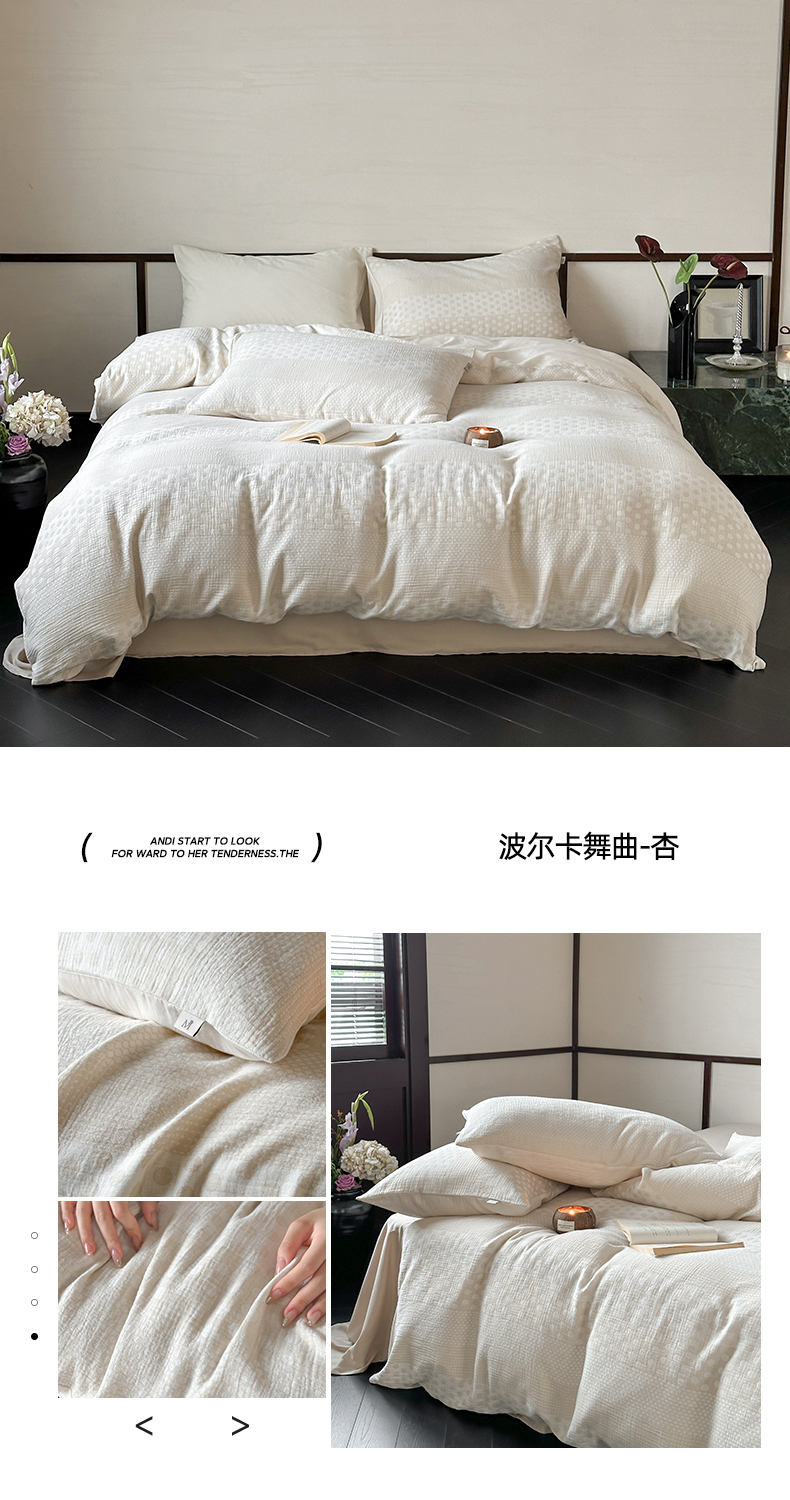当前位置: 91家纺网 > 商品网购 > 床品套件 > 四件套 > 全棉普通四件套 > (总)玛奇朵 2024新品韩国A类色织简约双面波点提花双层皱皱纱-波尔卡舞曲