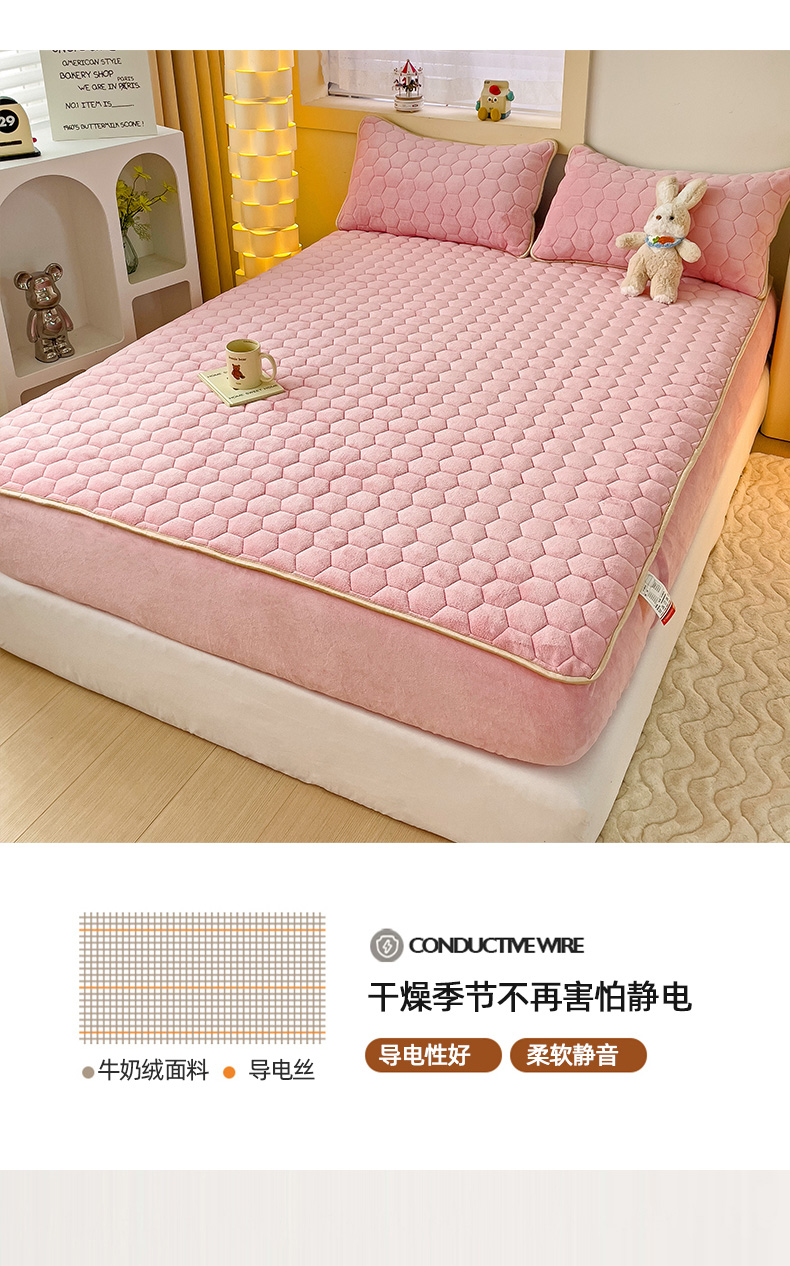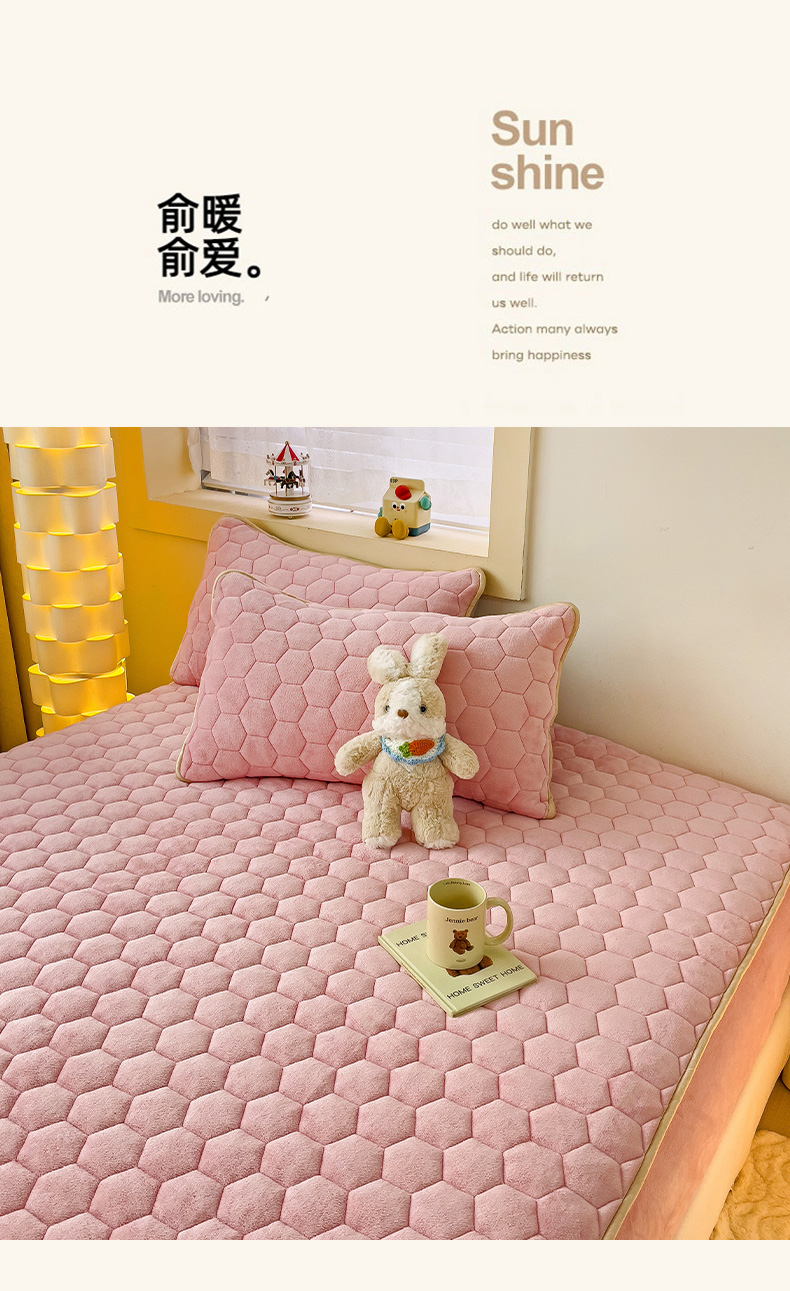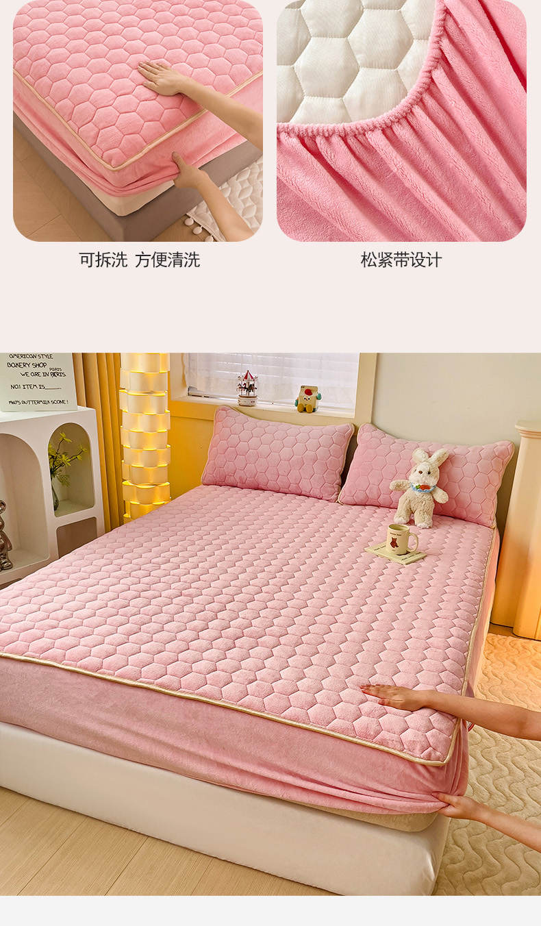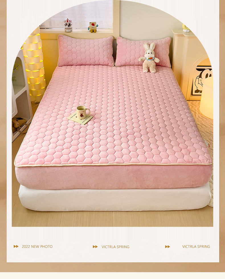 • 91家纺网 家纺一手货源 找家纺 梦舒羽 2025新款牛奶绒夹棉床笠三件套床罩床单床盖护垫套 樱花粉