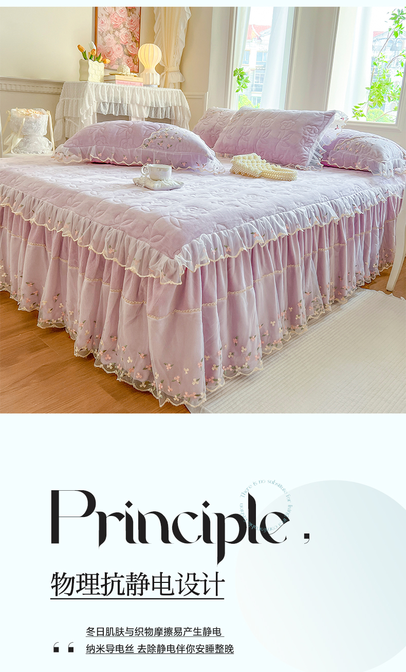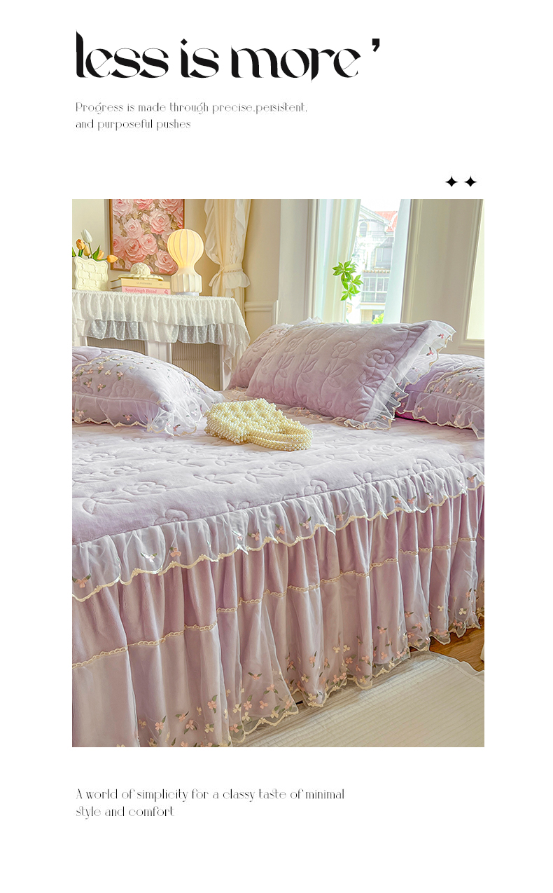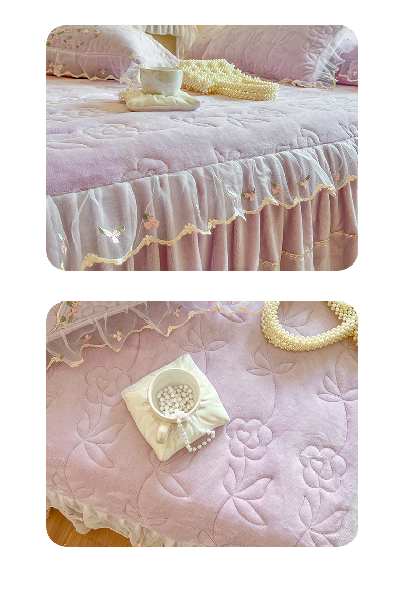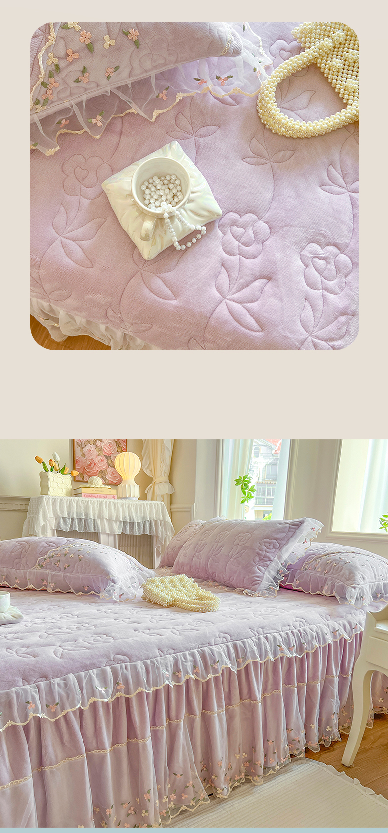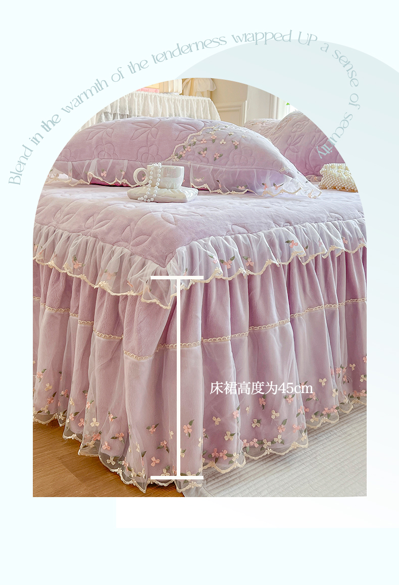 网红馆(ck家纺) 2025新款加厚保暖高克重牛奶绒蕾丝花边床裙款恬星系列床裙三件套 恬星-风信紫