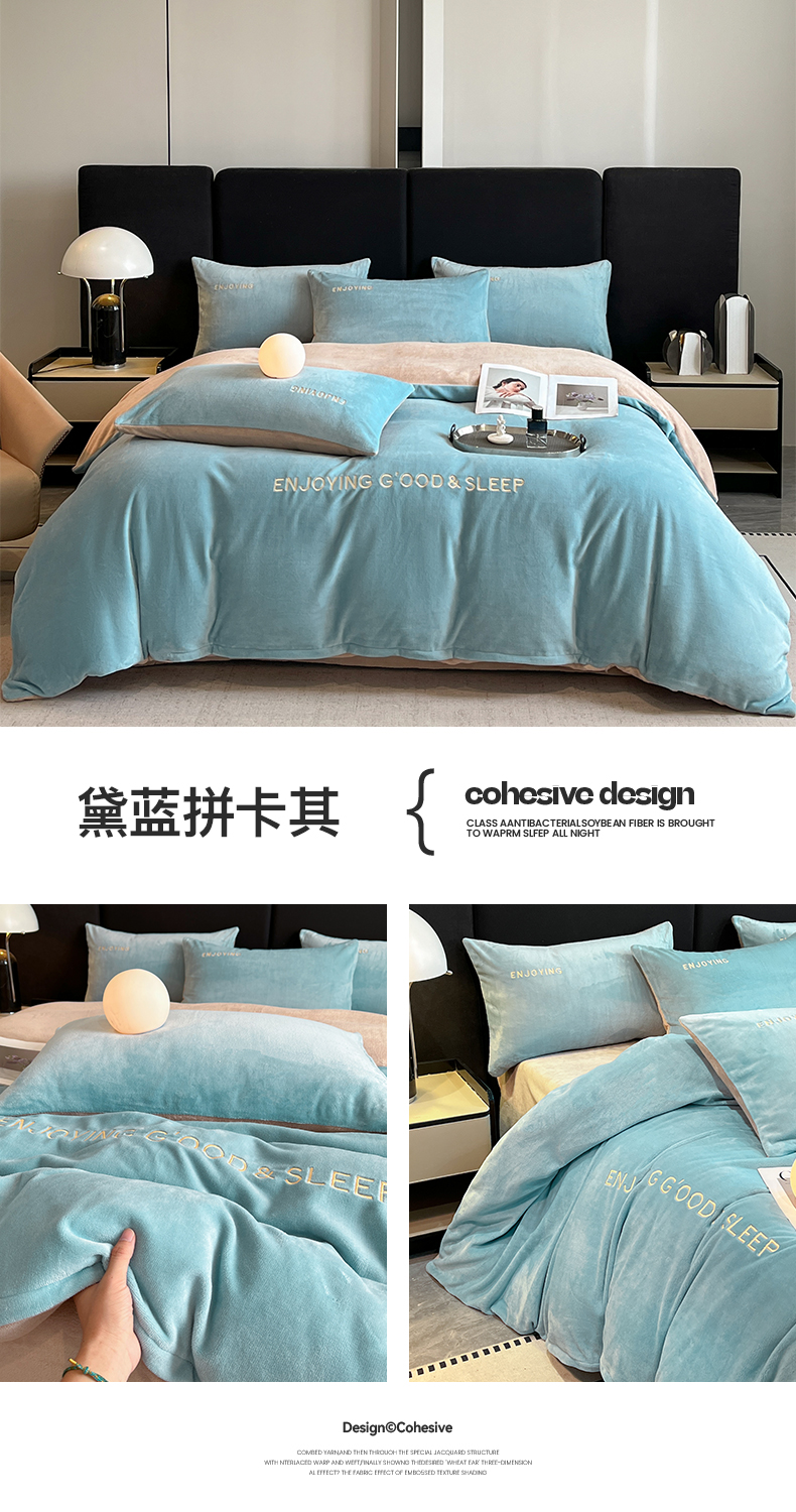 澳梵家居 2024新款牛奶绒刺绣四件套--【山岚系列】 黛蓝拼卡其