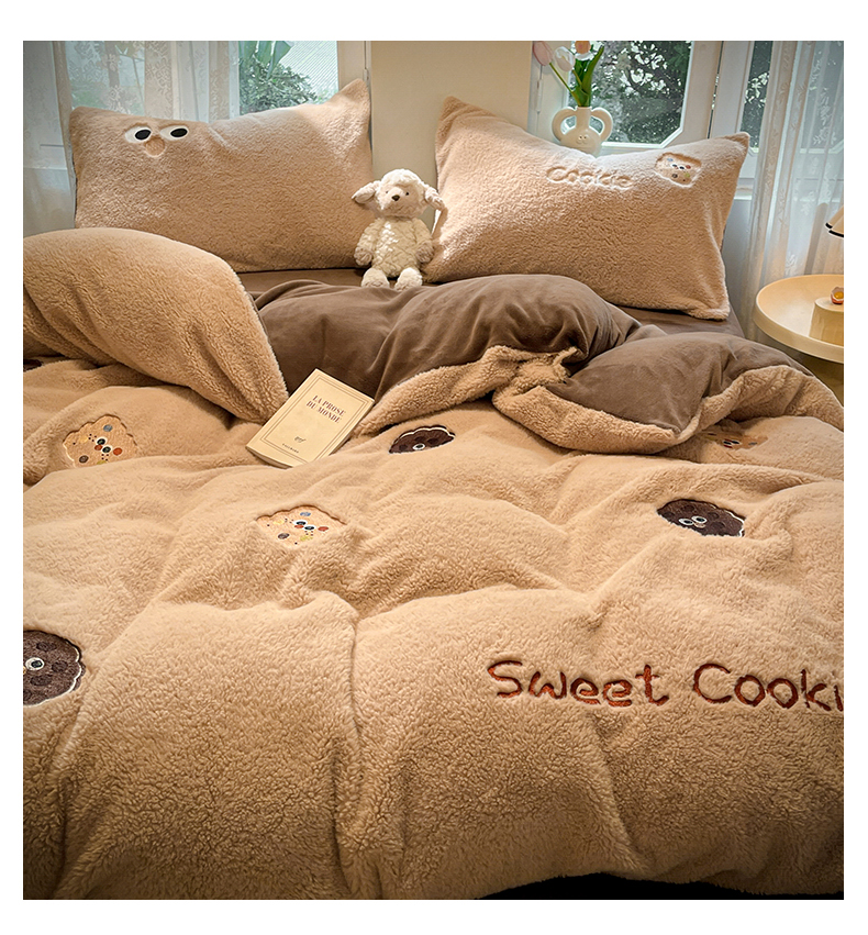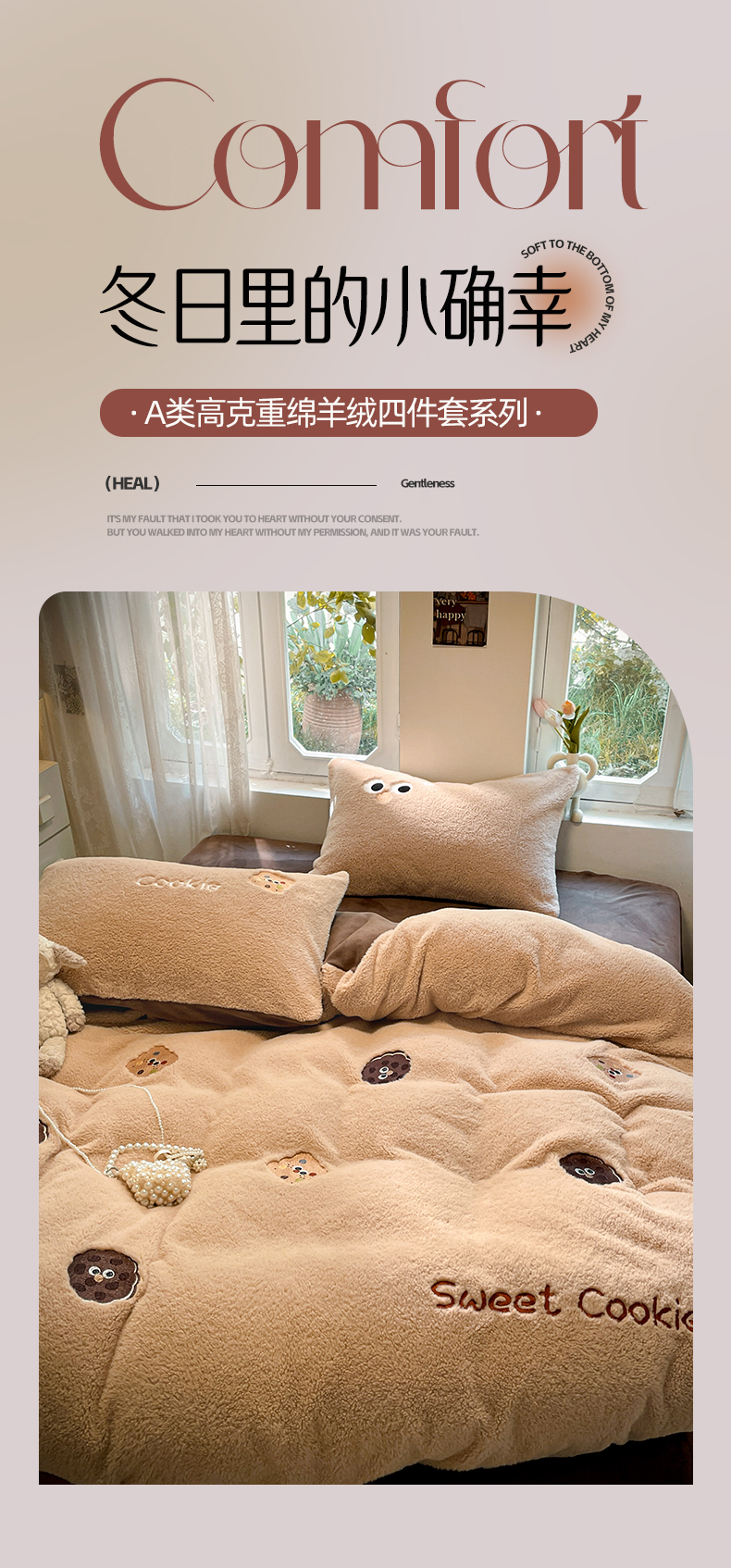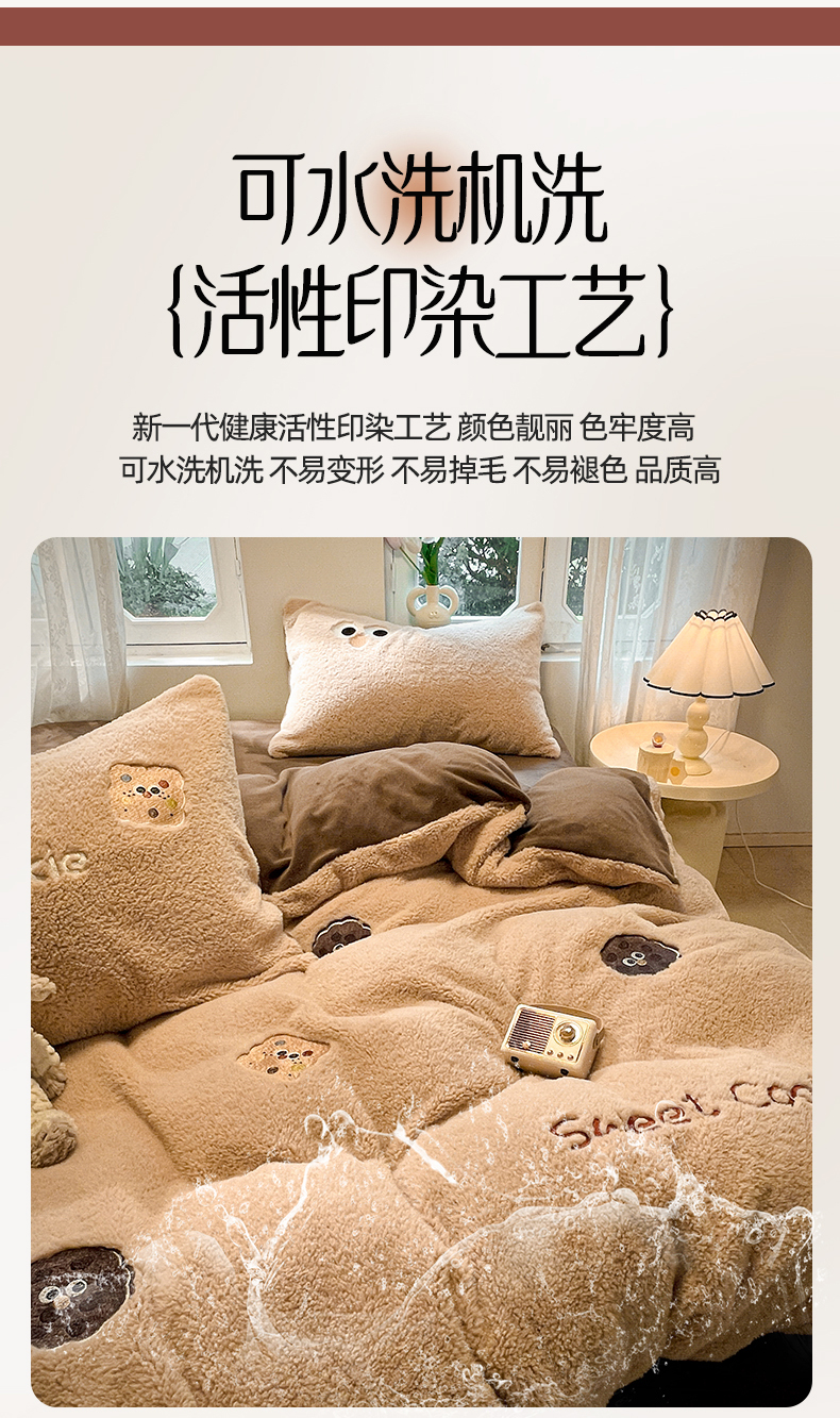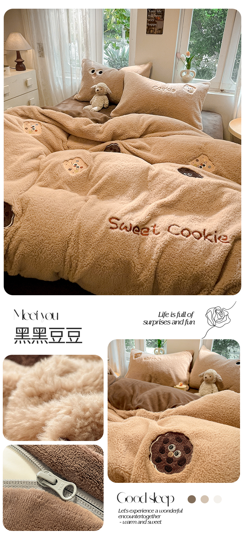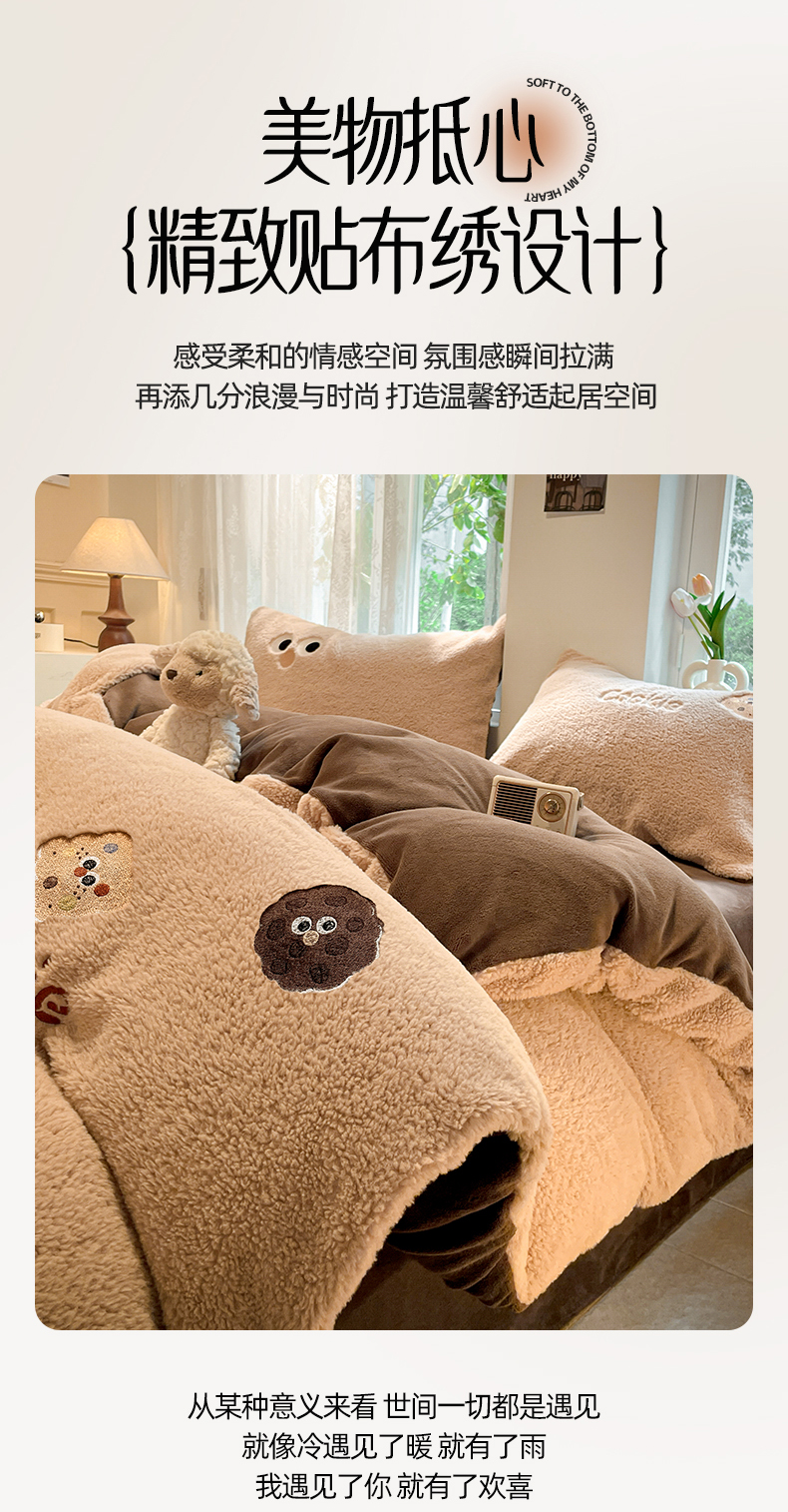 商品名称:满座家居 2025新款绵羊绒牛奶绒绣花小清新四件套 黑黑豆豆