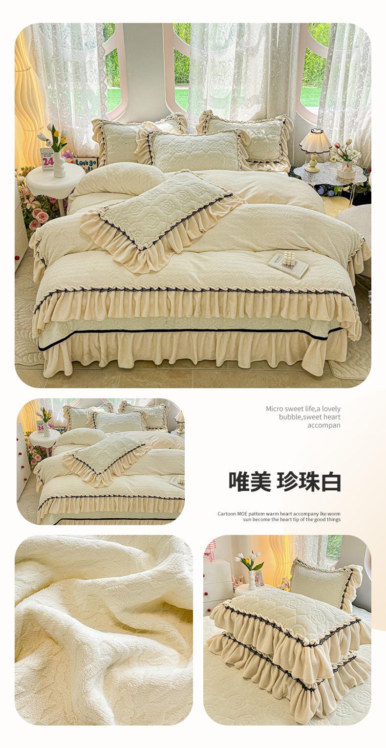 当前位置: 91家纺网 > 商品网购 > 床品套件 > 四件套 > 牛奶绒四件套 > 铠畅家纺 2025新款牛奶绒花边床盖四件套-唯美 唯美珍珠白