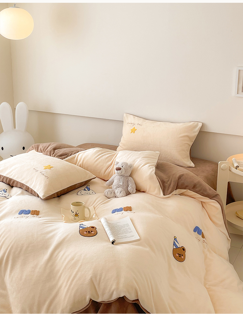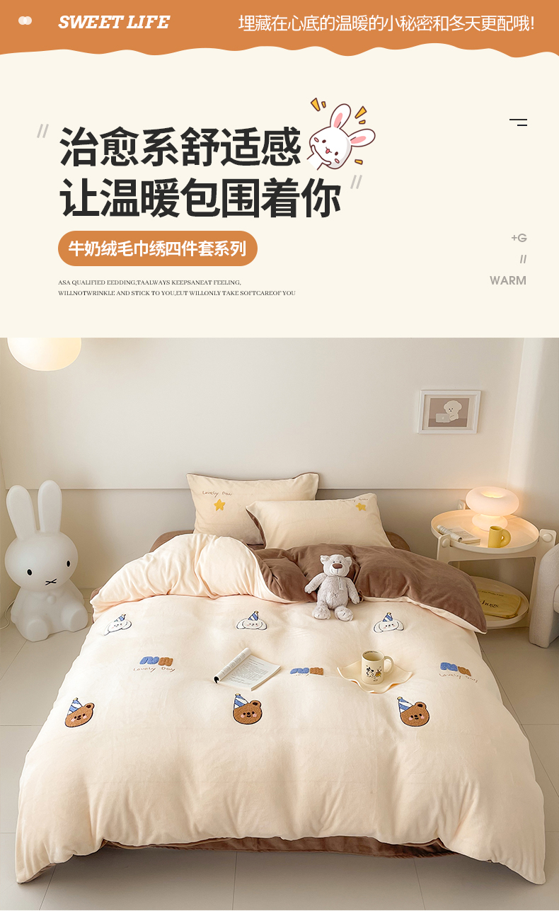 商品名称:沐棉 2024新款纯色牛奶绒毛巾绣款四件套 开心派对-咖