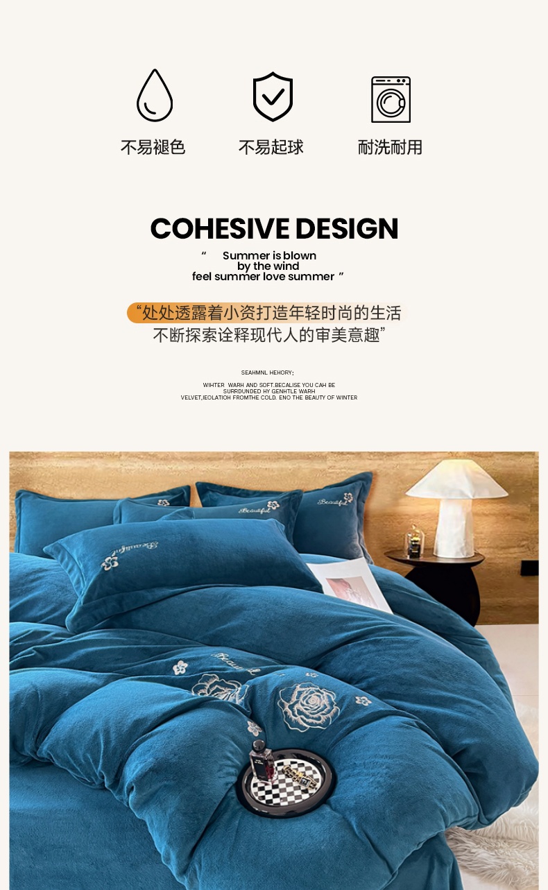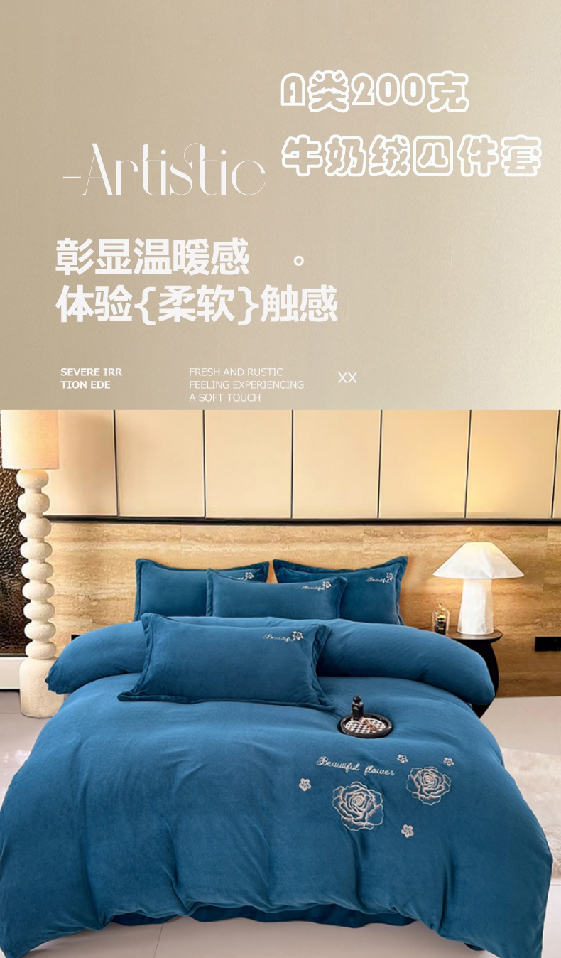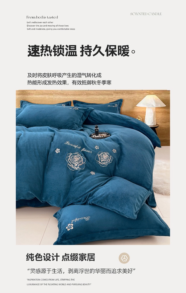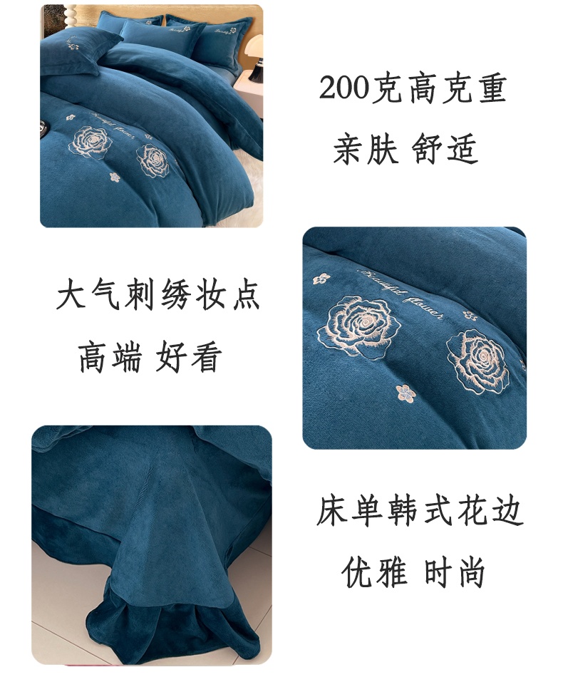 商品名称:梦舒羽 2025新款200克刺绣牛奶绒四件套珊瑚绒雪花绒床单款套件 玫瑰花园-蓝