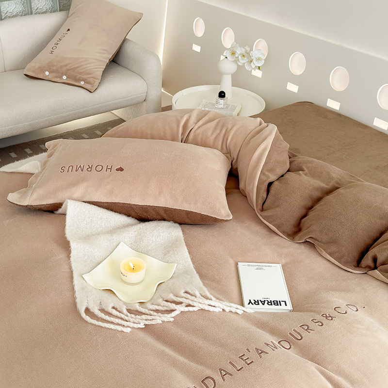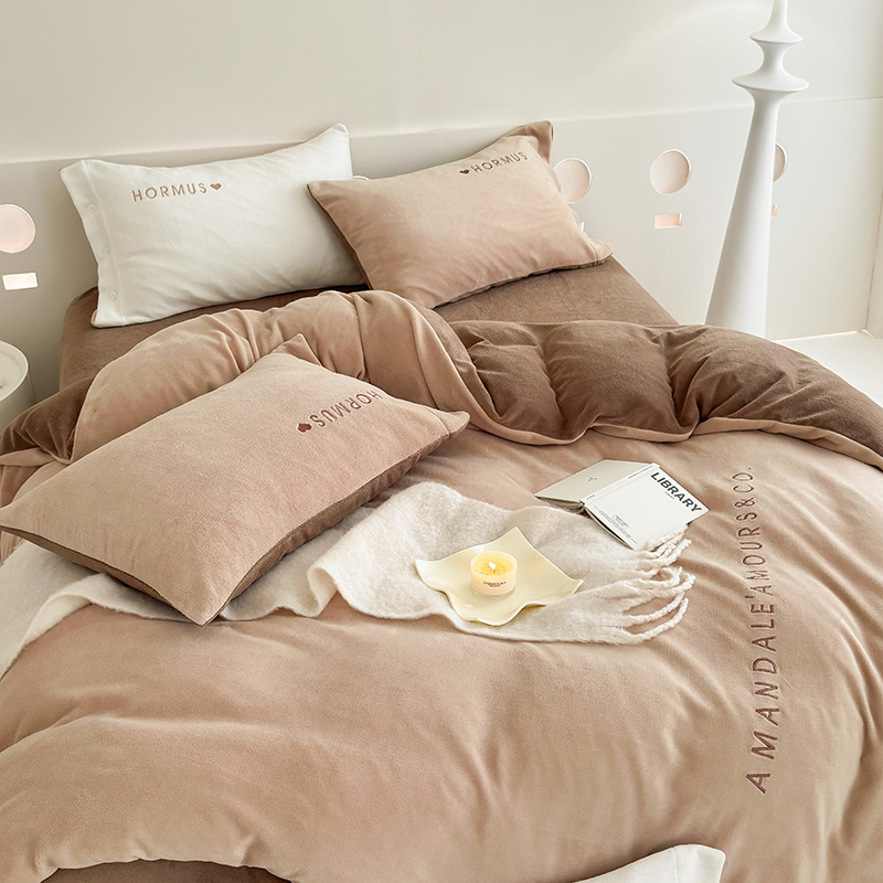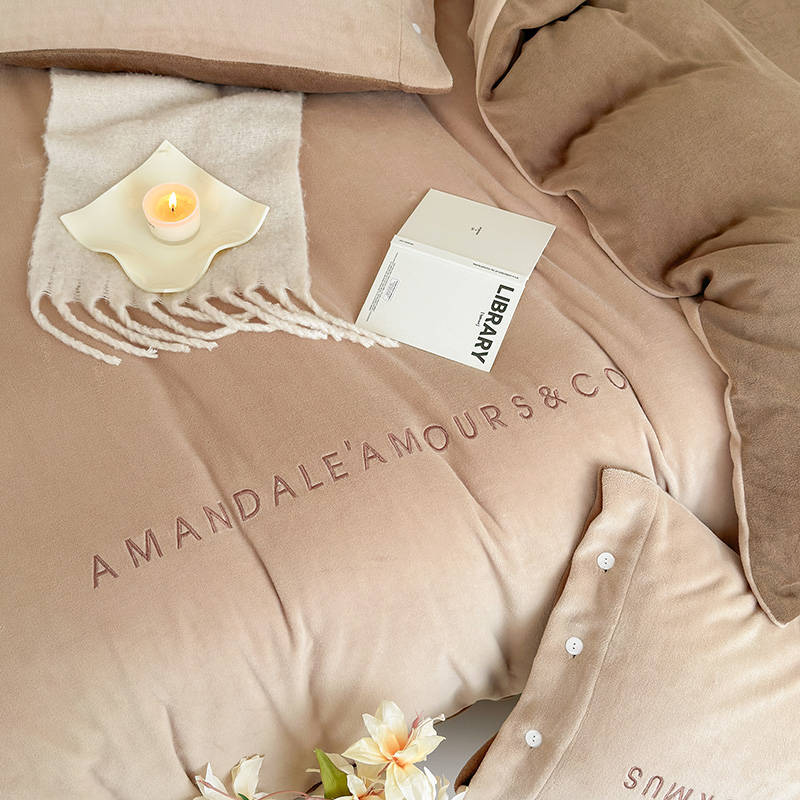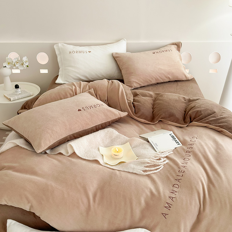 潘朵拉家纺 2024新款字母绣花纯色系列牛奶绒四件套 穆斯 曲奇咖