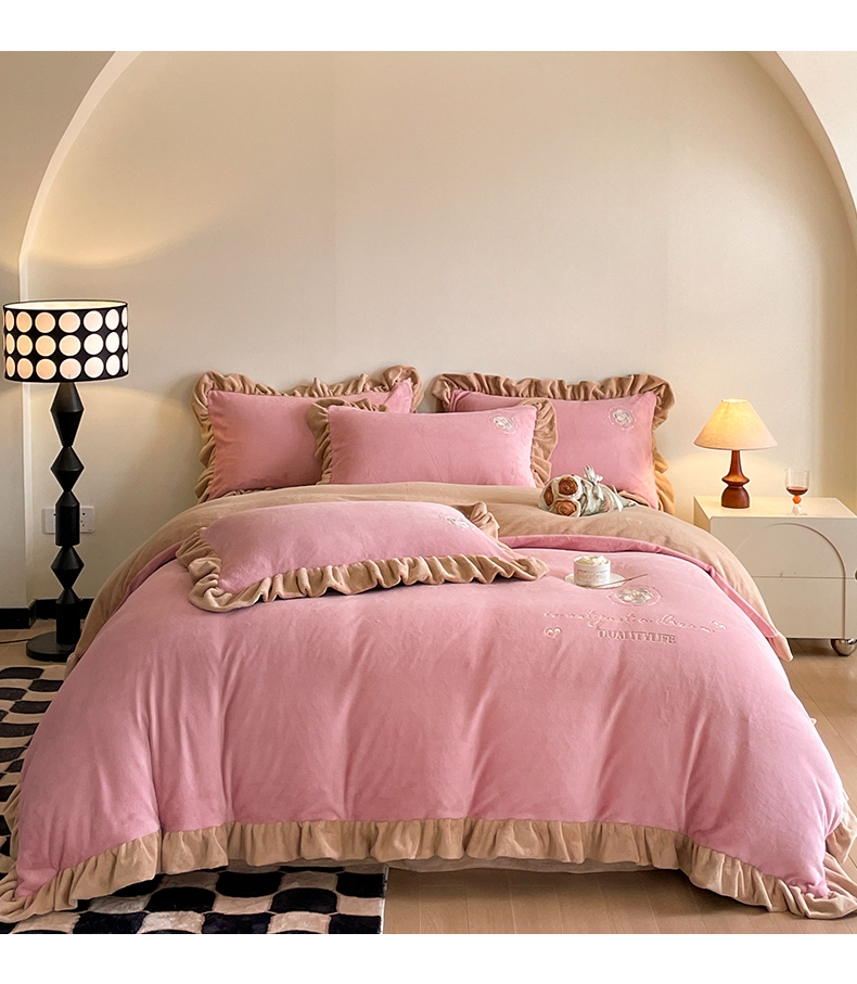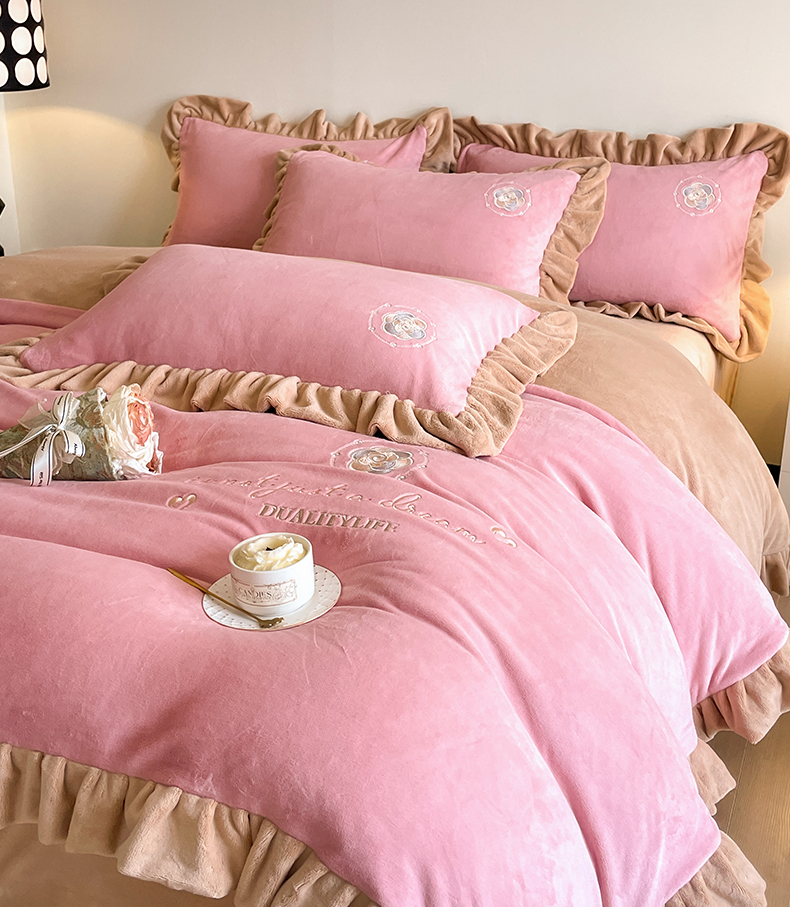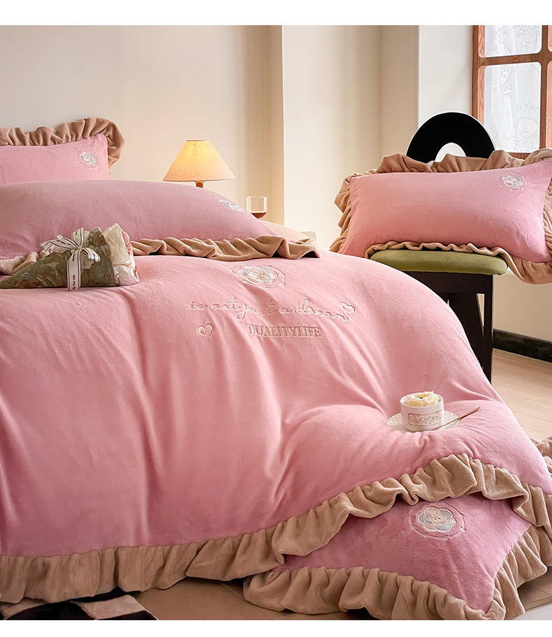 露梦家纺 2025新款A类双面木耳花边加厚保暖牛奶绒刺绣款四件套-繁花系列(提供买家秀) 繁花-梅子粉