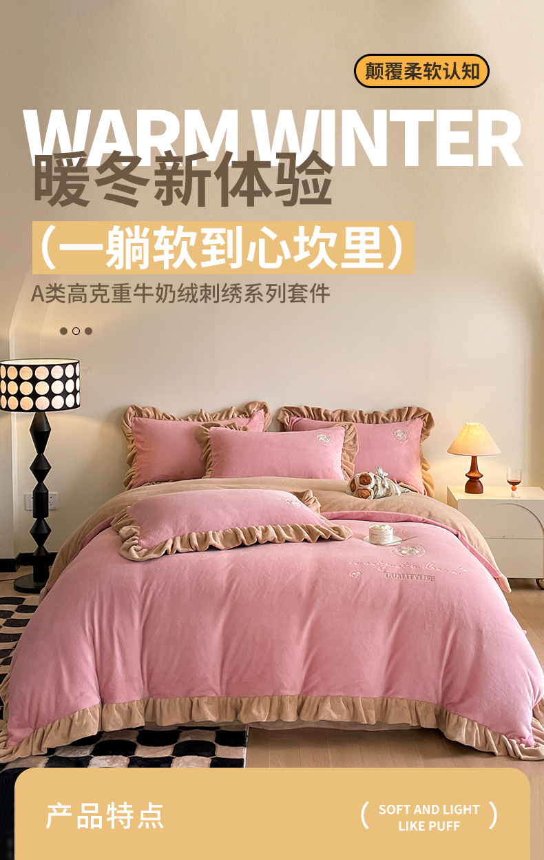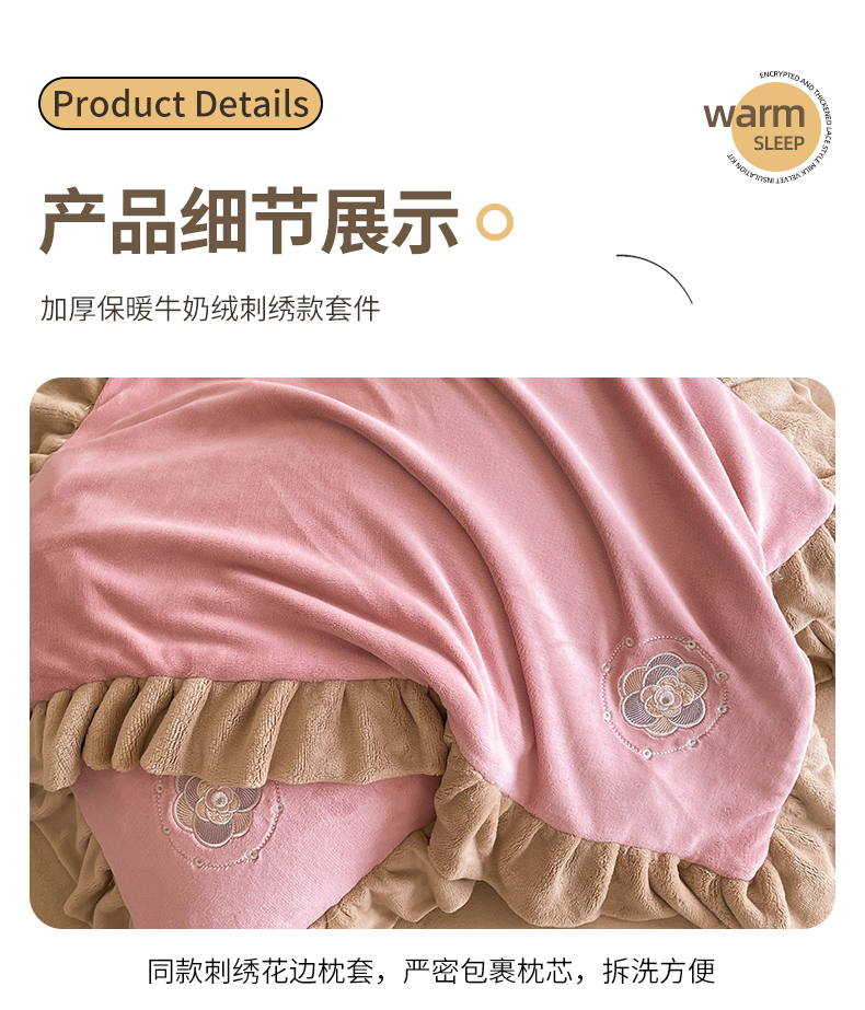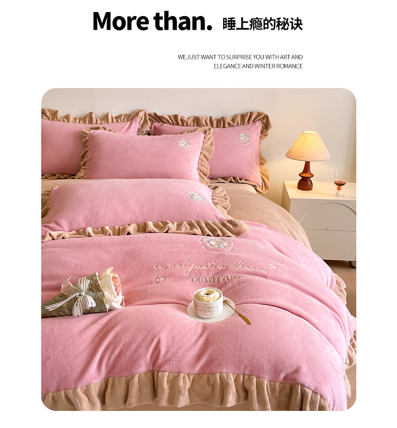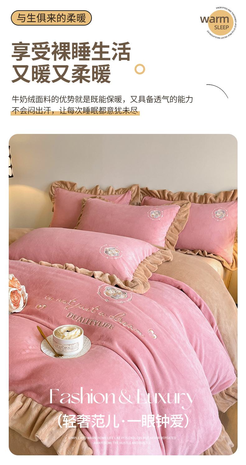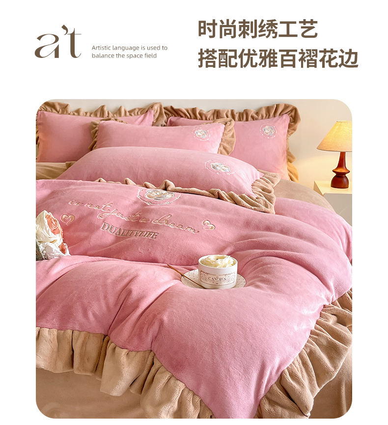 露梦家纺 2025新款加厚保暖牛奶绒刺绣款四件套-轻羽(风格二) 轻羽-桃夭粉,轻羽-桃夭粉
