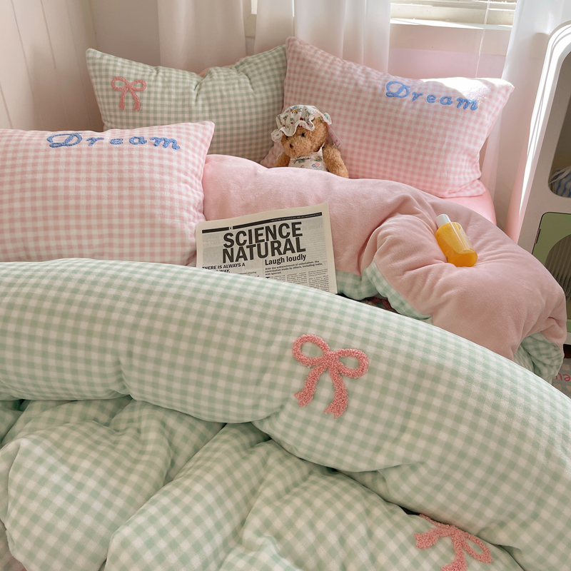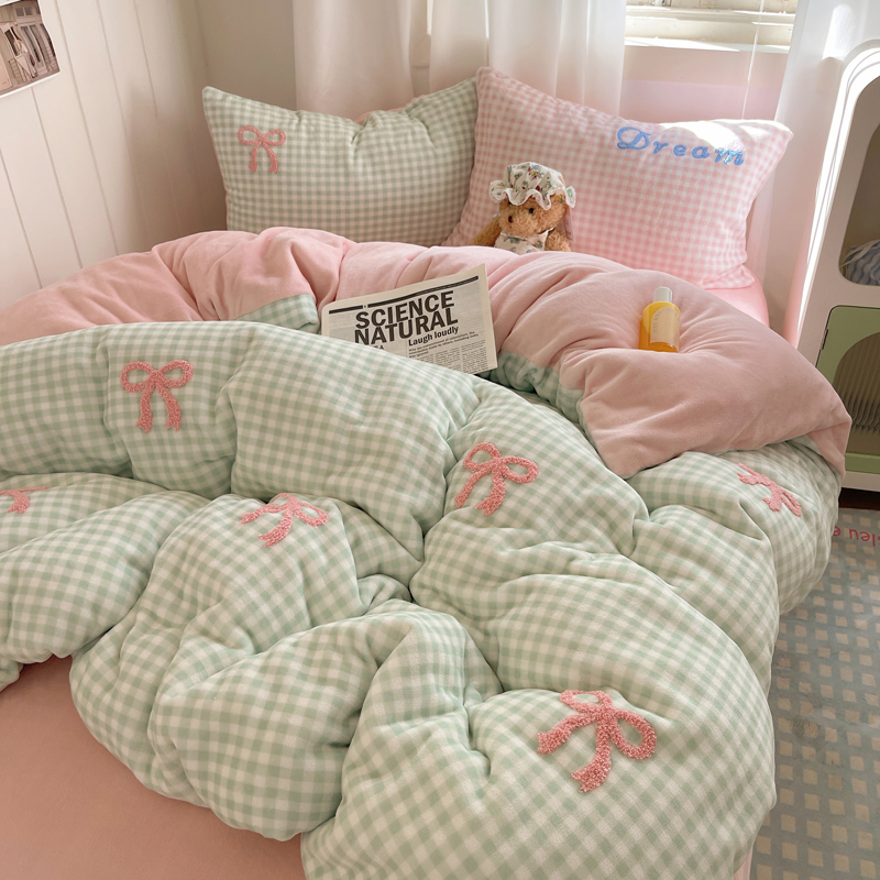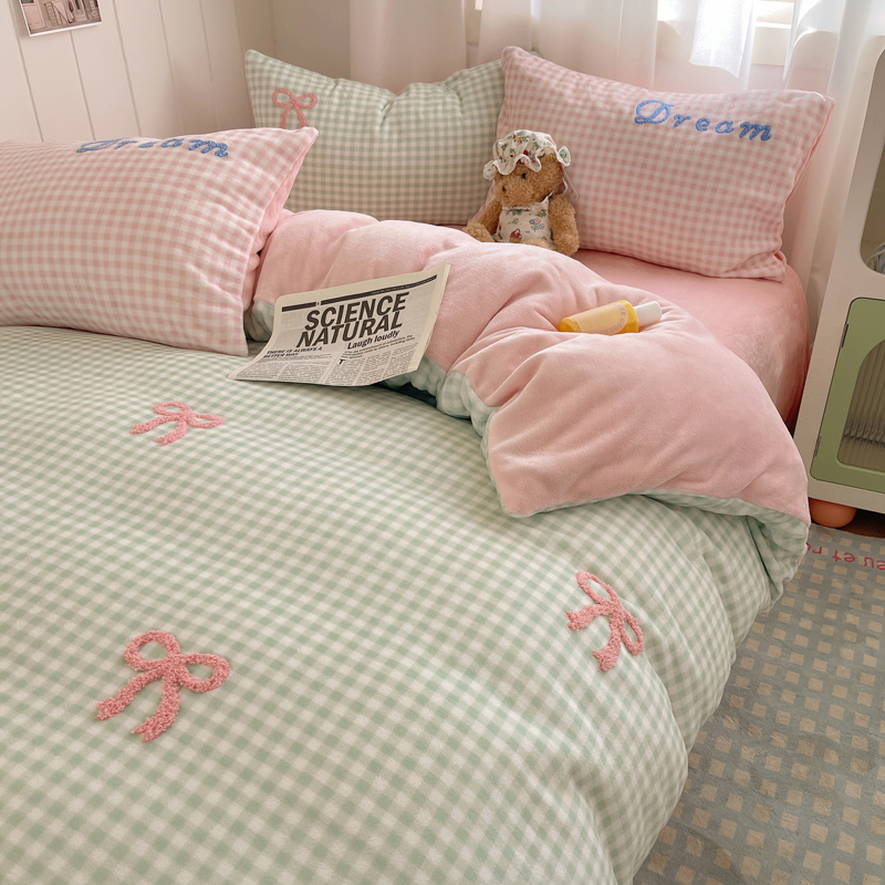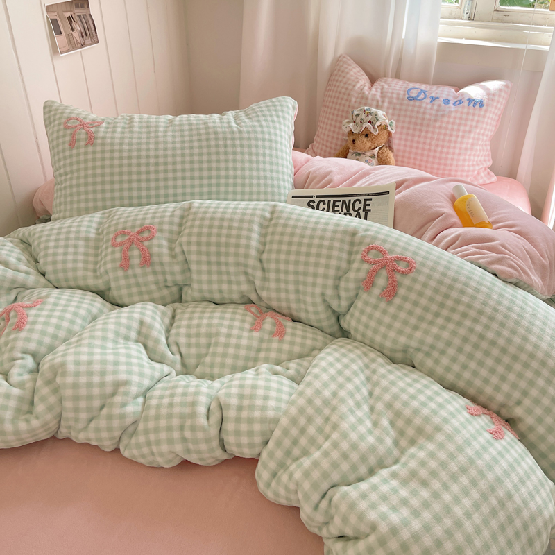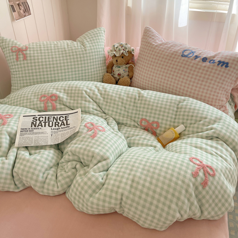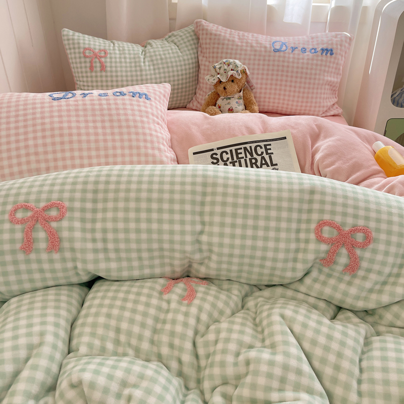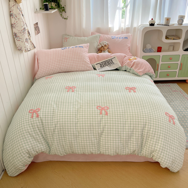 商品名称:顾里家纺 2024新款格子蝴蝶结毛巾绣牛奶绒四件套 绿格蝴蝶结