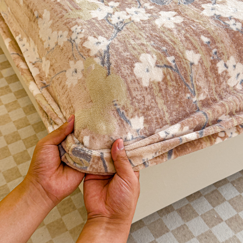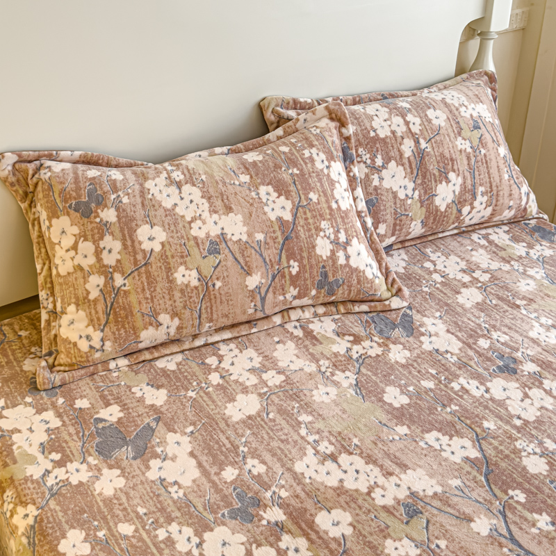 • 91家纺网 家纺一手货源 找家纺 金丝鸟家纺 2024新款加厚240g立体雕花牛奶绒床笠 蝴蝶花 咖