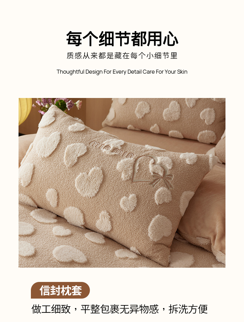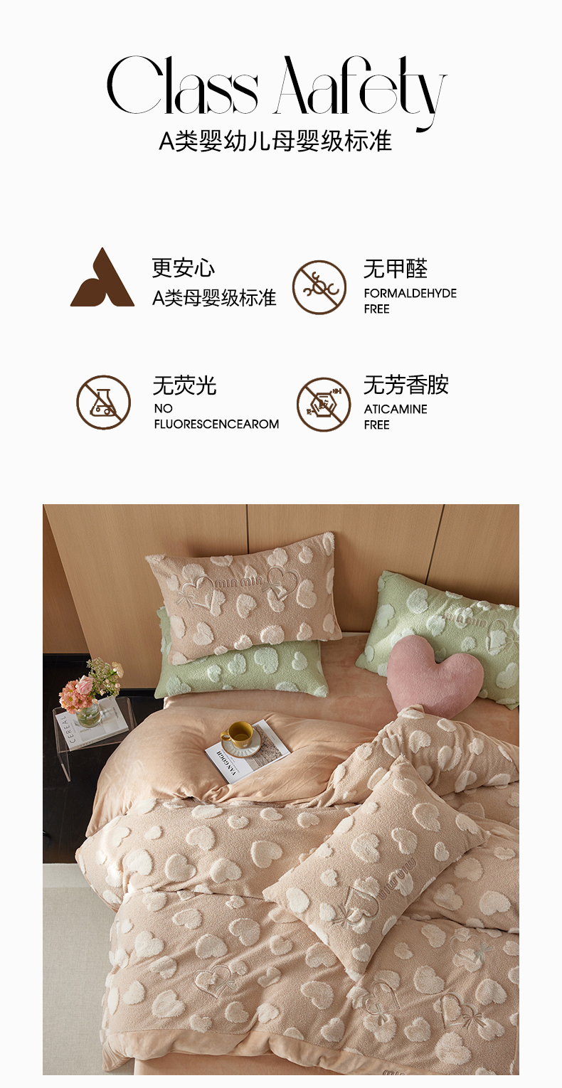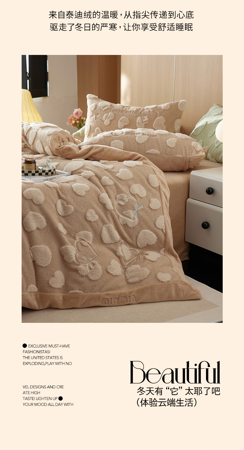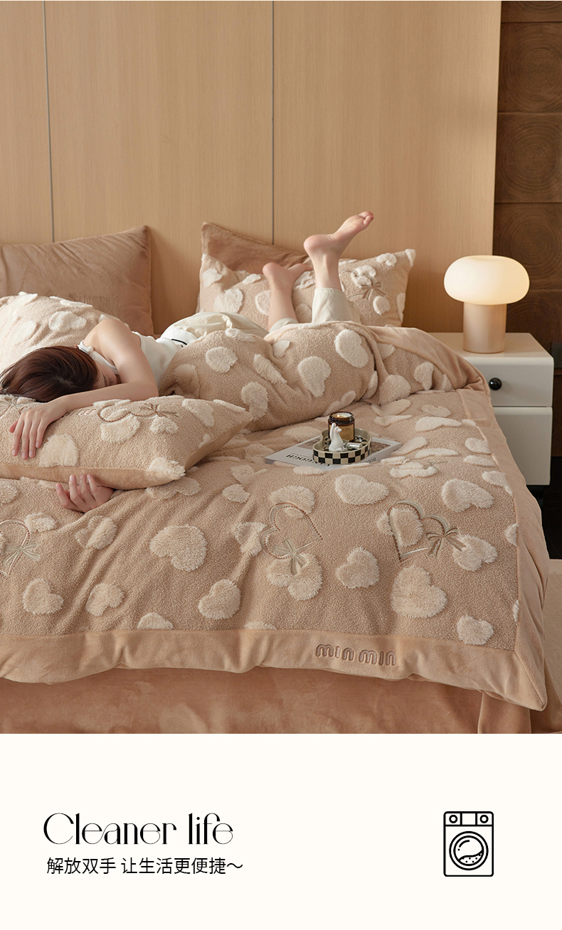 安莱生活 2024新款minmin泰迪绒立体提花爱心四件套 爱心绒-奶茶杏