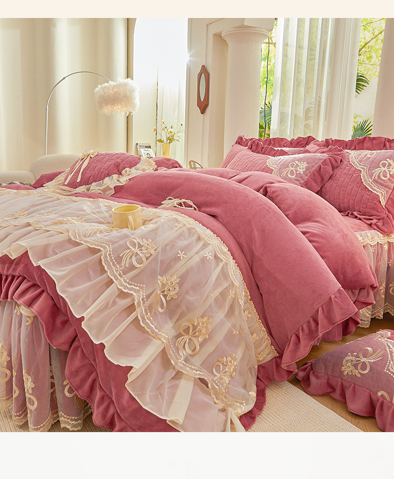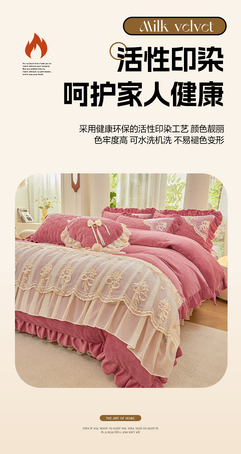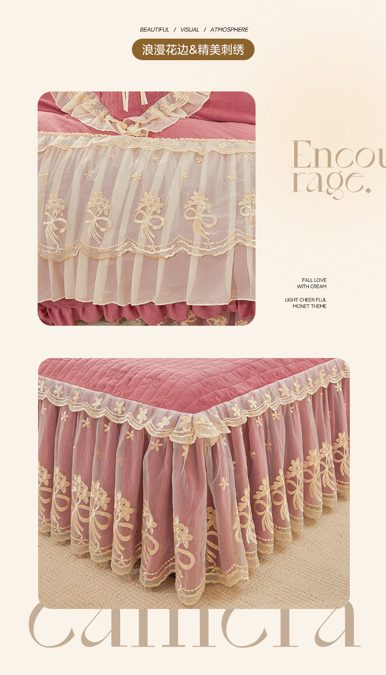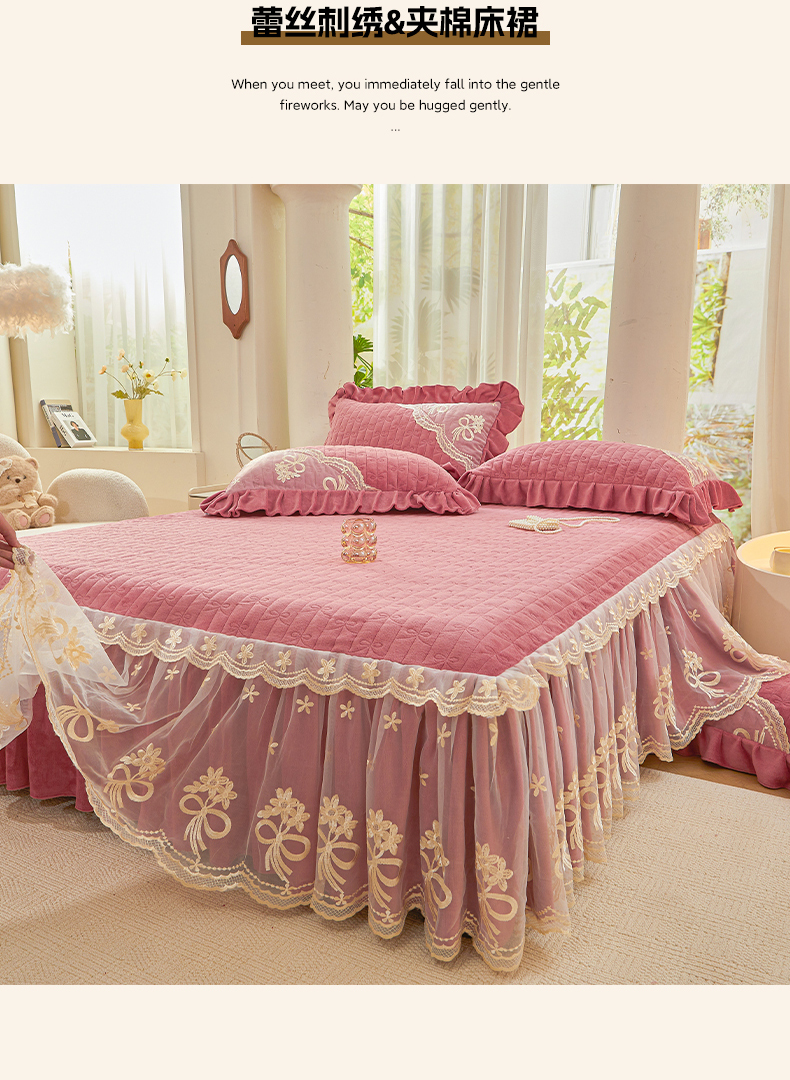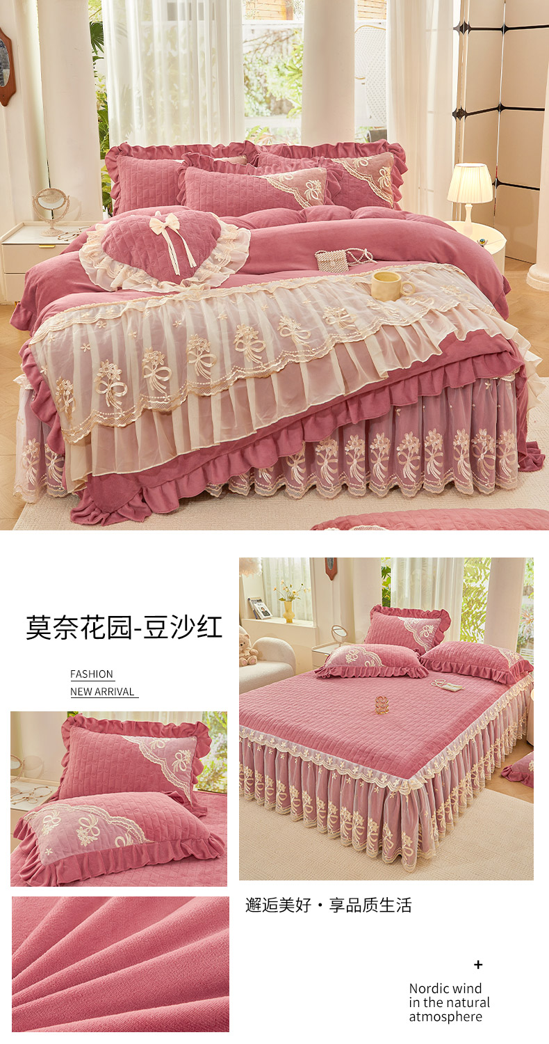 当前位置: 91家纺网 > 商品网购 > 床品套件 > 四件套 > 牛奶绒四件套 > 2024新款加厚牛奶绒蕾丝刺绣床裙四件套-莫奈花园系列 莫奈花园-豆沙红