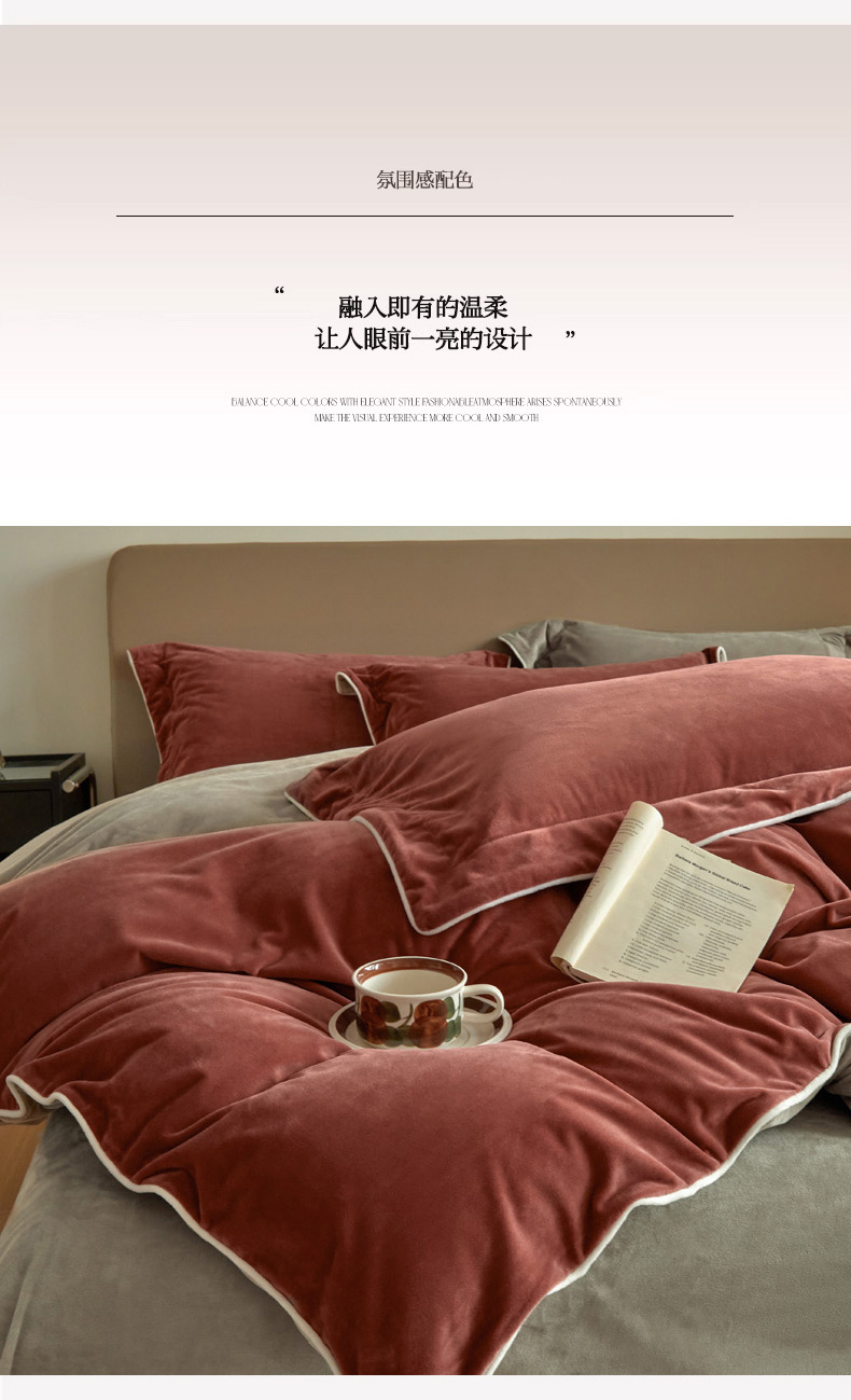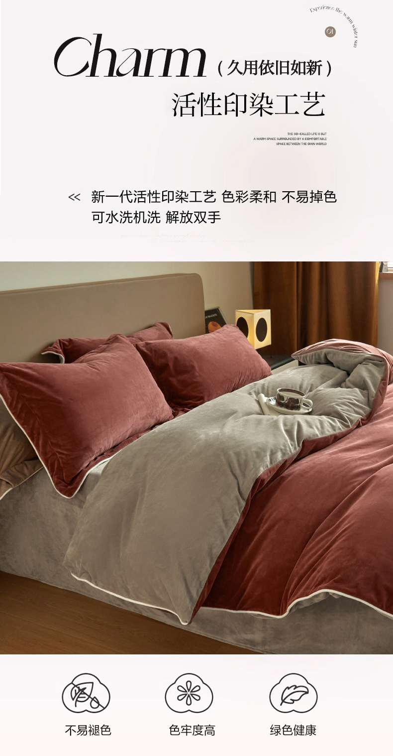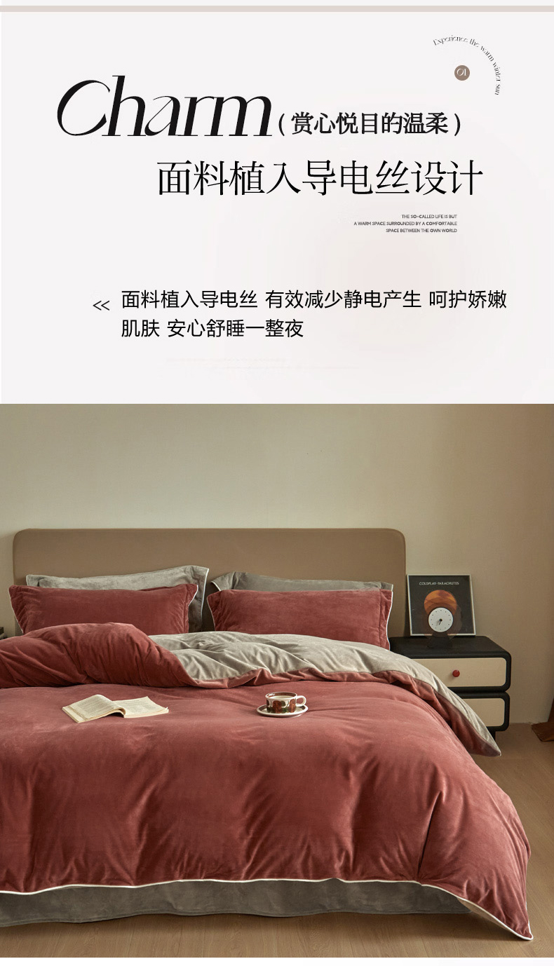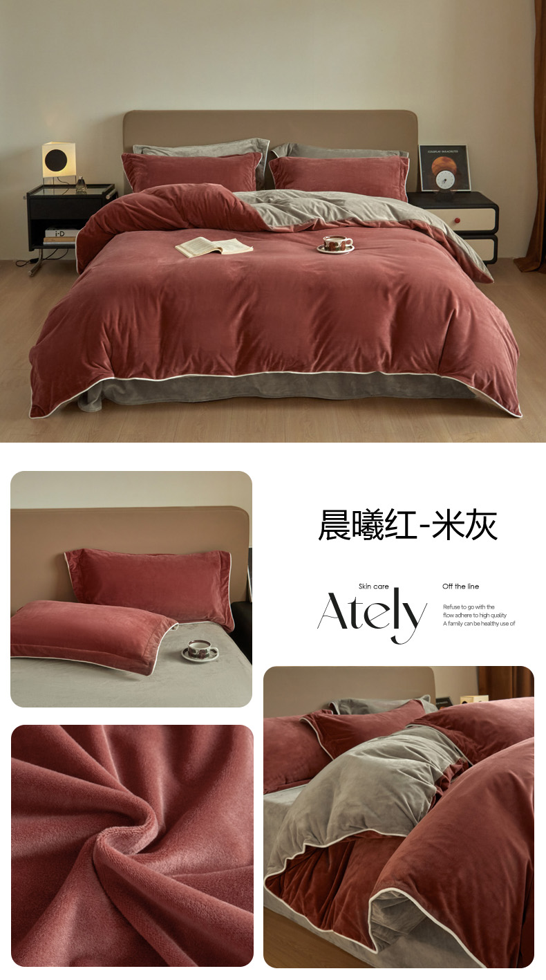 当前位置: 91家纺网 > 商品网购 > 床品套件 > 四件套 > 牛奶绒四件套 > 万盛家纺 2025新款德芙绒牛奶绒法莱绒水晶绒双拼四件套 晨曦红-米灰