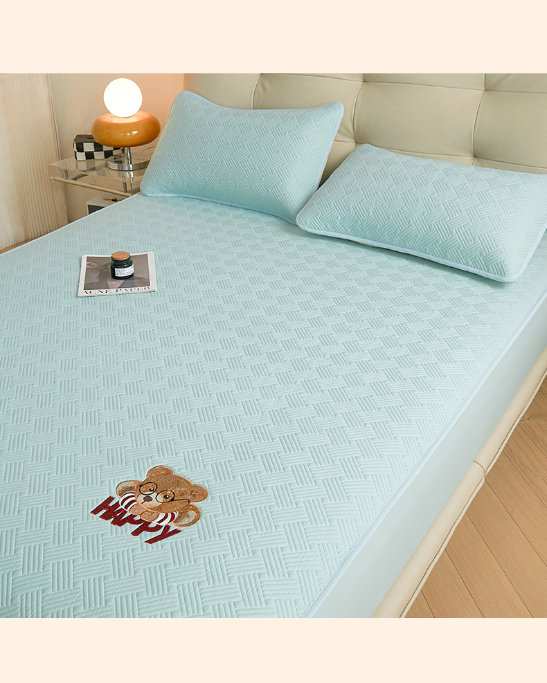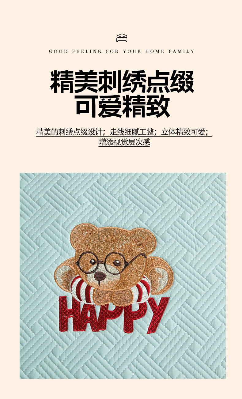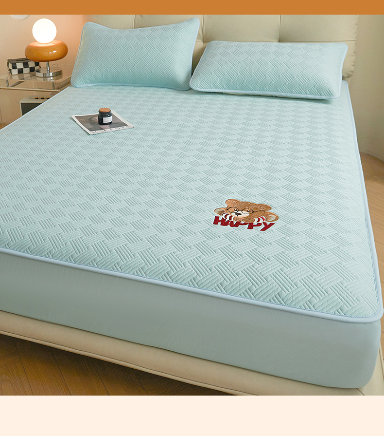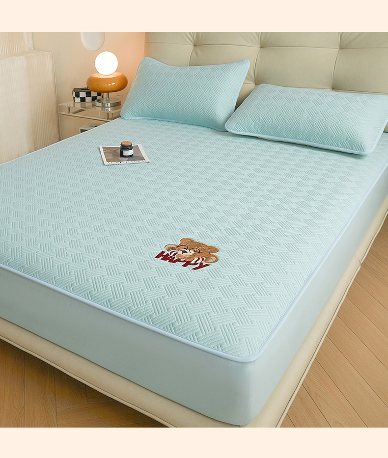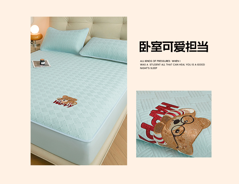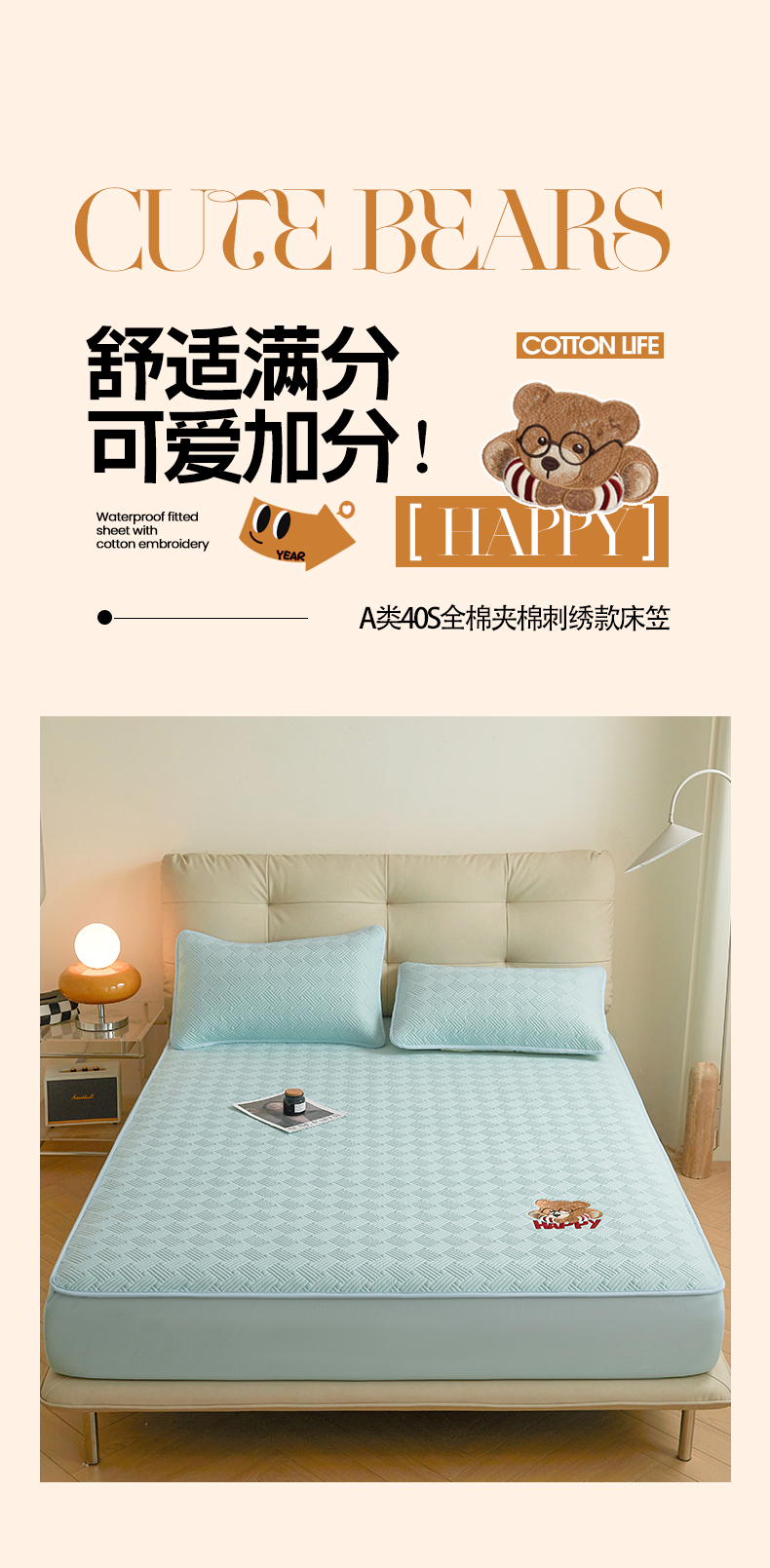 暖季家纺 2025新款40支长绒棉刺绣款全棉夹棉床笠支持定制 博士小熊-天空蓝