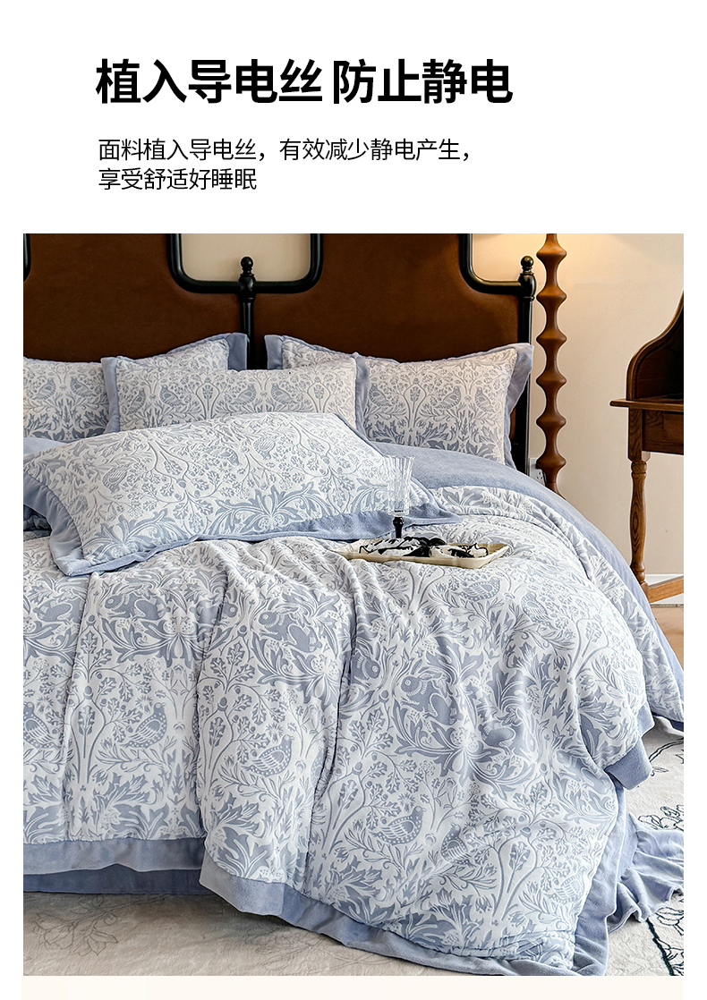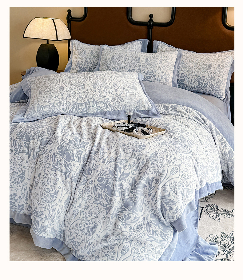 商品名称:慕晨 2024新款高克重全消光A类雕花牛奶绒法式风大宽边拼角吊边床单四件套-风格二 可可西里-灰蓝
