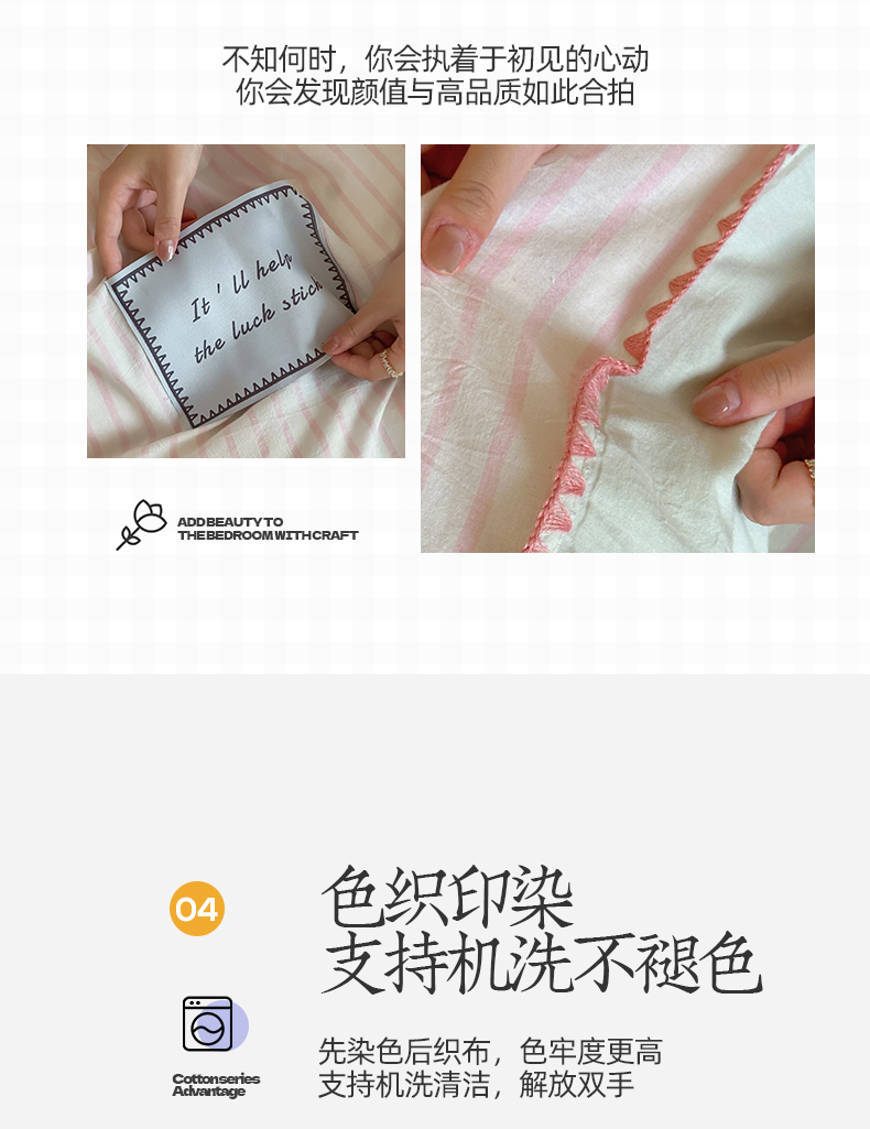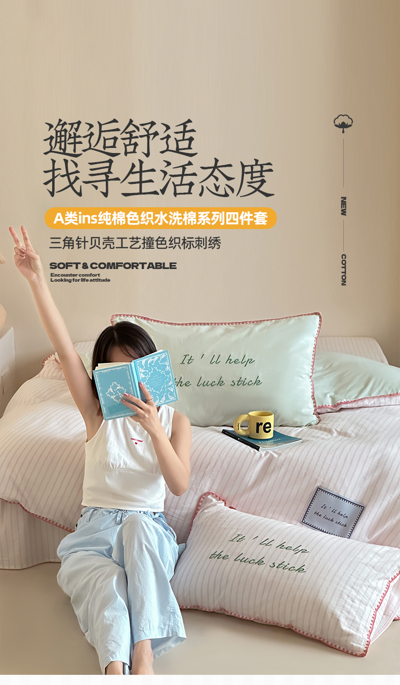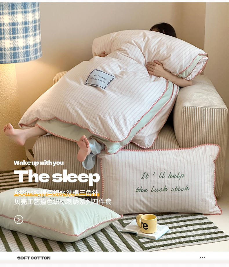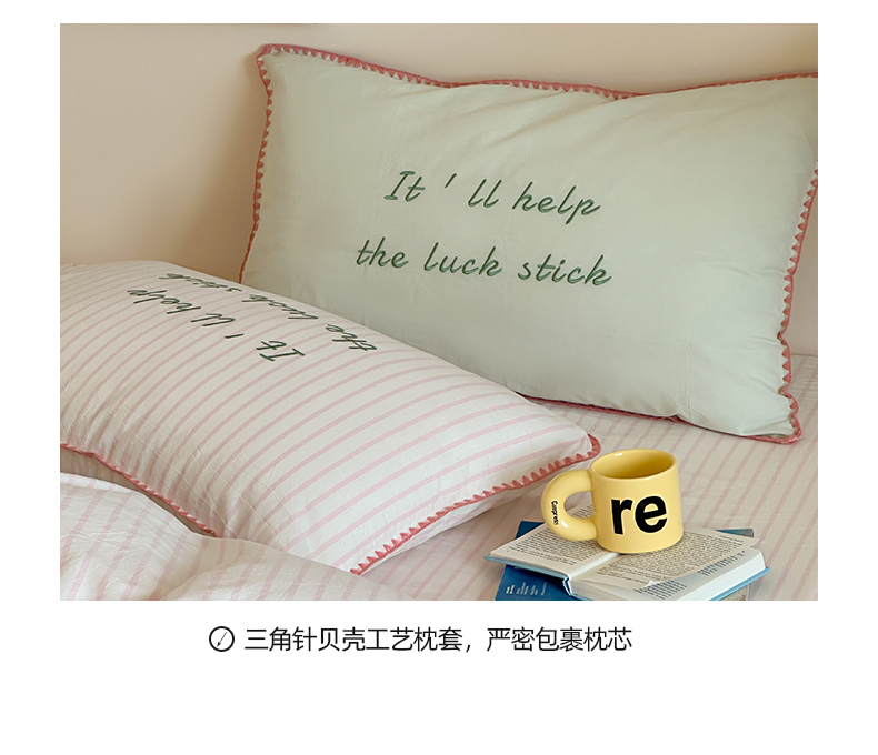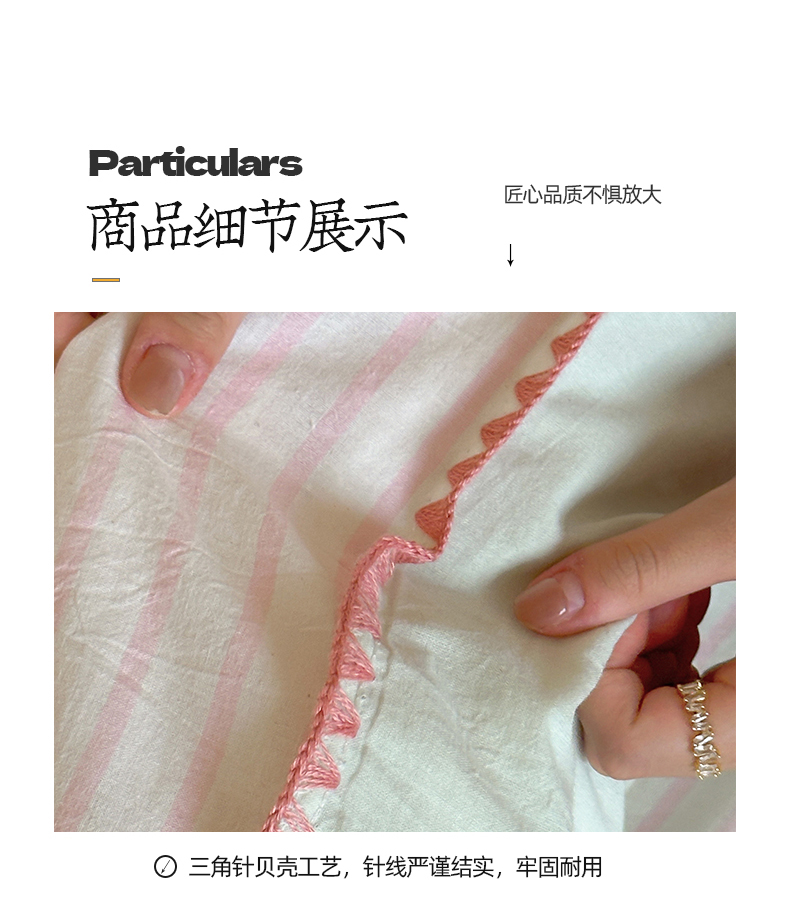 当前位置: 91家纺网 > 商品网购 > 床品套件 > 四件套 > 水洗棉四件套 > 桃子家居 2025新款A类ins纯棉色织水洗棉三角针贝壳工艺撞色织标刺绣系列四件套 棉三角针-S芭乐粉条