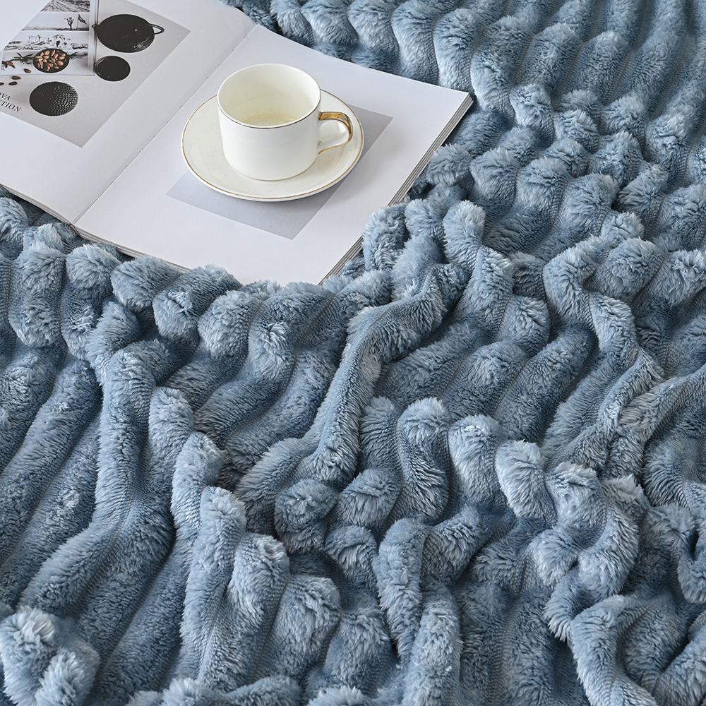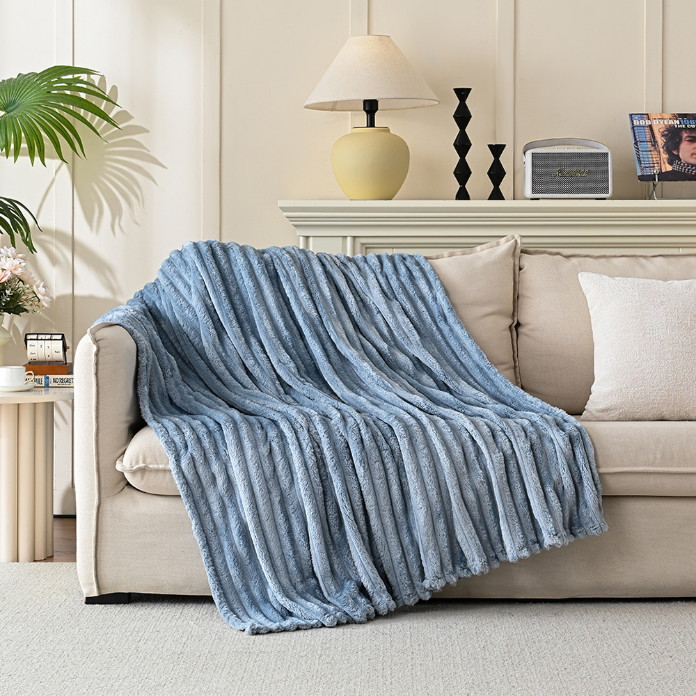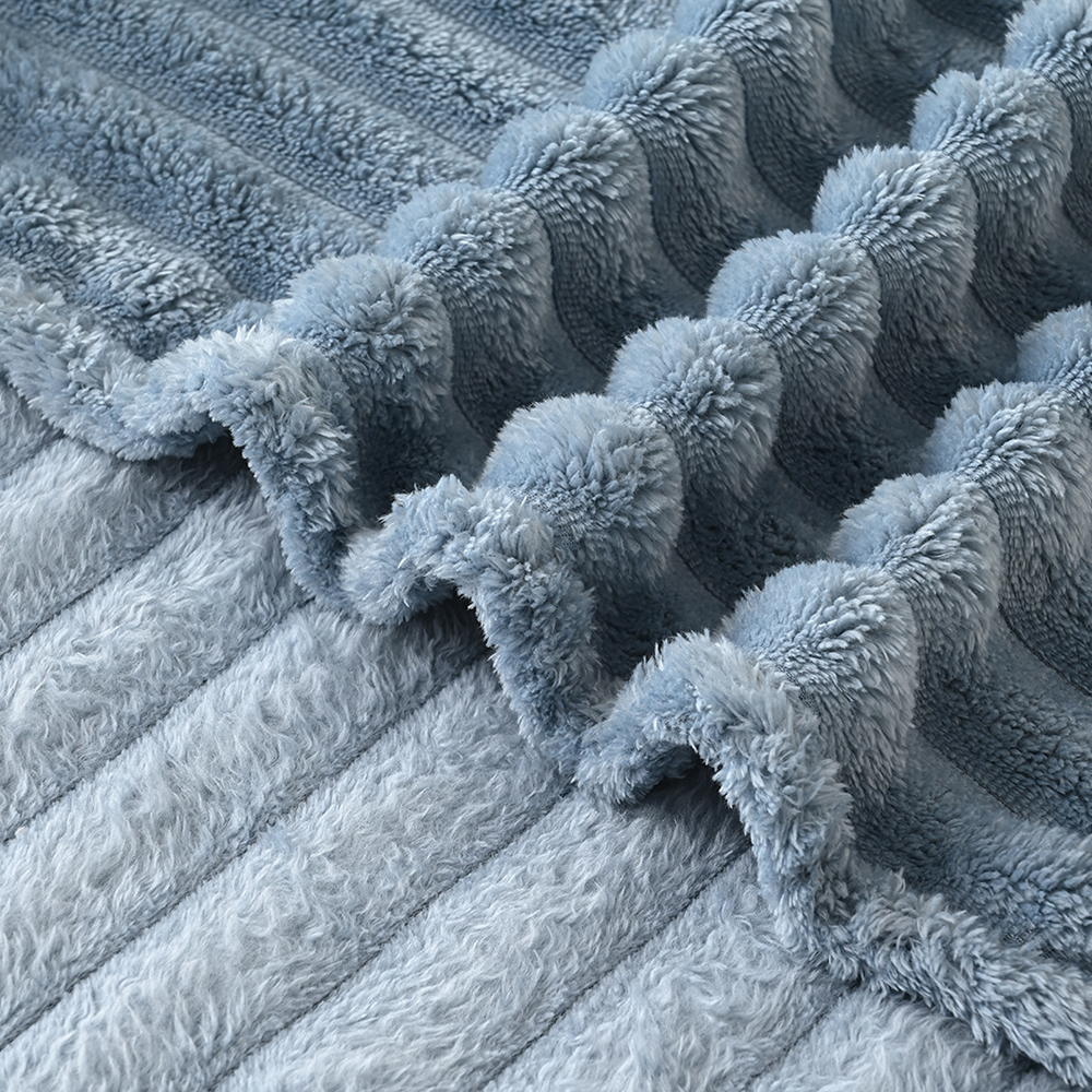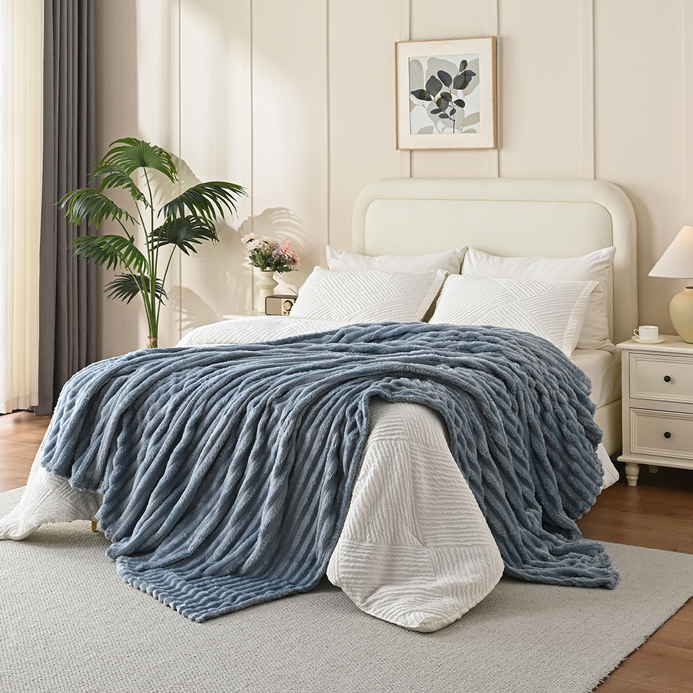 慕莎家纺 2025新款抽条兔毛绒多功能毛毯 抽条蓝灰