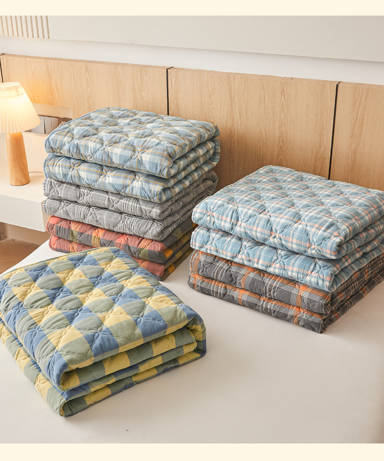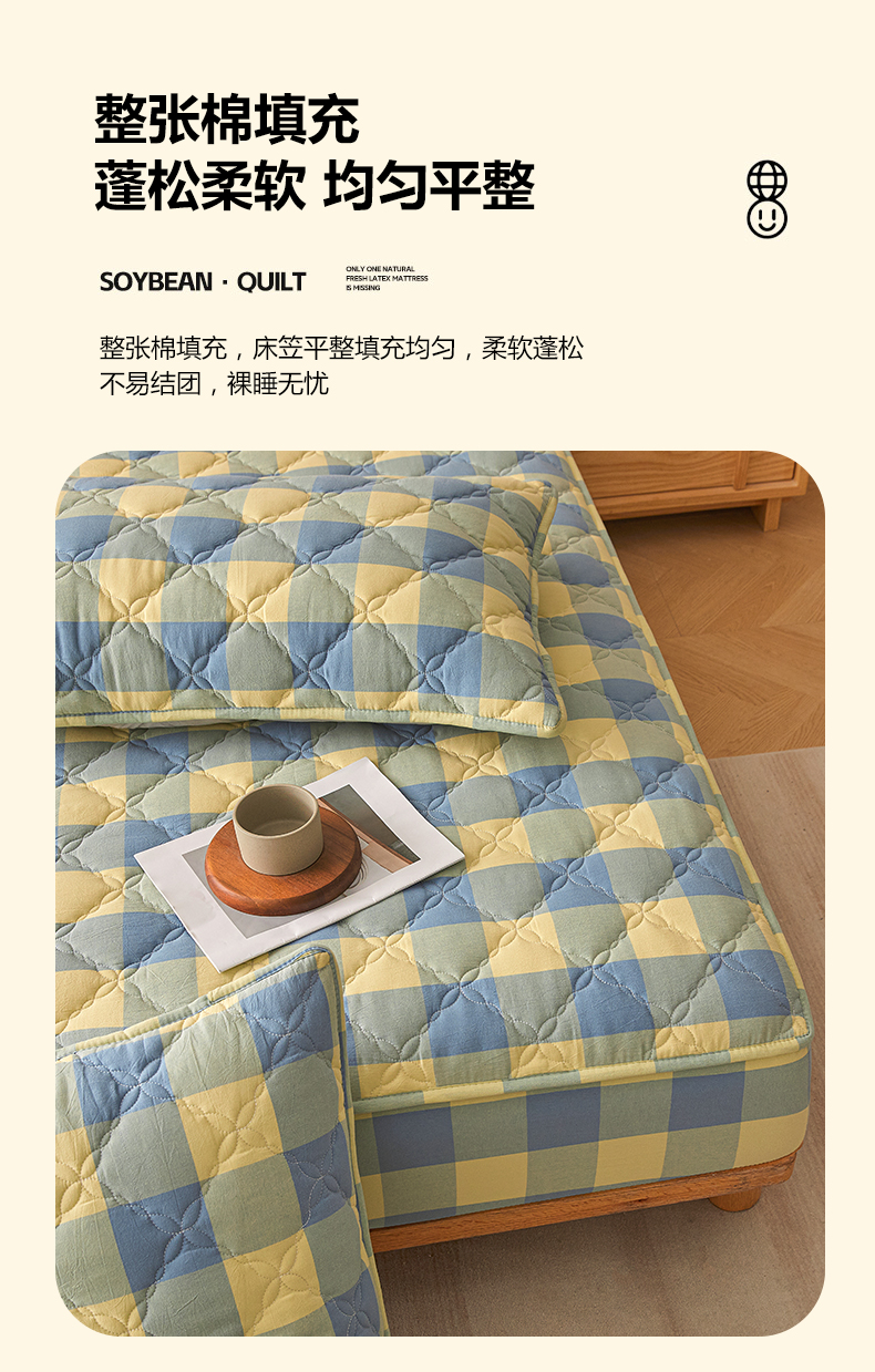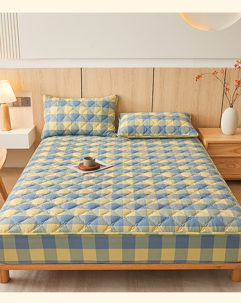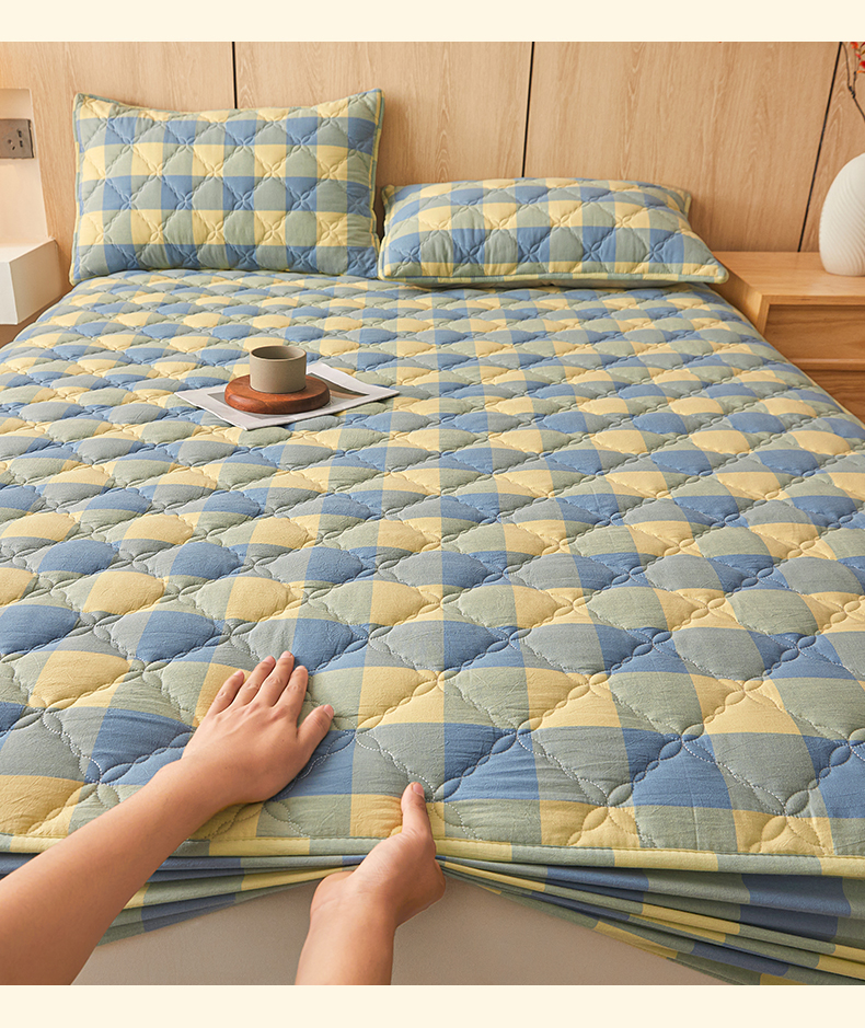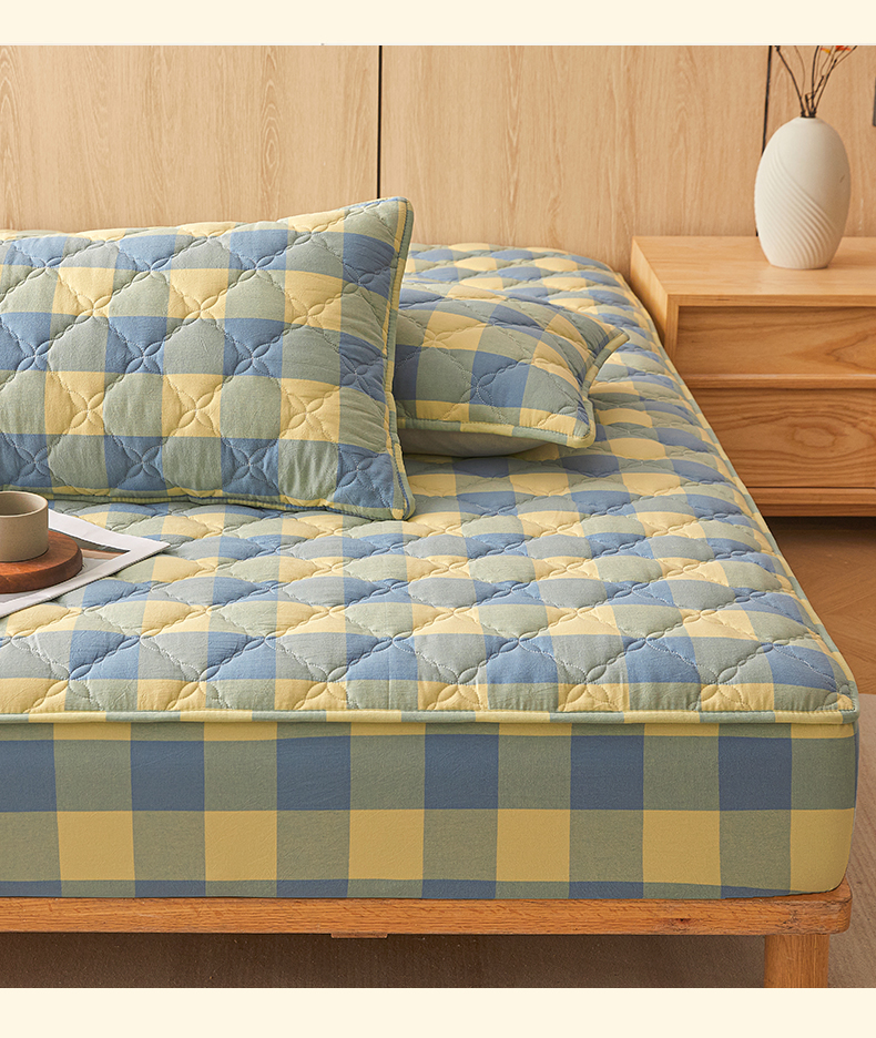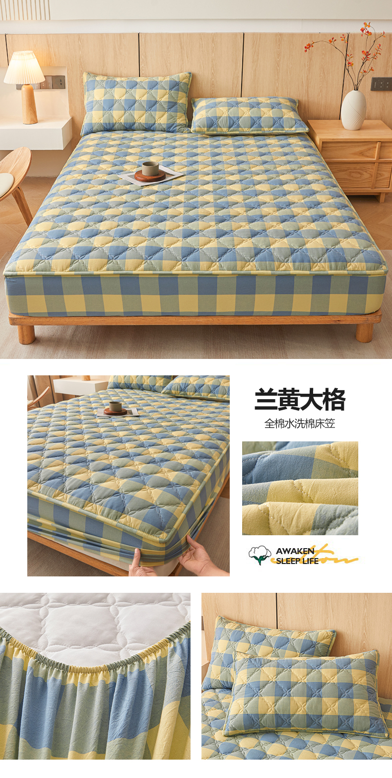 糯米猪家纺 2025新款全棉色织水洗棉床笠 兰黄大格