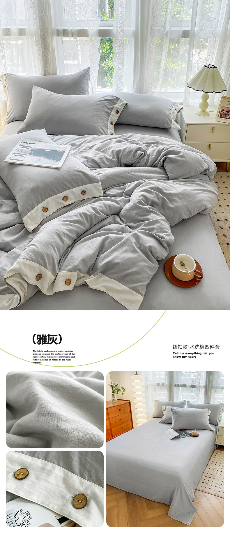 当前位置: 91家纺网 > 商品网购 > 床品套件 > 四件套 > 水洗棉四件套 > 库里梦家纺 2025新款贴边纽扣式纯色水洗棉四件套 贴边纽扣-雅灰