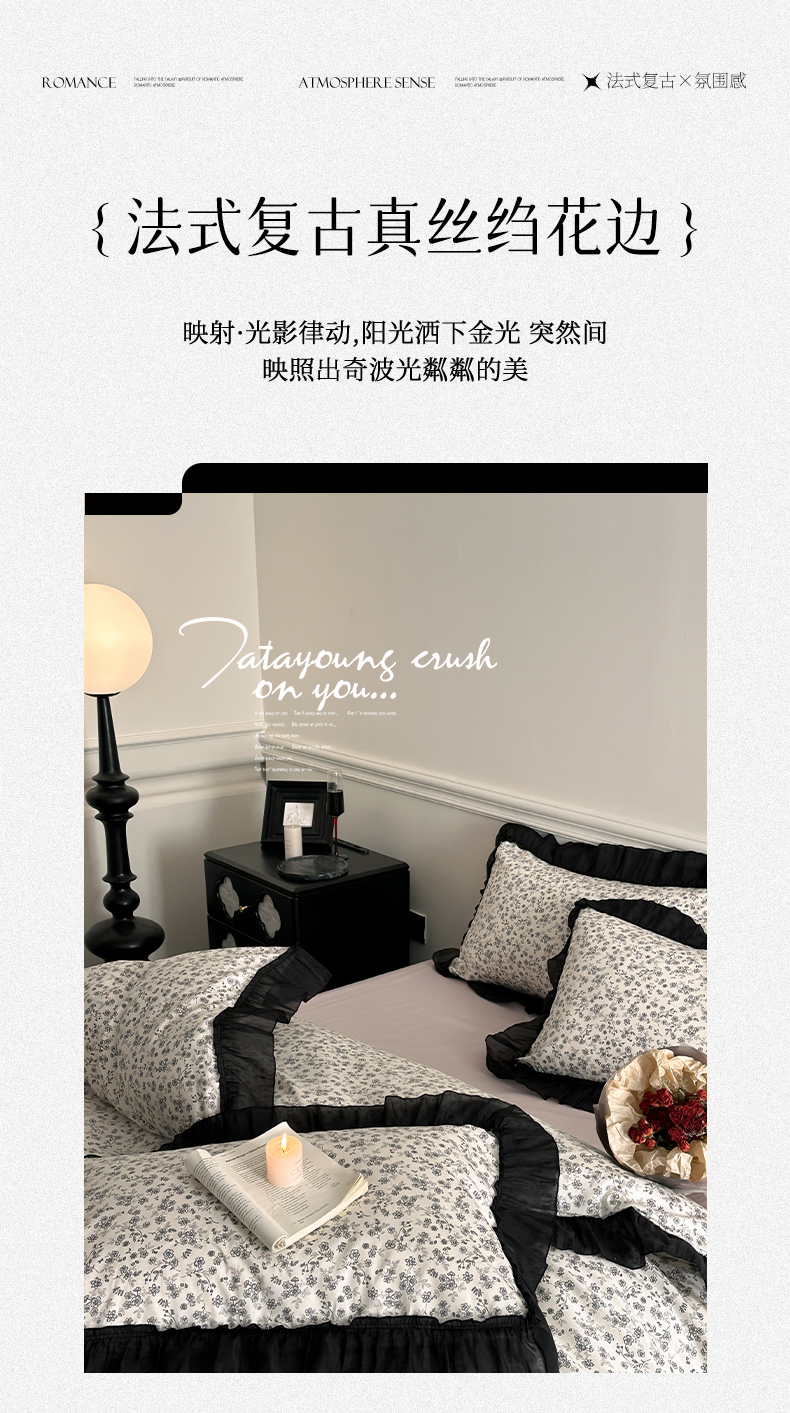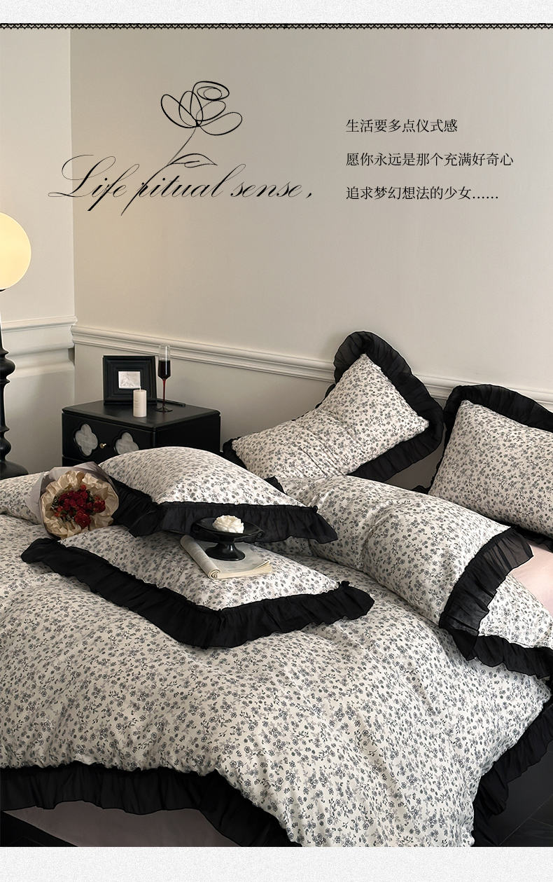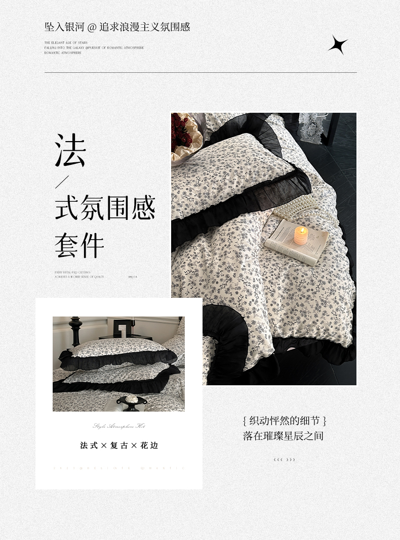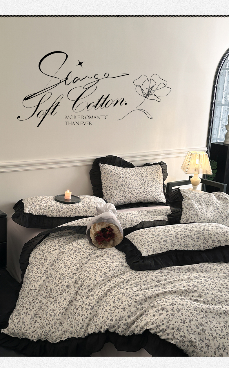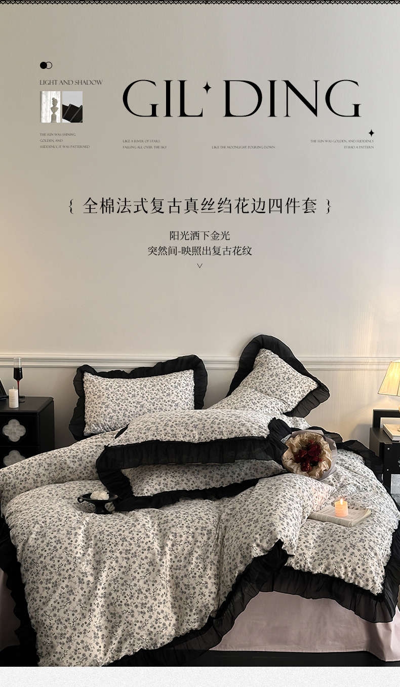 当前位置: 91家纺网 > 商品网购 > 床品套件 > 四件套 > 全棉普通四件套 > 蓝邻家纺 2025年新款全棉法式复古真丝绉花边四件套系列 牧野繁花
