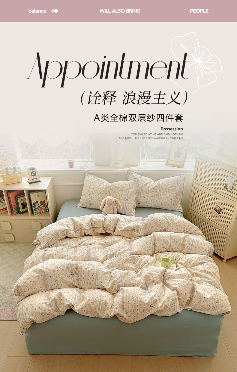 商品名称:田野家纺2025新款A类全棉双层纱四件套 香草
