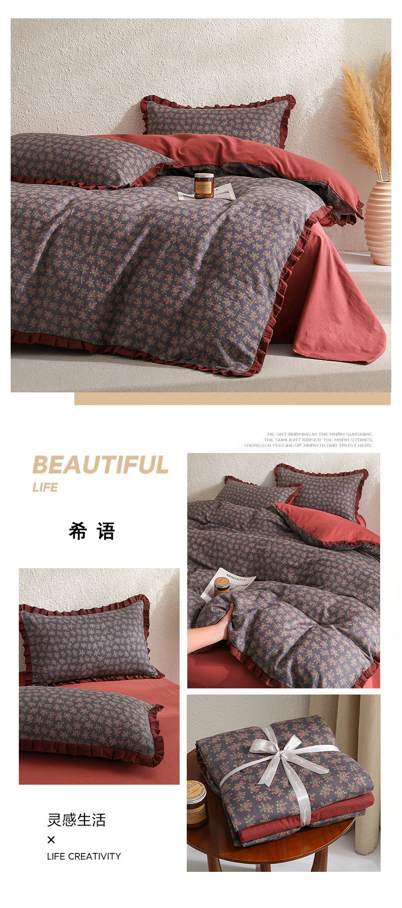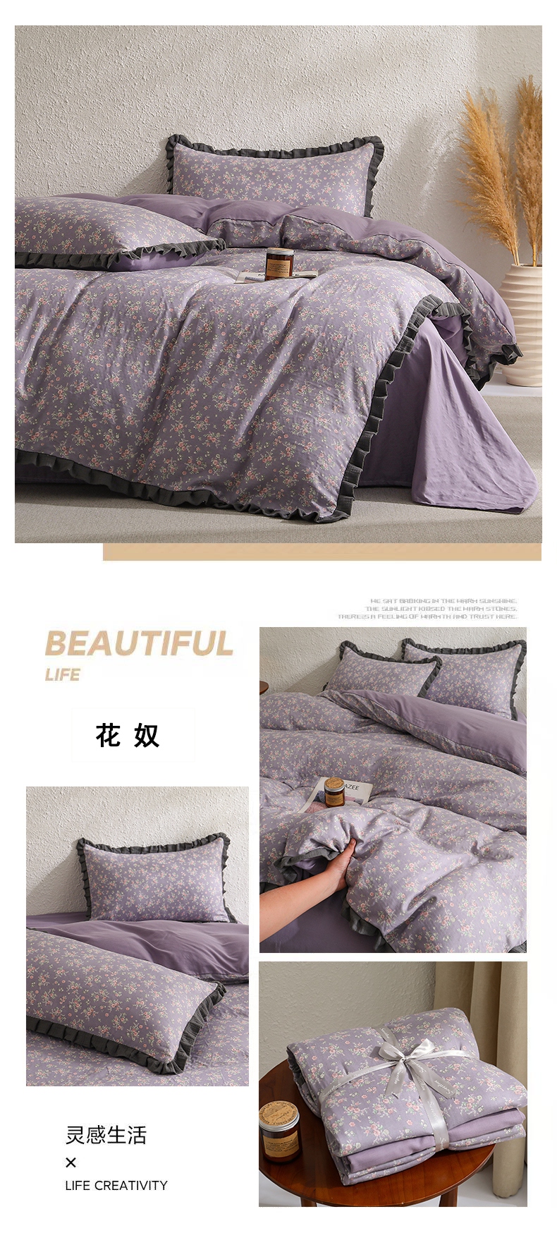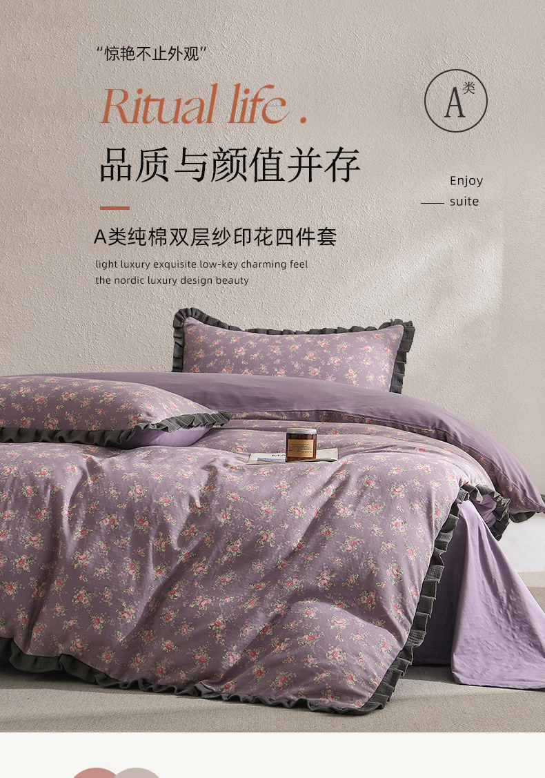 商品名称:2025新款A类纯棉双层纱皱皱纱花边四件套(复古风) 清逸