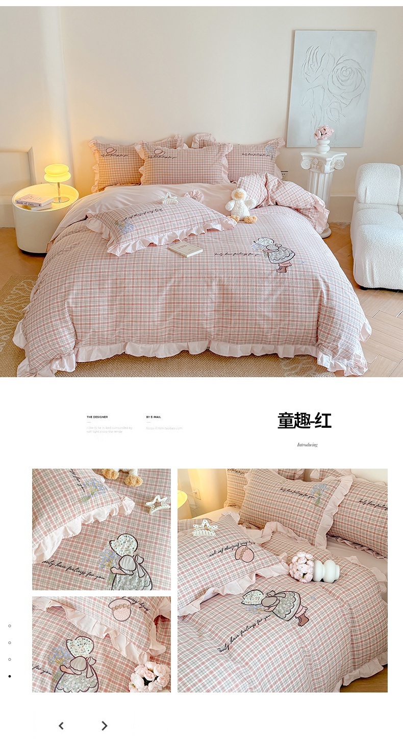 当前位置: 91家纺网 > 商品网购 > 床品套件 > 四件套 > 全棉普通四件套 > 蜜柚 2025新款色织水洗棉贴布花边款四件套-童趣 童趣-洋气红