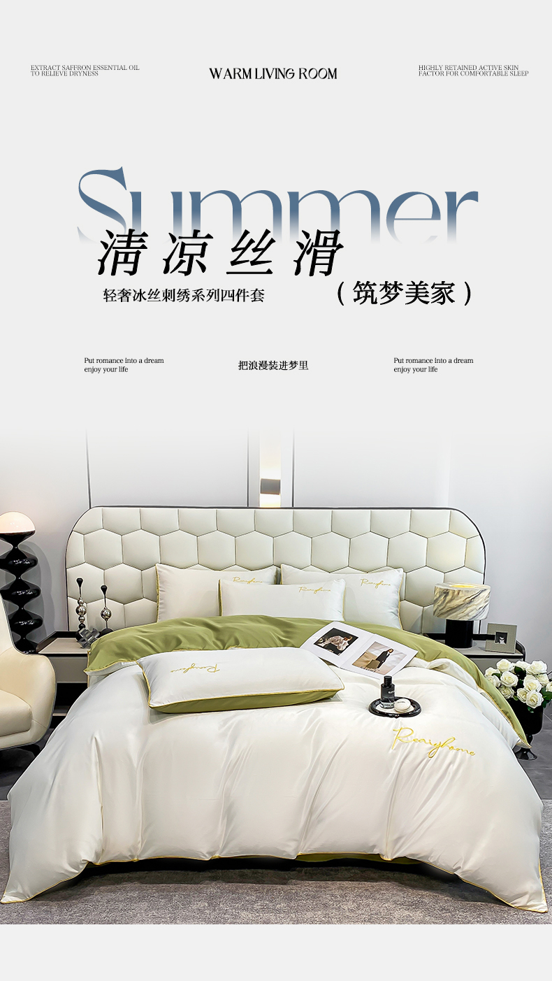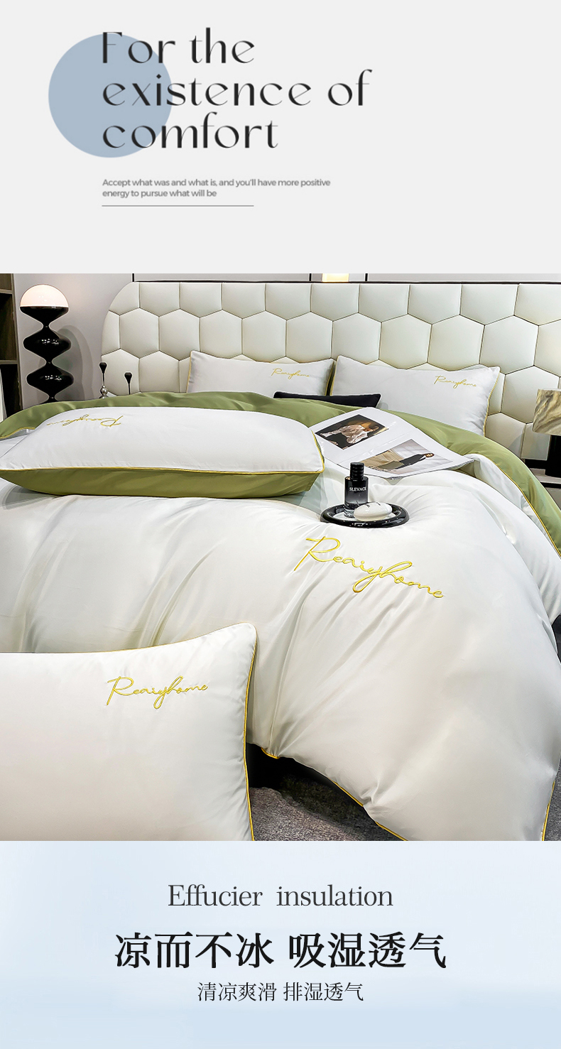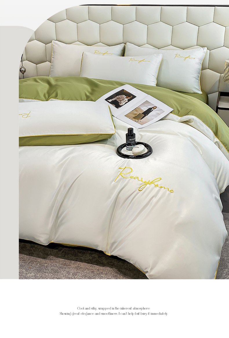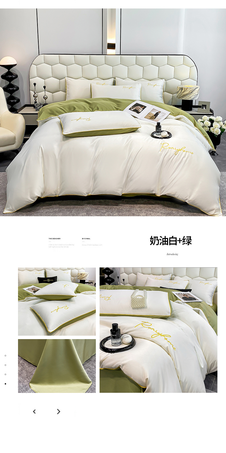 商品名称:富宁2025新款水洗真丝时光字母冰丝刺绣四件套 奶油白+绿