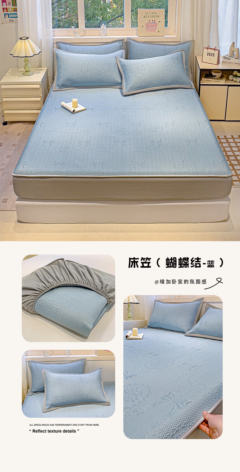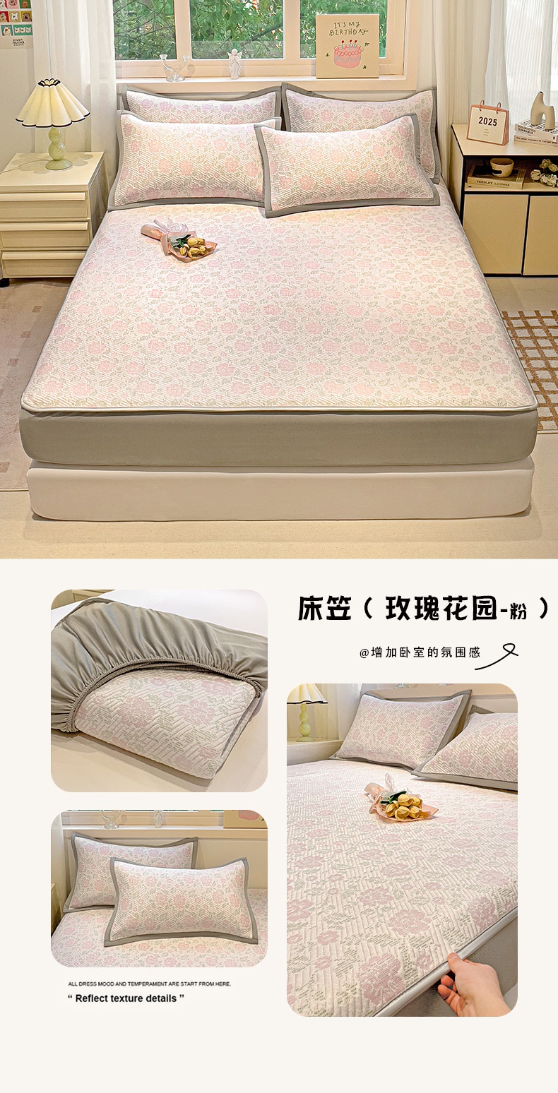 • 91家纺网 家纺一手货源 找家纺 富馨莱 2025新款A类480克PE凉感凉豆豆凉席三件套和单件床笠款 玫瑰花园-灰