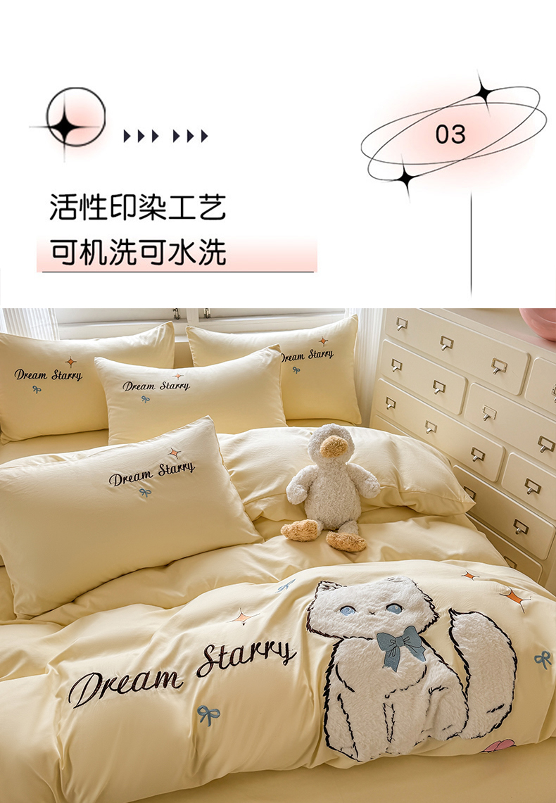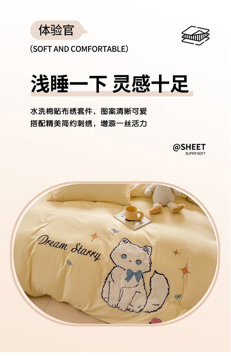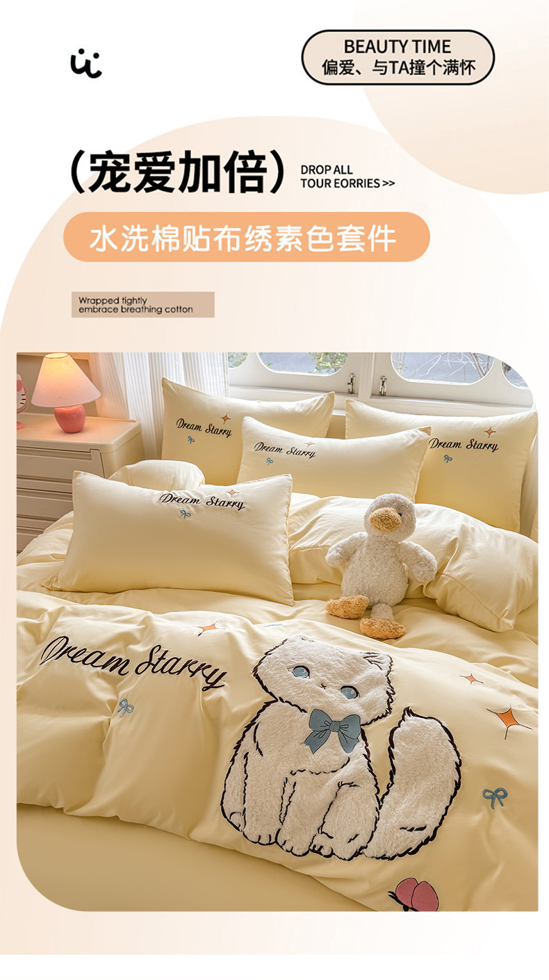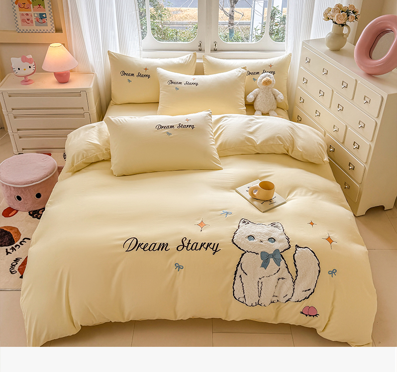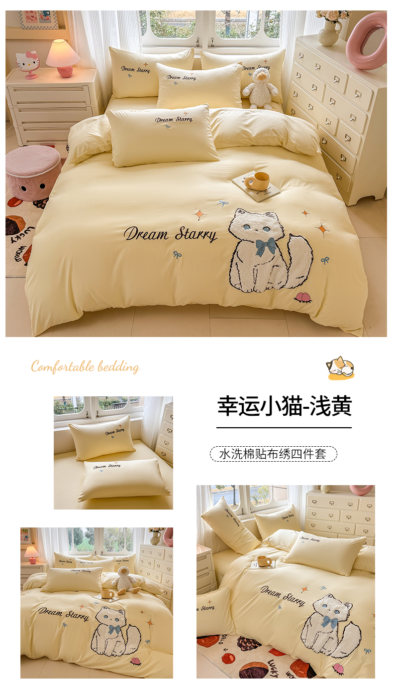 当前位置: 91家纺网 > 商品网购 > 床品套件 > 四件套 > 水洗棉四件套 > 凯美 2025新款超柔水洗棉卡通贴布绣四件套 幸运小猫-浅黄
