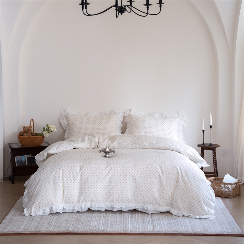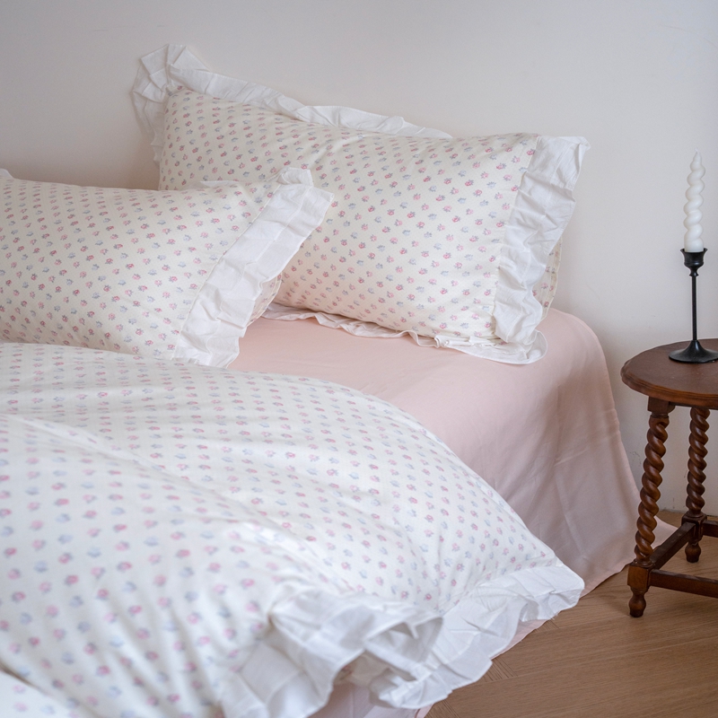 商品名称:尺素 2025新款全棉碎花韩式花边款纯棉四件套纯色加大床单1.8床笠法式大花边被套枕套 花边款落苏-桃粉