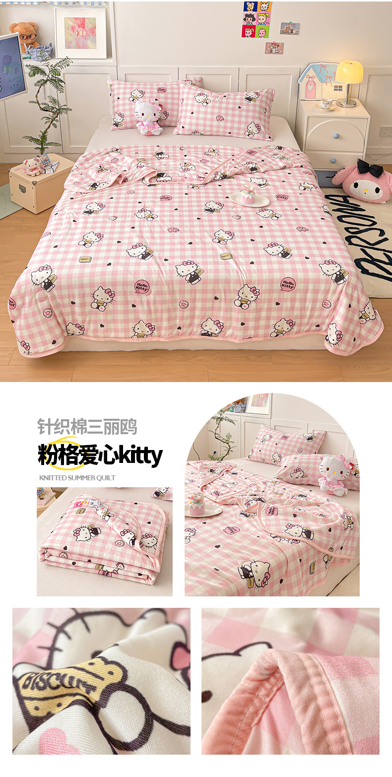 金爱家2025新款A类三丽鸥正版授权高品质牛奶丝软糯针织棉大豆夏被系列详情 针织棉三丽鸥-粉格爱心kitty