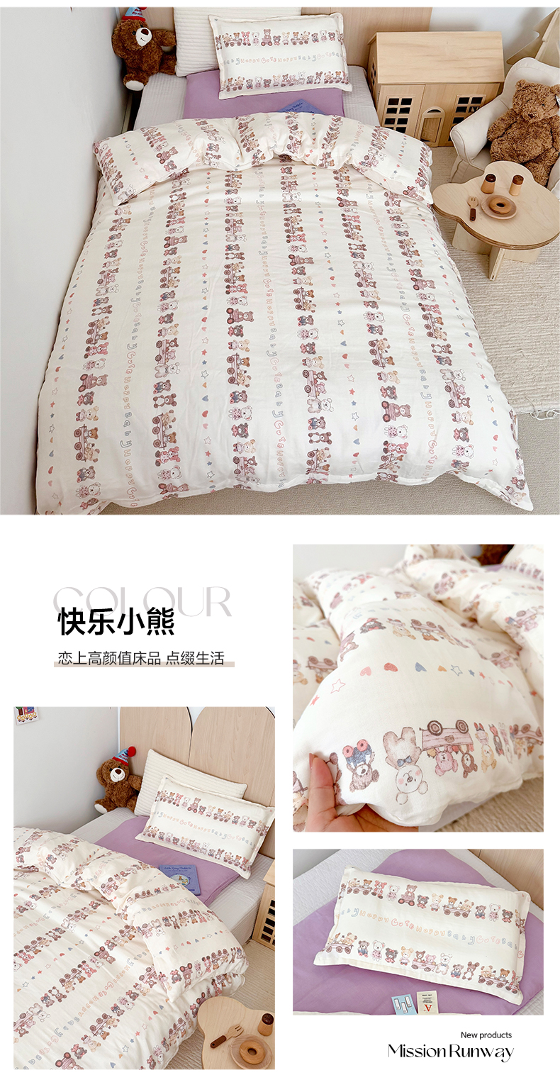 当前位置: 91家纺网 > 商品网购 > 床品套件 > 三件套 > 2025新款全棉26℃有氧双层纱幼儿园多件套 快乐小熊