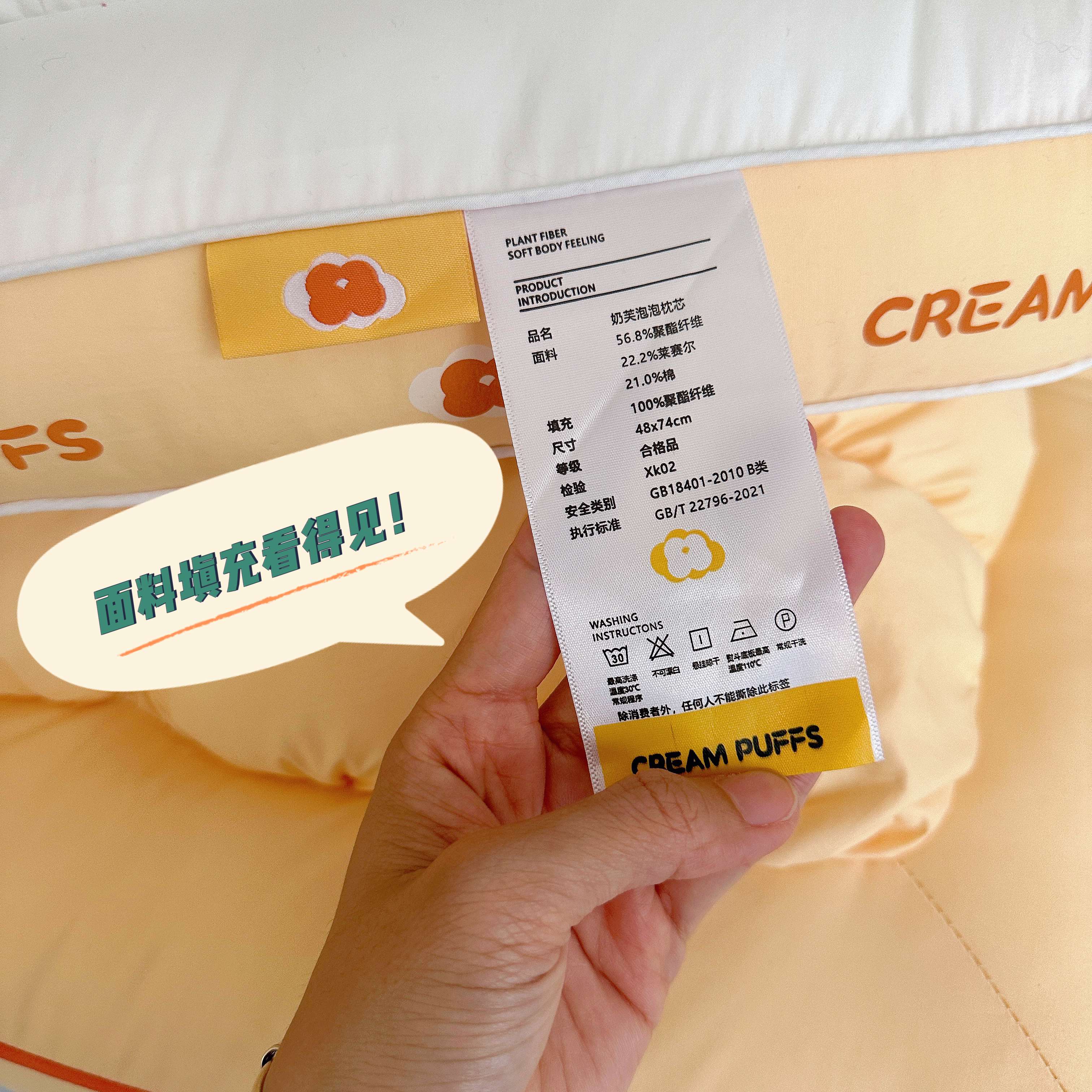 【奶芙泡泡面包枕】 面料:聚酯纤维 56.8, 莱赛尔 22.2, 棉 21.0 (有检测报告), 填充:100%聚酯纤维, 规格: 尺寸48x74cm ,高度 约15cm,睡下5-7cm,填充重量约900g