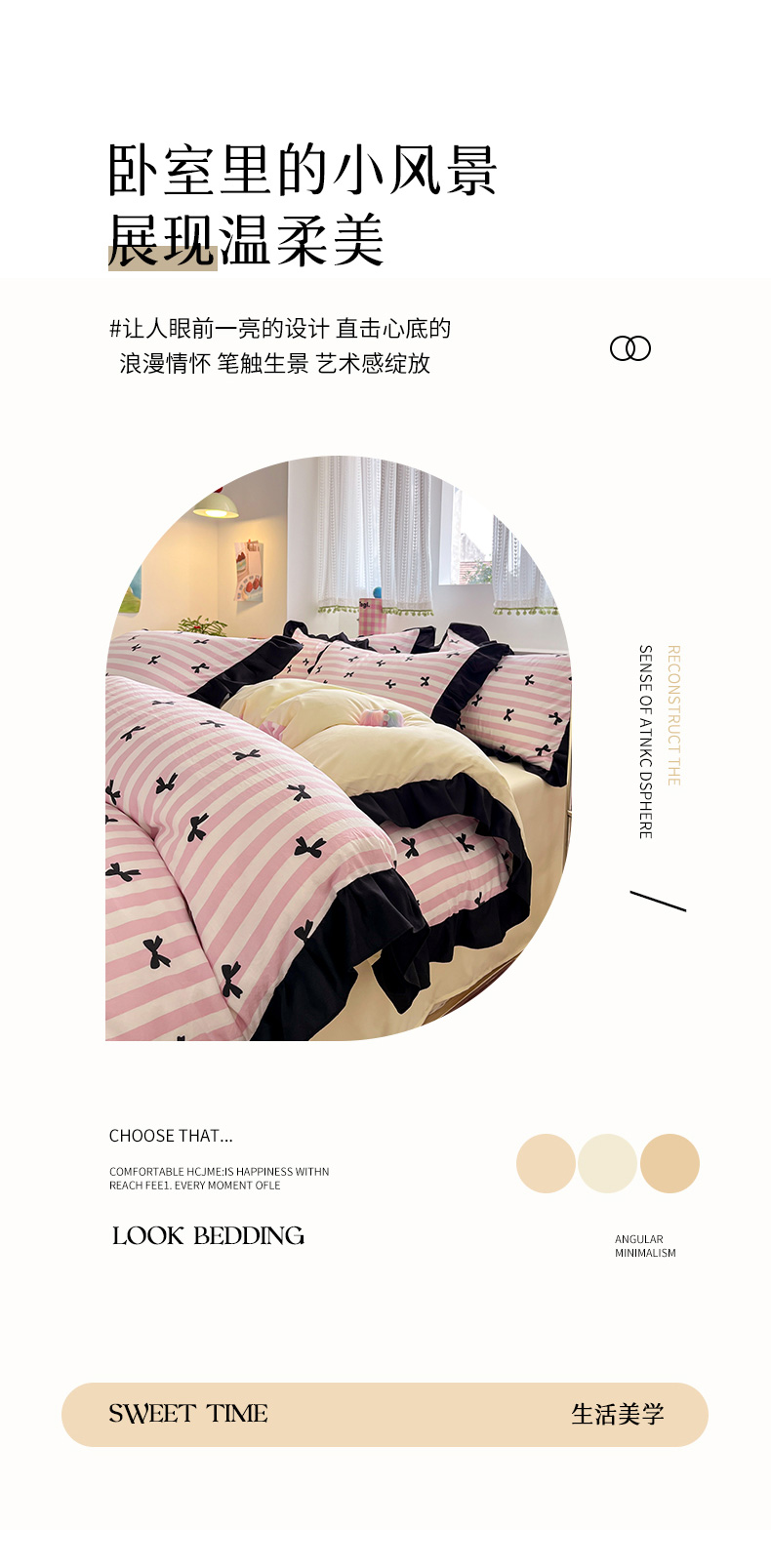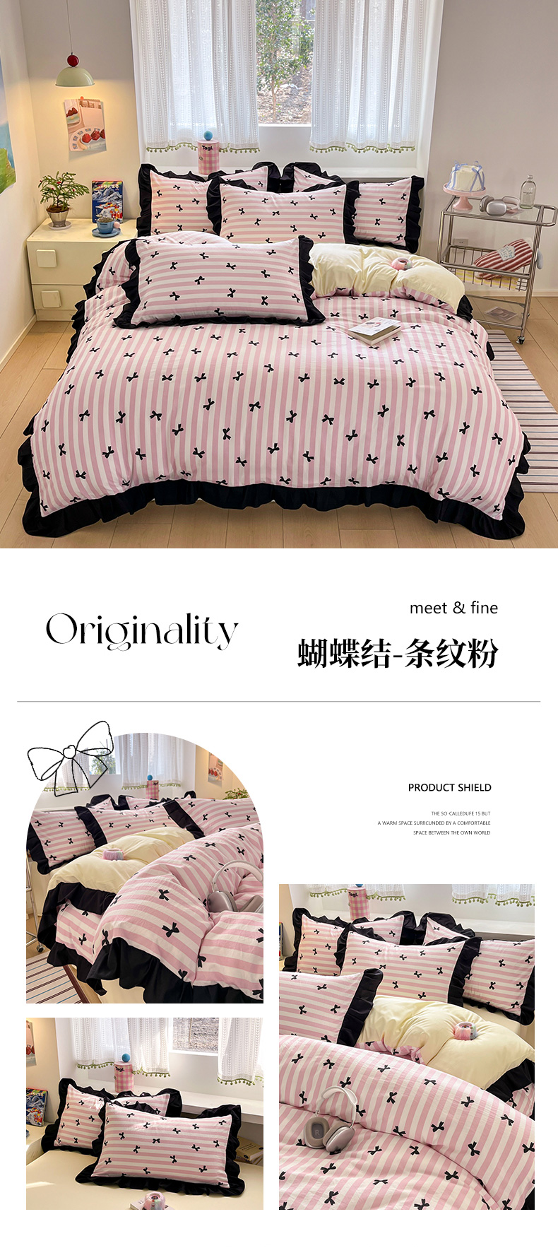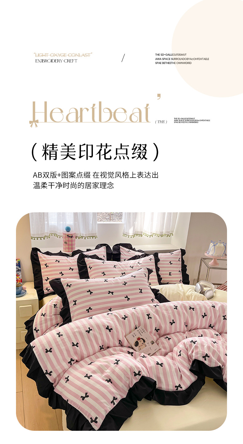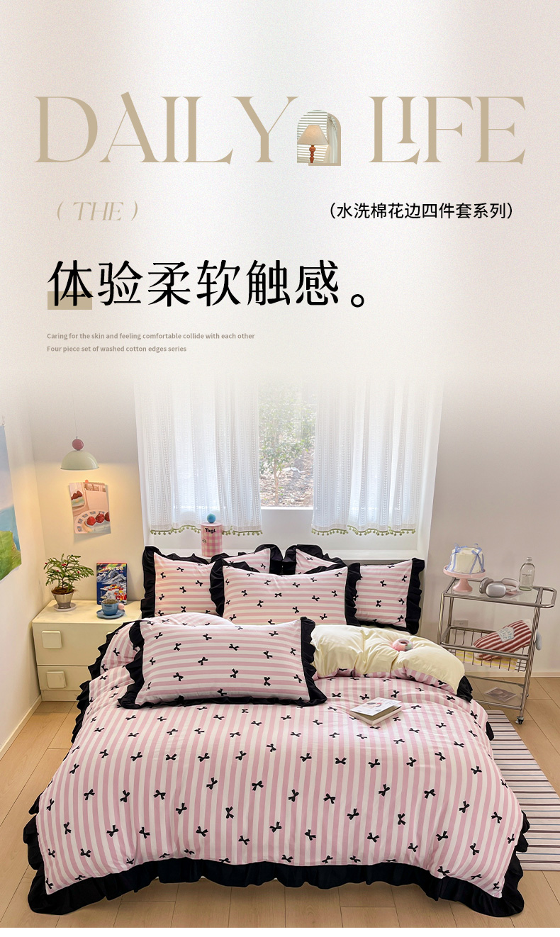 商品名称:2025水洗棉花边四件套_9067 蝴蝶结-条纹粉