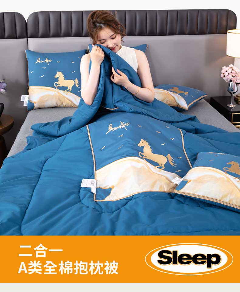 照世家纺 2025新款全棉A类马上成功抱枕被 孔雀蓝