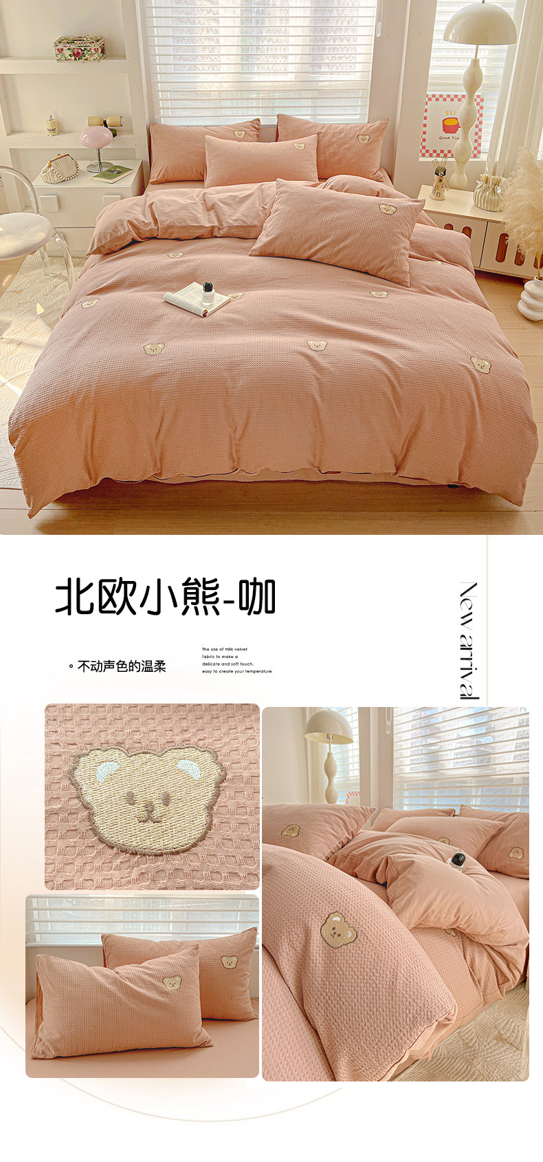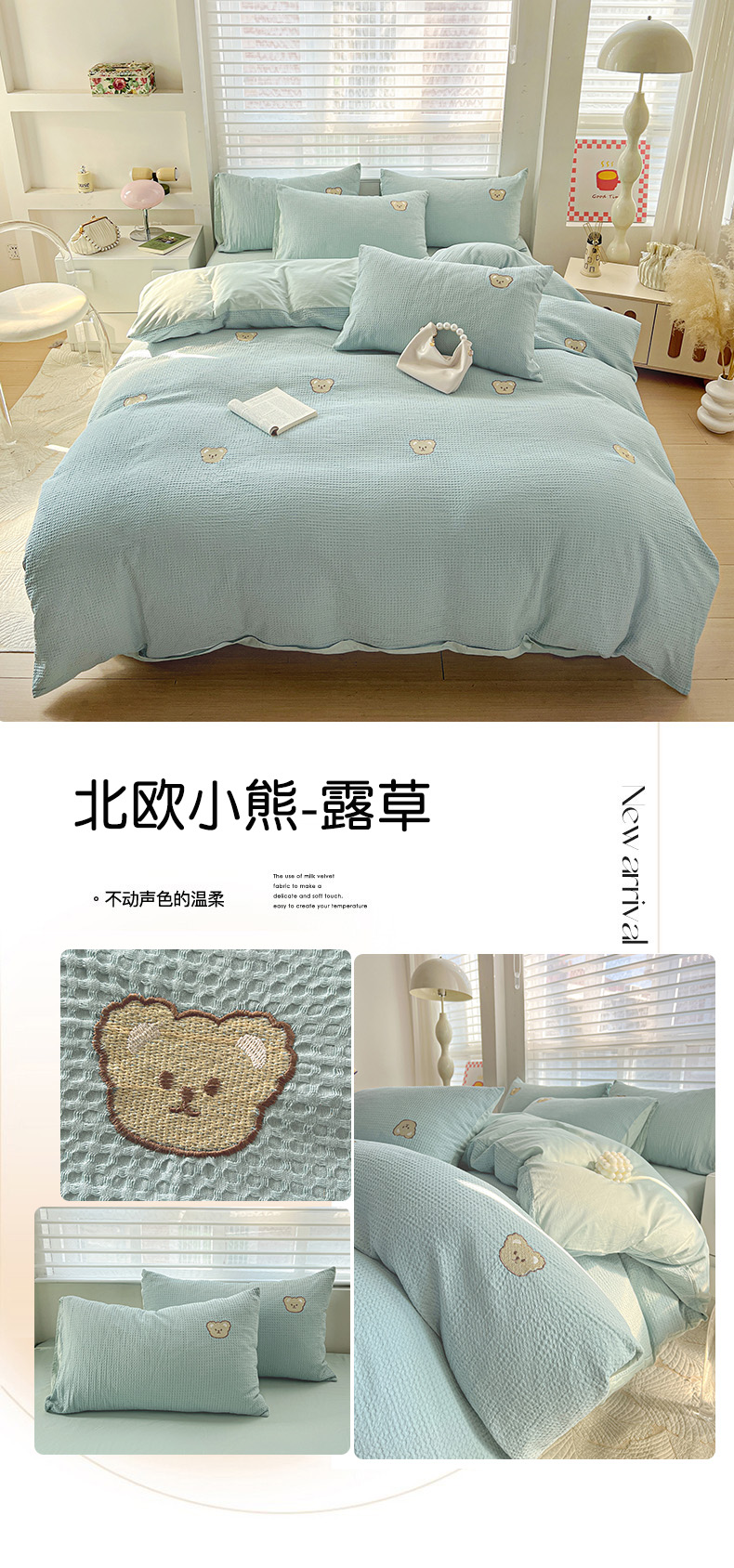 (总)静家居 2025新款全棉纯棉华夫格北欧小熊刺绣四件套系列-风格一