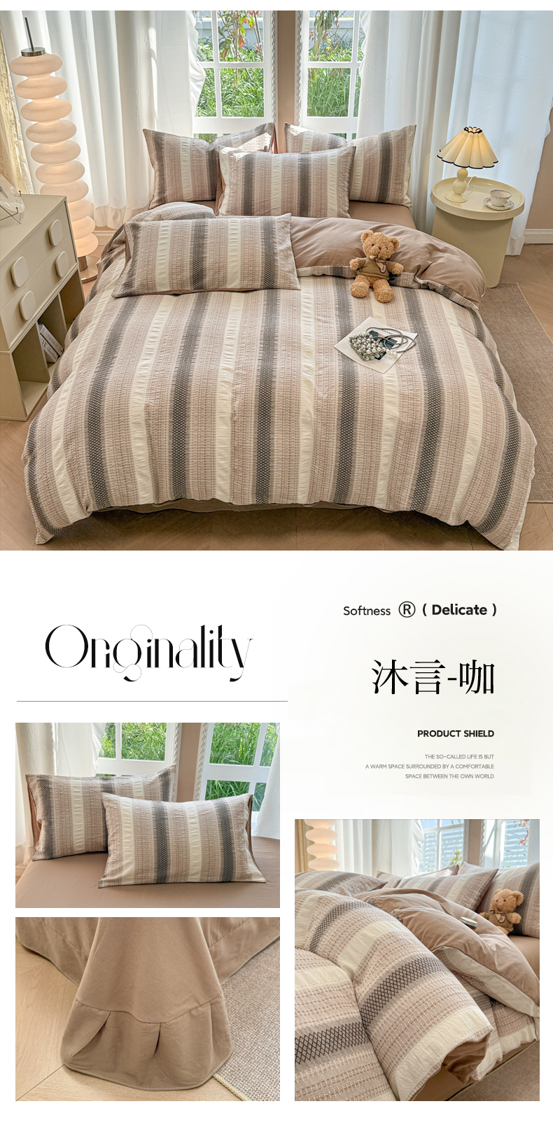 当前位置: 91家纺网 > 商品网购 > 床品套件 > 四件套 > 全棉普通四件套 > 米可2025春夏新款A类色织华夫格提花全棉四件套 沐言-咖