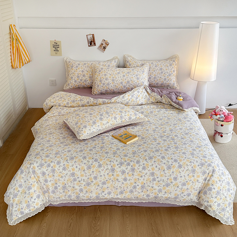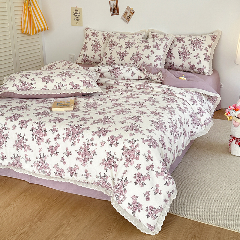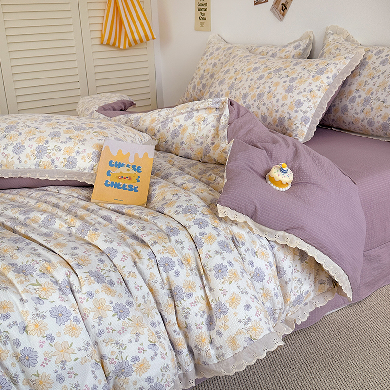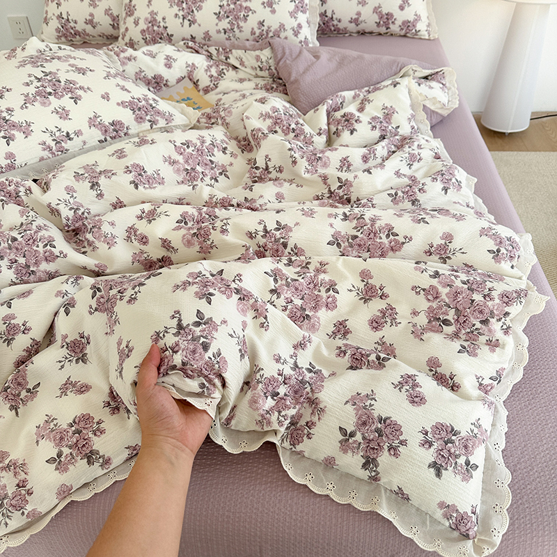商品名称:斯卡诺家纺 2025新款纯棉花边双层纱夏被四件套水洗棉夏被四件套 波点-紫