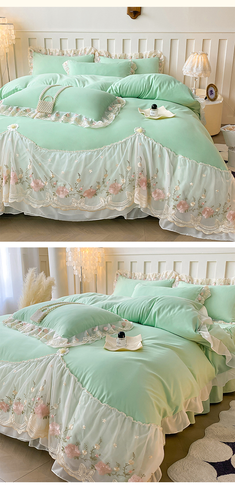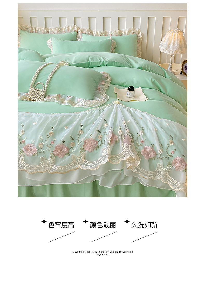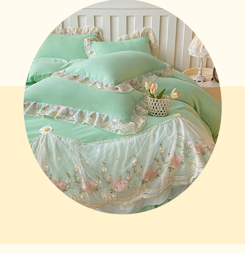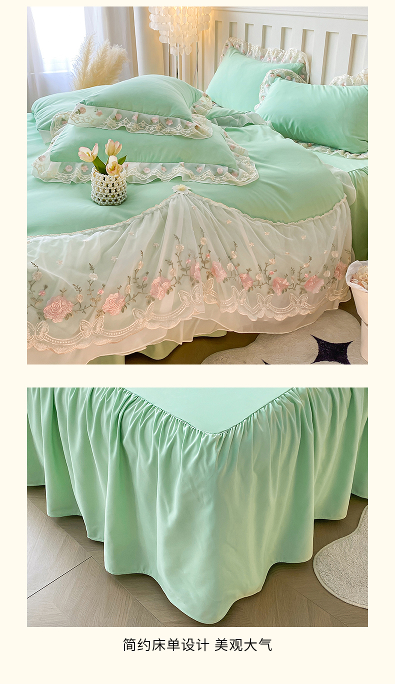 富宁2025新款水洗亲肤棉雪纺蕾丝刺绣床裙床笠三件套四件套 潘多拉-绿