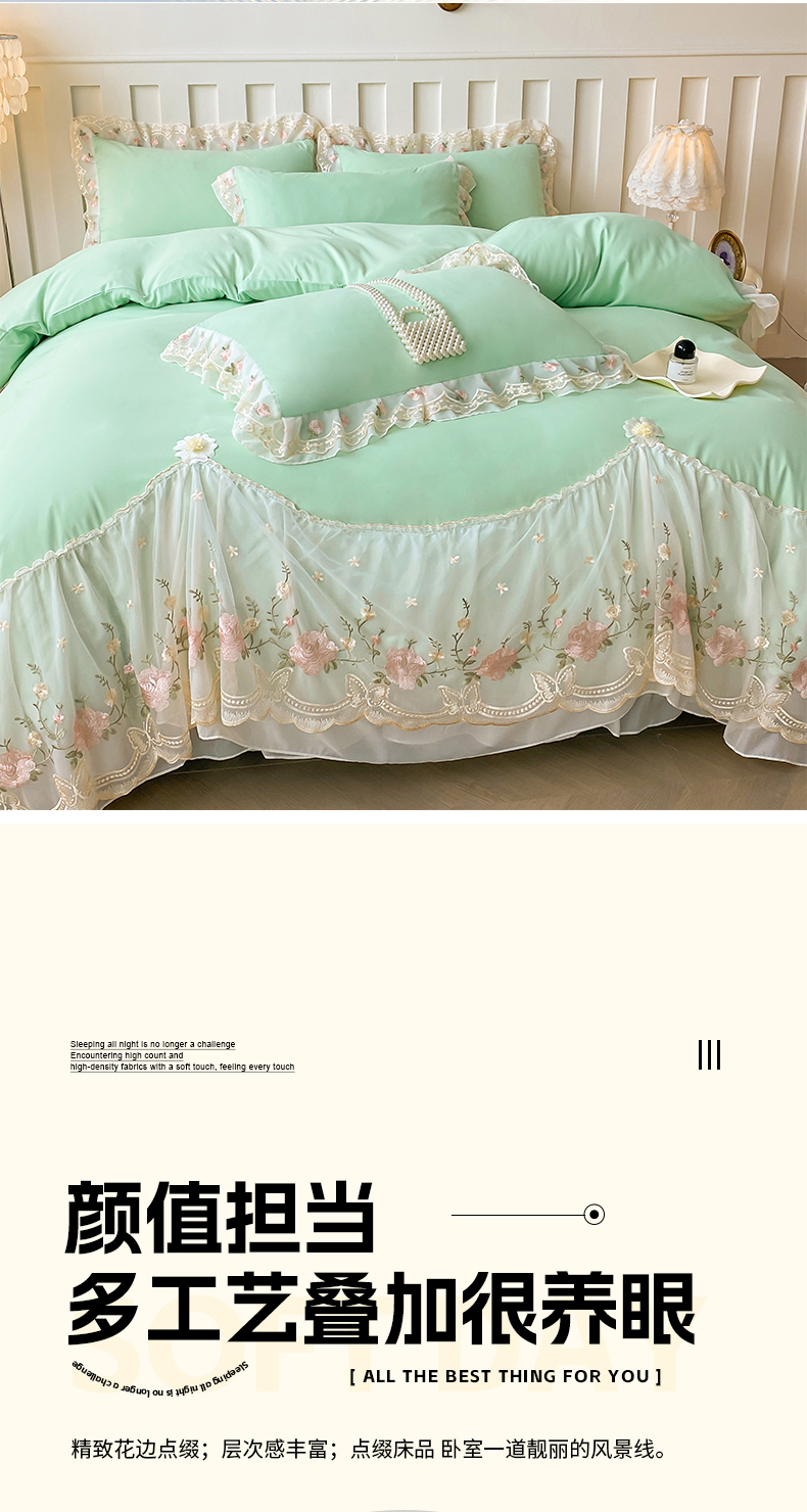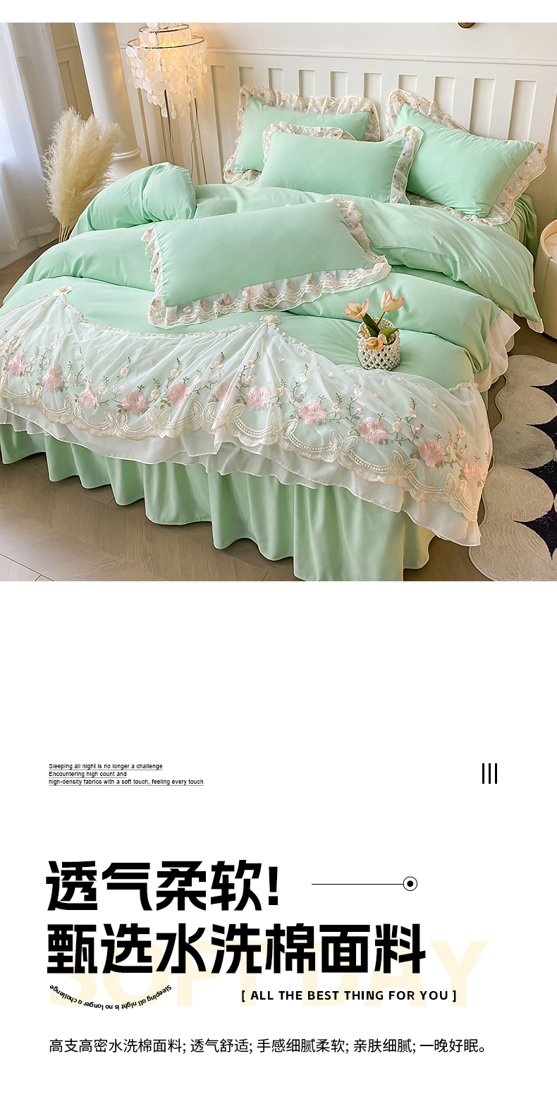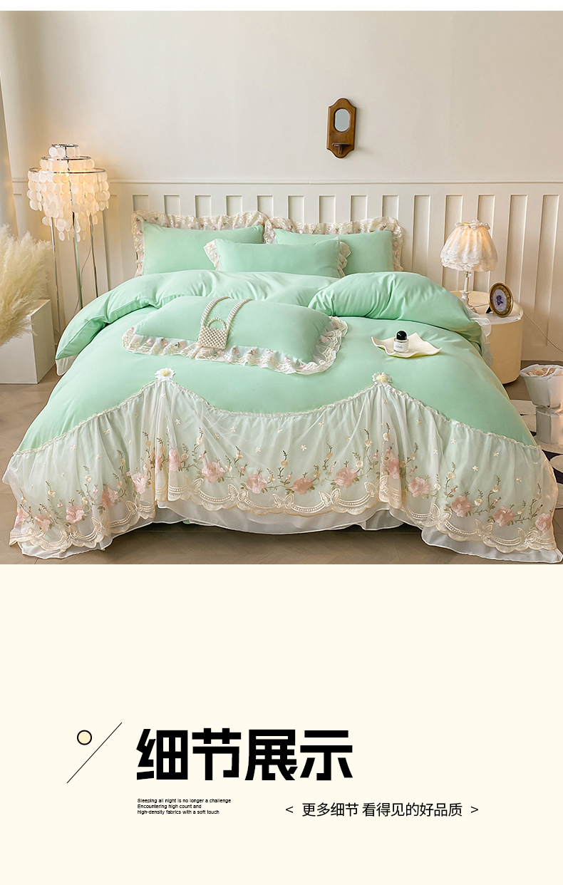• 91家纺网 家纺一手货源 找家纺 富宁2025新款水洗亲肤棉雪纺蕾丝刺绣床裙床笠三件套四件套 潘多拉-绿