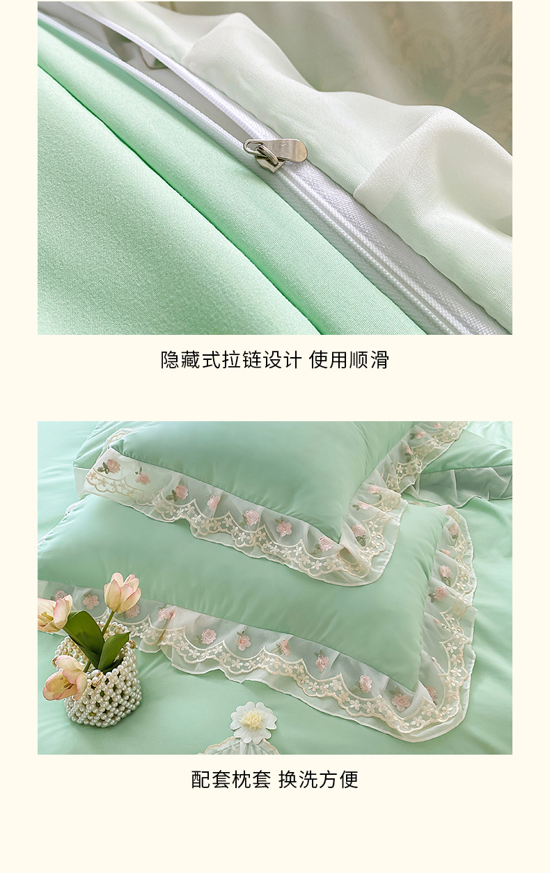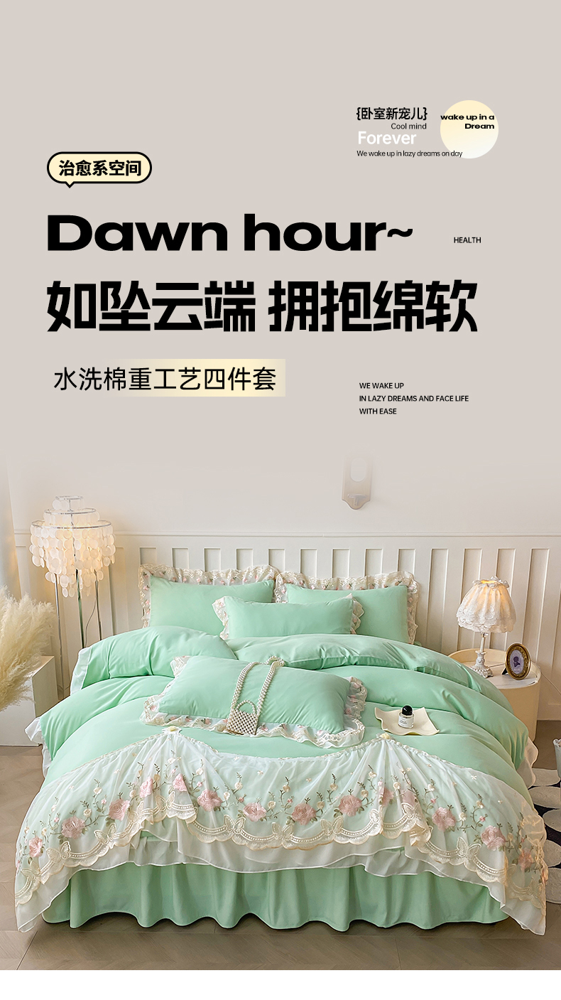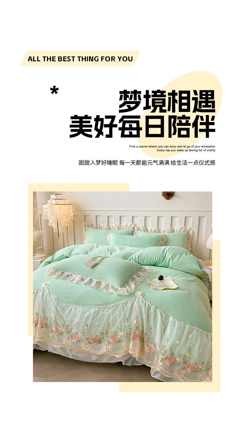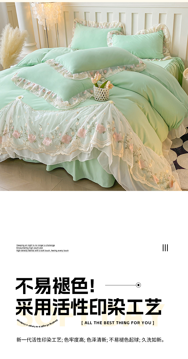 • 91家纺网 家纺一手货源 找家纺 富宁2025新款水洗亲肤棉雪纺蕾丝刺绣床裙床笠三件套四件套 潘多拉-绿