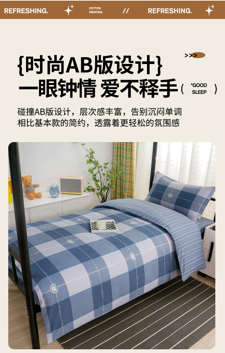 当前位置: 91家纺网 > 商品网购 > 床品套件 > 多件套 > 多件套 > 乐旗家纺 2025新款A类AB版全棉环保印花学生上下铺宿舍三件套六件套 伊利亚