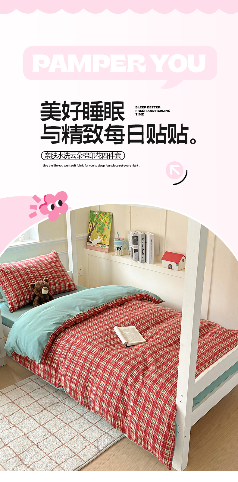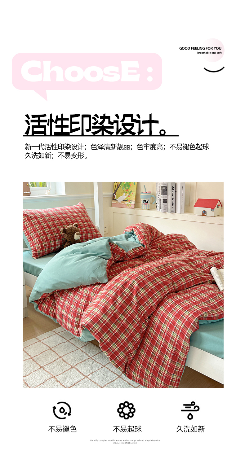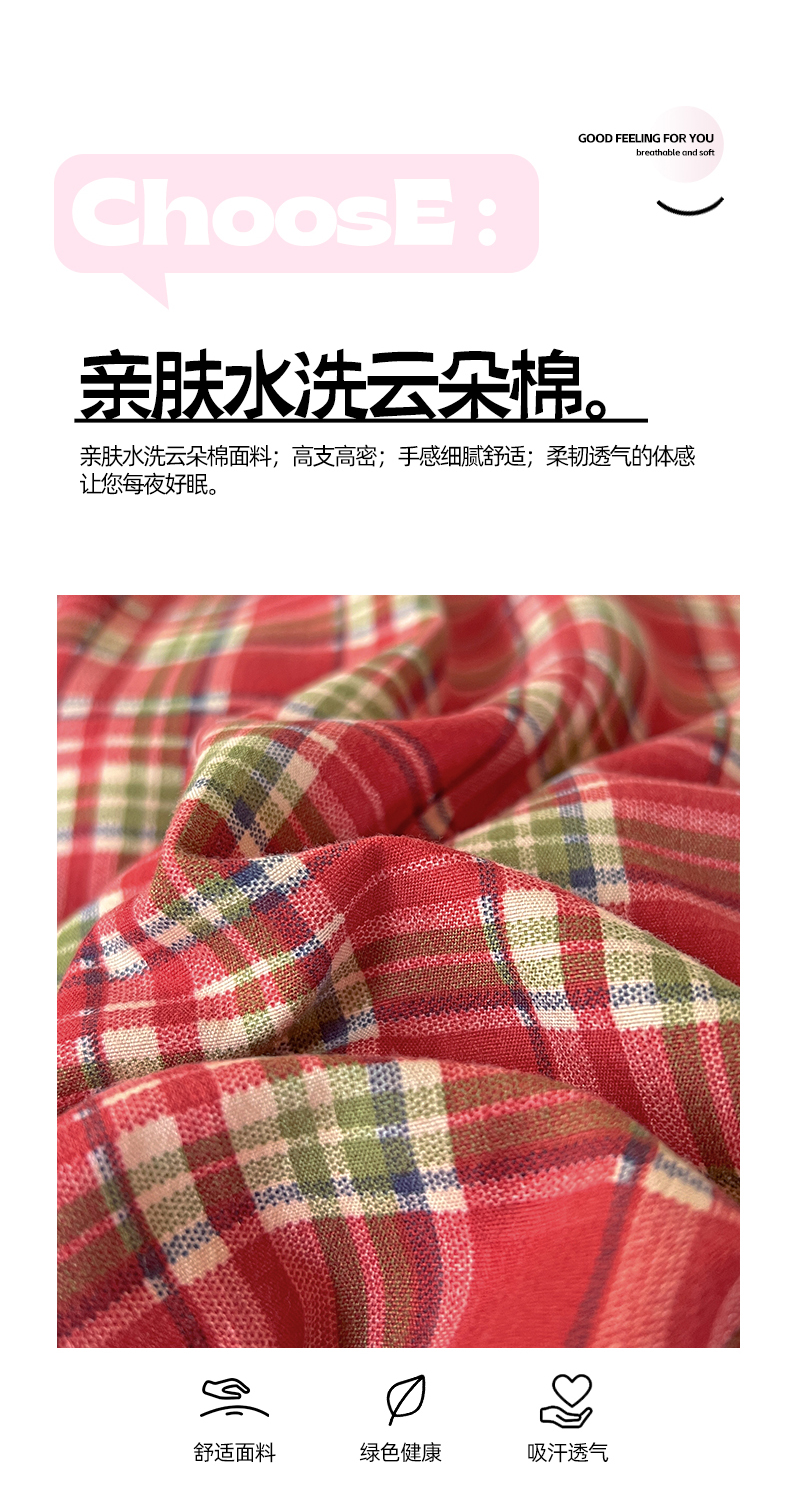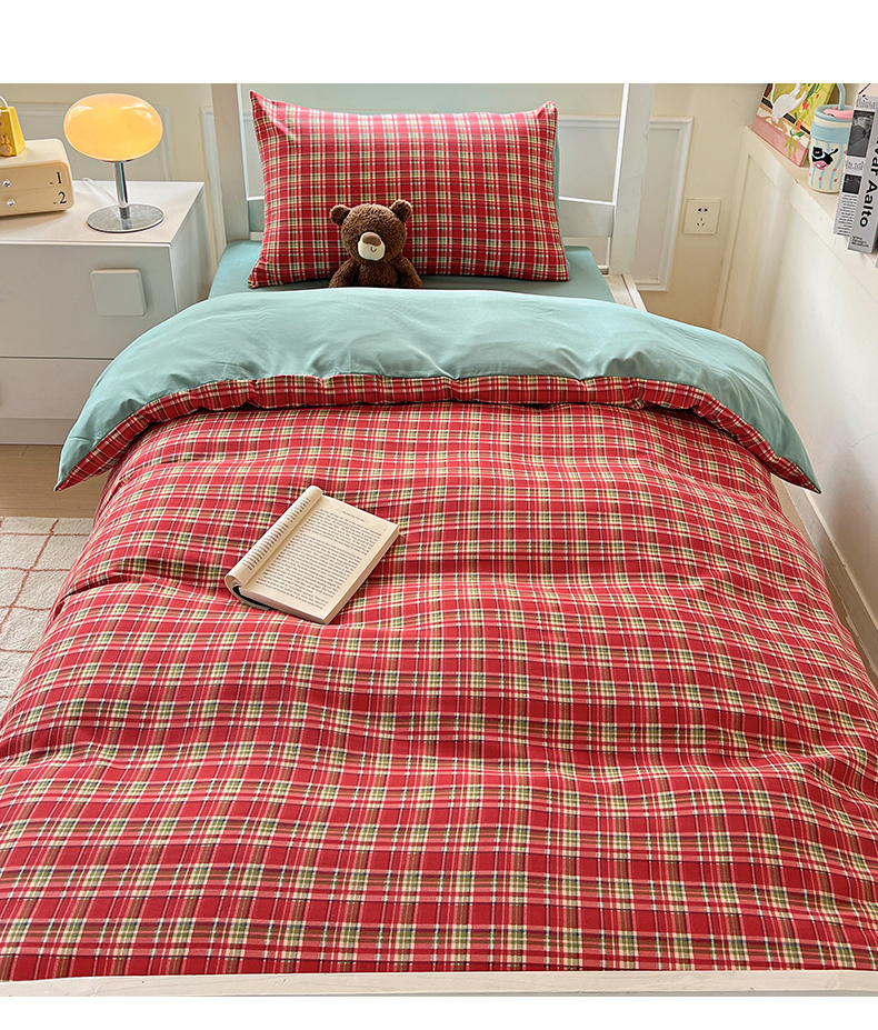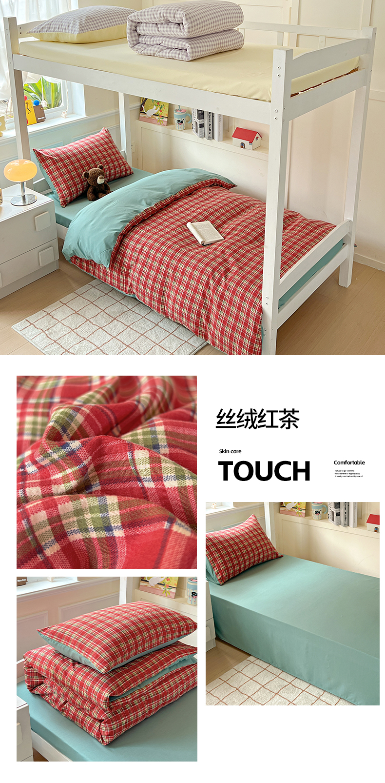 商品名称:妖妖家纺 2025新款软糯水洗棉格子学生三件套 丝绒红茶