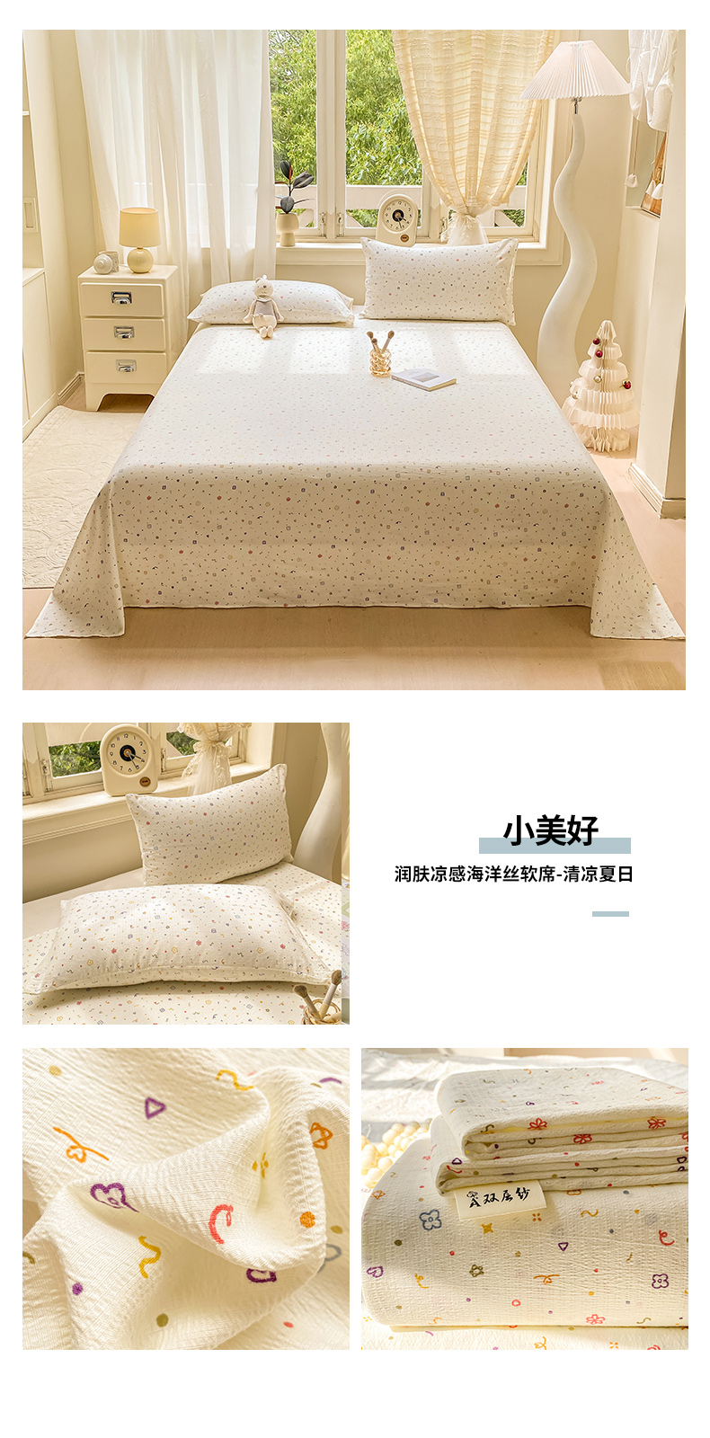 • 91家纺网 家纺一手货源 找家纺 眠势力 2025新款云感双层纱床单三件套ins奶油风学生宿舍床单四季通用 极简波点